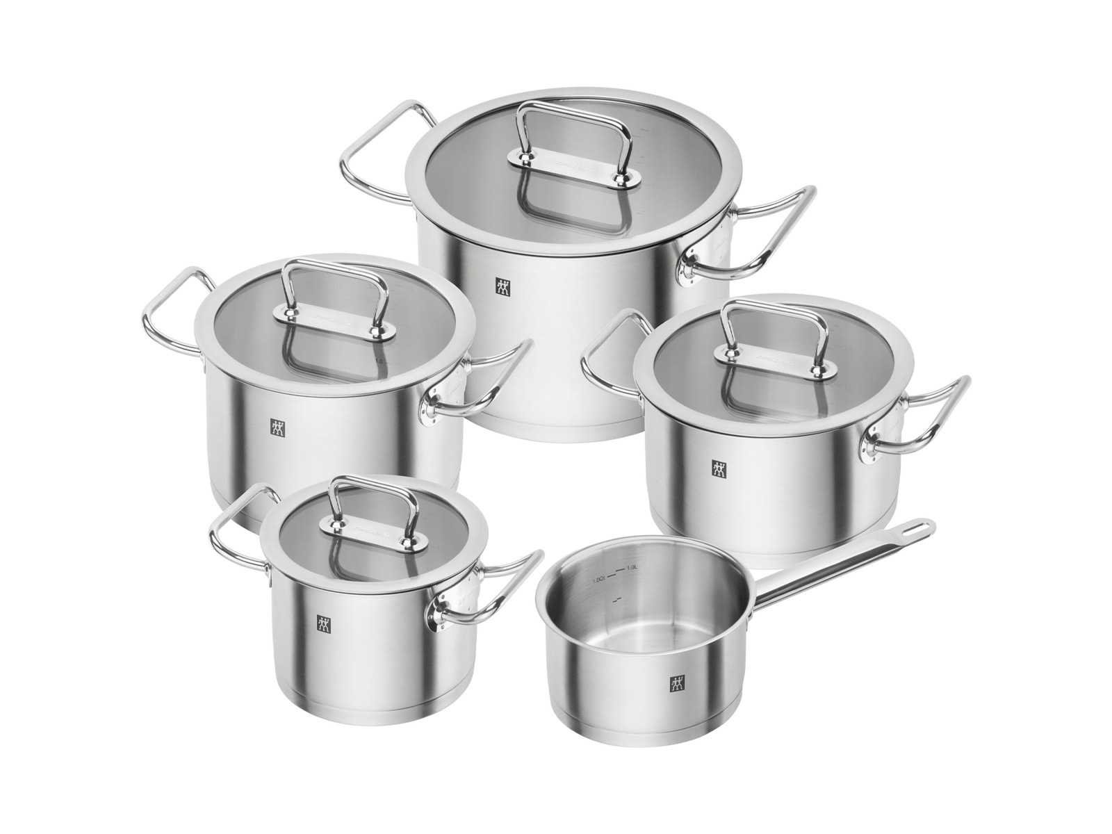 De set 5-delige kookgerei bestaat uit: 1 steelpan met handvat Ø 16 cm 1 Hoge steelpan Ø 20 cm 1 steelpan Ø 16 cm 1 steelpan Ø 20 cm 1 steelpan Ø 24 cm 5 deksels Kenmerken: SIGMA Classicle meerlaagse basisoven: maakt optimale warmteverdeling mogelijk, wat energiebesparing bevordert Stevige roestvrijstalen handgrepen: ze blijven lang koel voor een stevige grip Ook geschikt voor gebruik in de oven tot 200 °C Vaatwasserbestendig Non