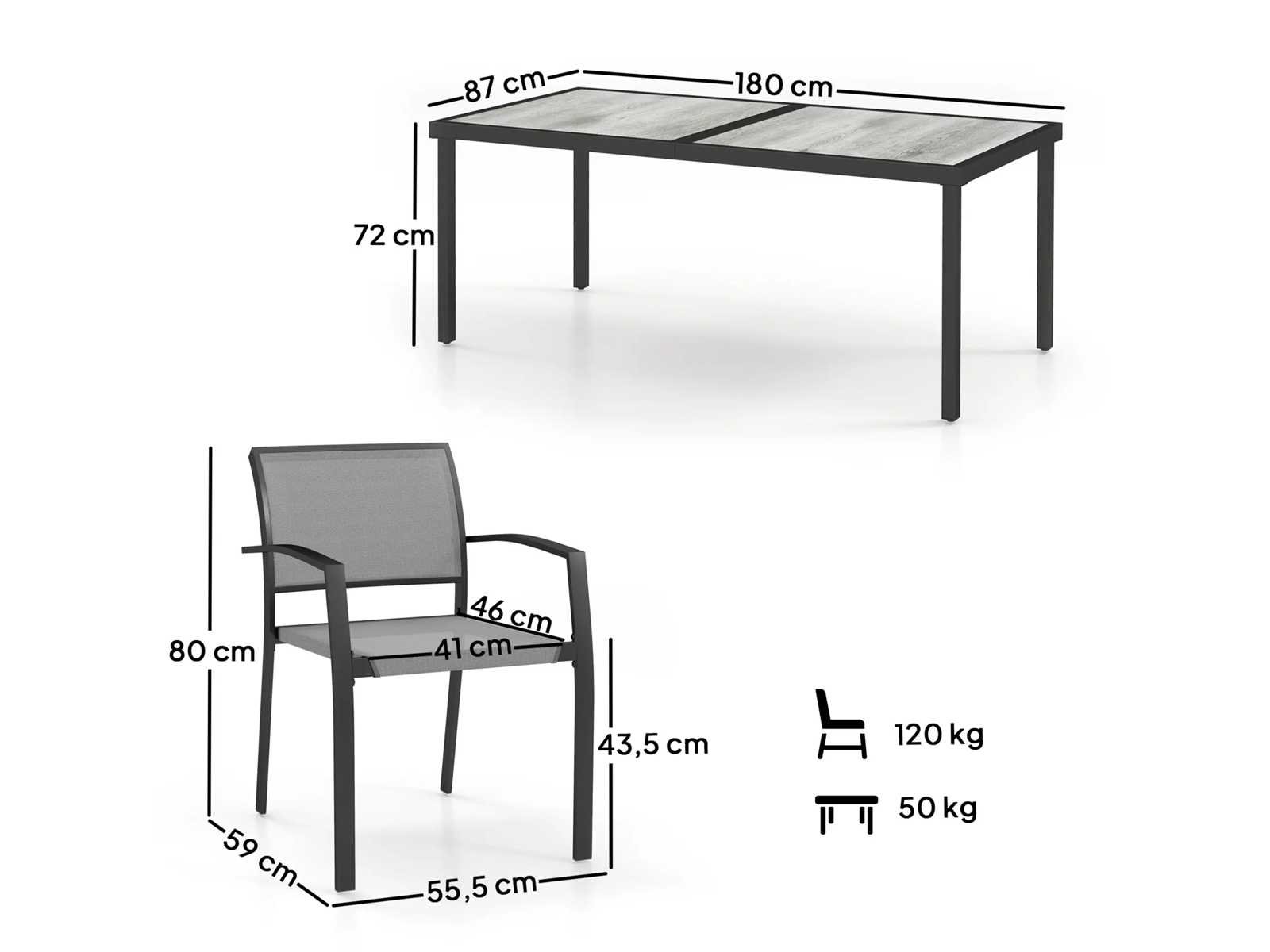 Technische gegevens: Kleur: Grijs Materiaal: Staal, Plastic, Polyester Tafel: 180L x 87B x 72H cm Maximale lading: 120 kg (stoel), 50 kg (tafel) Non