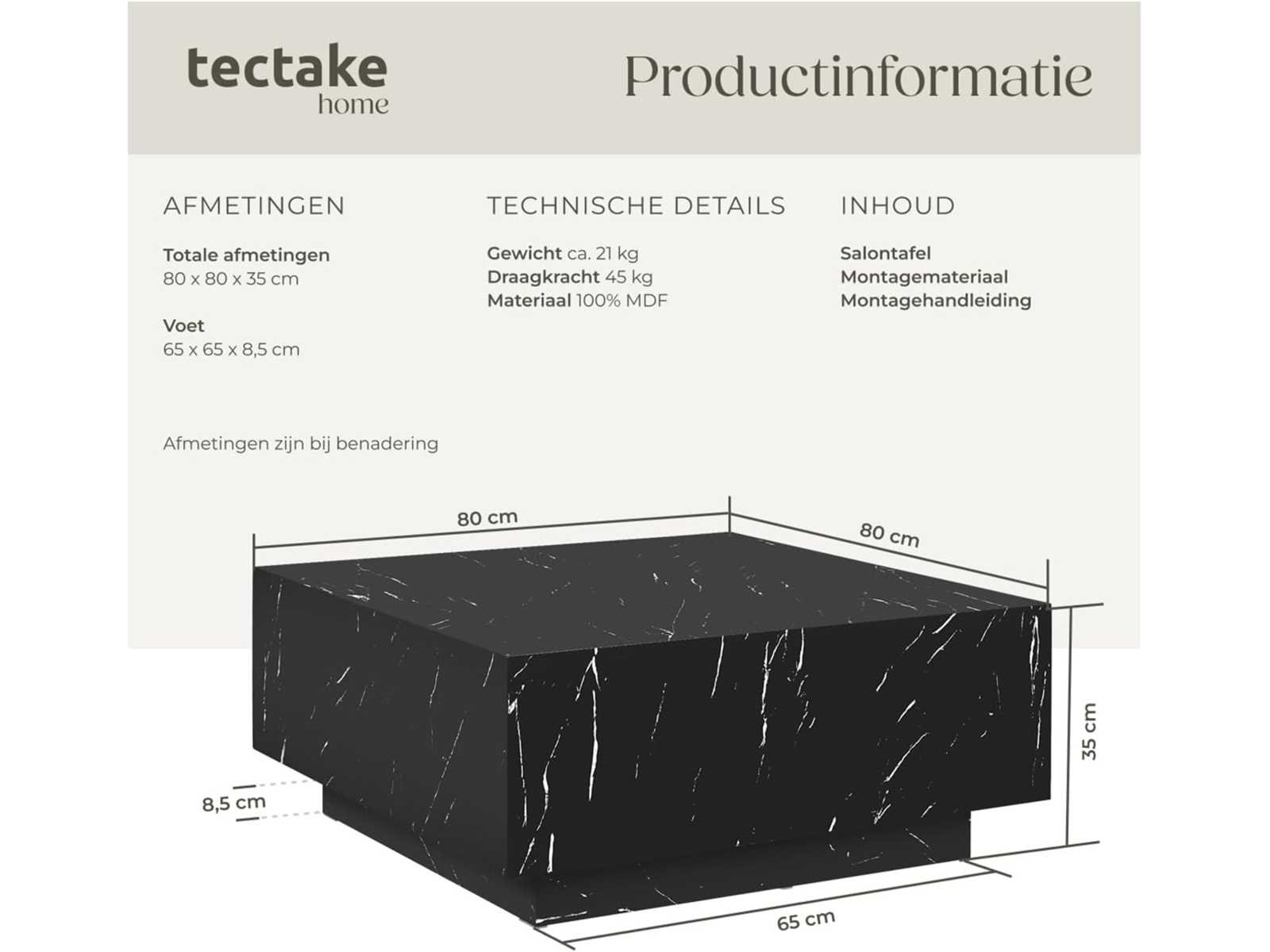 Technische gegevens: Totale afmetingen (B x D x H): ca. 80 x 80 x 35 cm / 31,1 x 3 Standaard (B x D x H): ongeveer 65 x 65 x 8,5 cm Laadcapaciteit: 45 kg. Geschatte gewicht: 21 kg Materiaal: 100% MDF Non