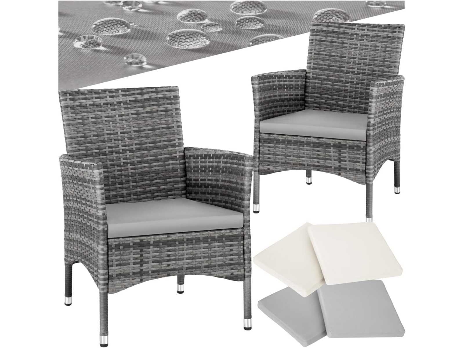 Technische kenmerken: Op stoel Totale afmetingen (BxDxH): ca. 59 x 57 x 85 cm Zitoppervlak (BxD): ongeveer 45 x 44 cm Kussendikte: ca. 5 cm Hoogte van armleuningen boven de vloer: ca. 64 cm Laadvermogen: 120 kg Gewicht: ongeveer 6 kg Materialen: poedergecoat staal, polyethyleen, 100% polyester Reikwijdte van levering: 2 rotan tuinstoelen 2 zitkussens 4 kussenhoezen Montagebeslag Assemblage-instructies Non