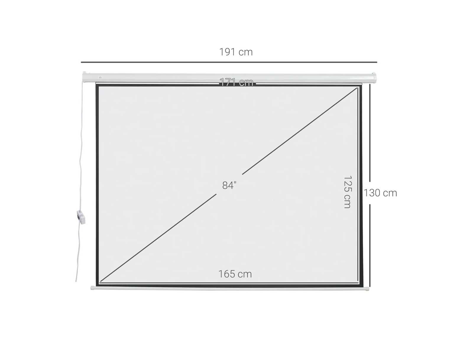 Specificaties: - Kleur: wit - Materialen: plastic, metaal -Zon. totaal: 191L x 8B x 130H cm -Zon. Scherm: 171B x 130H cm (84 inch) - Beeldverhouding: 4:3 - Intreksnelheid: 15 t/min - Zwarte randbreedte: 3 cm (links & rechts) - Kabellengte: 2,45 m - Afstandsbedieningsbatterij: 1 x 23A 12V batterij, inbegrepen - Ingang: 230V, 50Hz - Uitgang: 25W Non