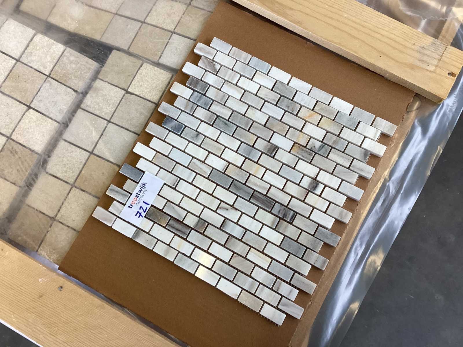 Nee Merk: Natuursteen Kleur: Grijs/Wit Mix Afwerking: Mat Getrommeld Lengte: 30cm Breedte: 30cm Materiaal: Marmer Dikte: 10mm Type: Mozaïektegel Model: Rechthoek 1,5x3 cm Aantal m² per verpakking: 1m² Aantal pakken: 9 Totaal oppervlakte: 9m² Totaal gewicht: 1800g