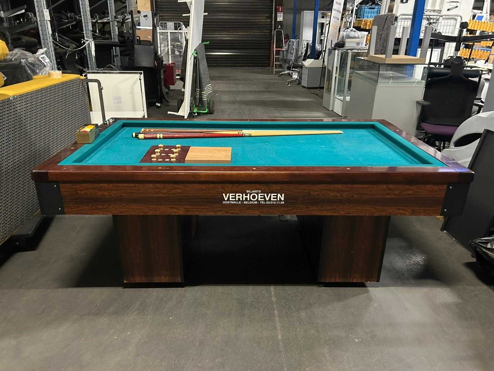 Algemene informatie Merk: Verhoeven Herkomst: Oostmalle, België Categorie: Sport & ontspanning / Horeca-inrichting Technische specificaties Speelveld: ca. 200 × 100 cm (standaard carambolemaat) Materiaal blad: Leisteen, bekleed met vilt (blauwgroen) Materiaal kast en poten: Houtfineer met donkere mahonie-look Poten: 2 massieve sokkelpoten Verwarming: Aanwezig Accessoires inbegrepen: 2 keus 1 set caramboleballen (rood, geel, wit met stip) Scorebord / telstenen Nee Merk: VERHOEVEN Kleur: Blauw / Donker hout Gewicht: 95 Lengte: 207 Breedte: 116 Hoogte: 78 Materiaal: Hout