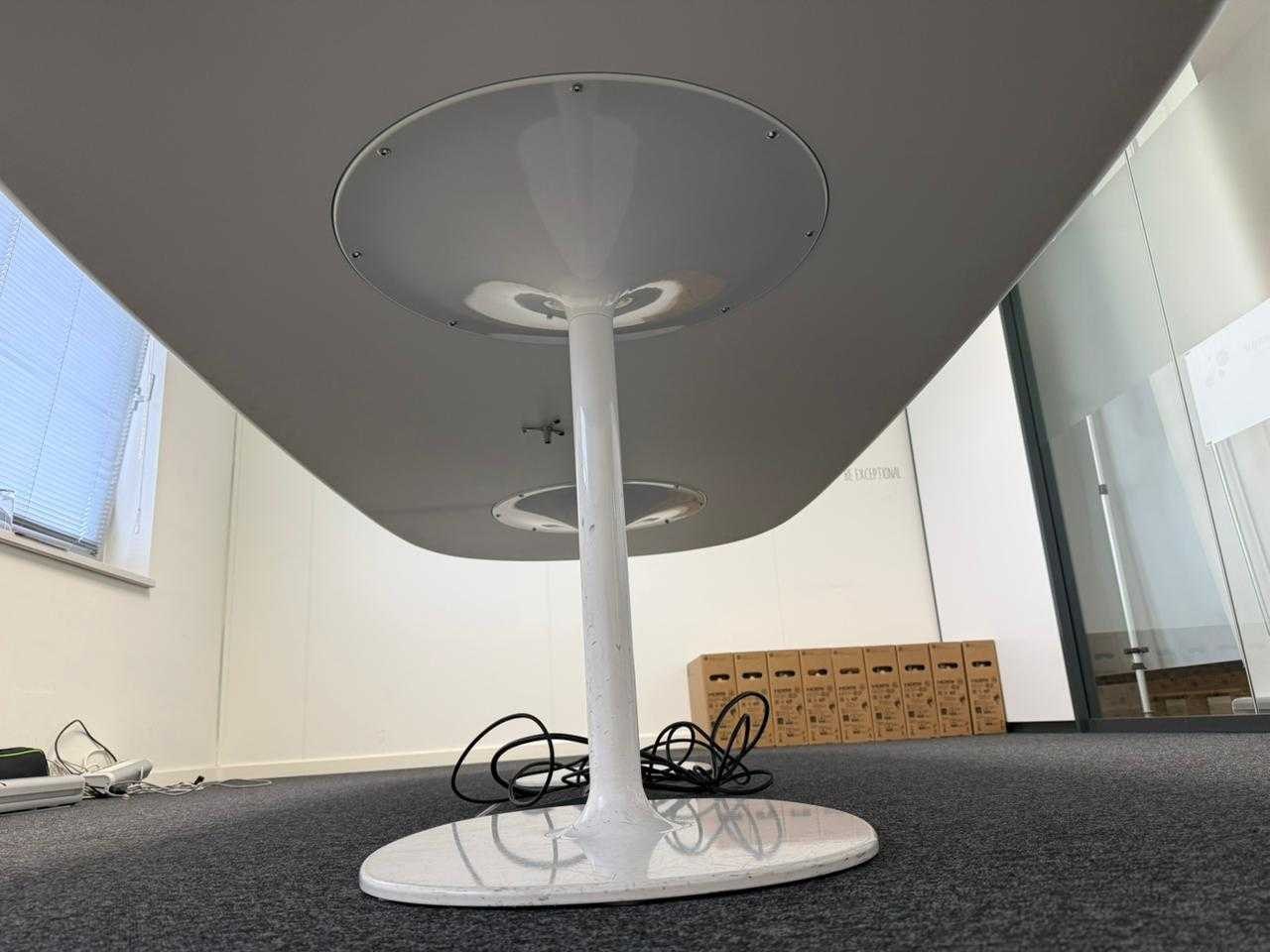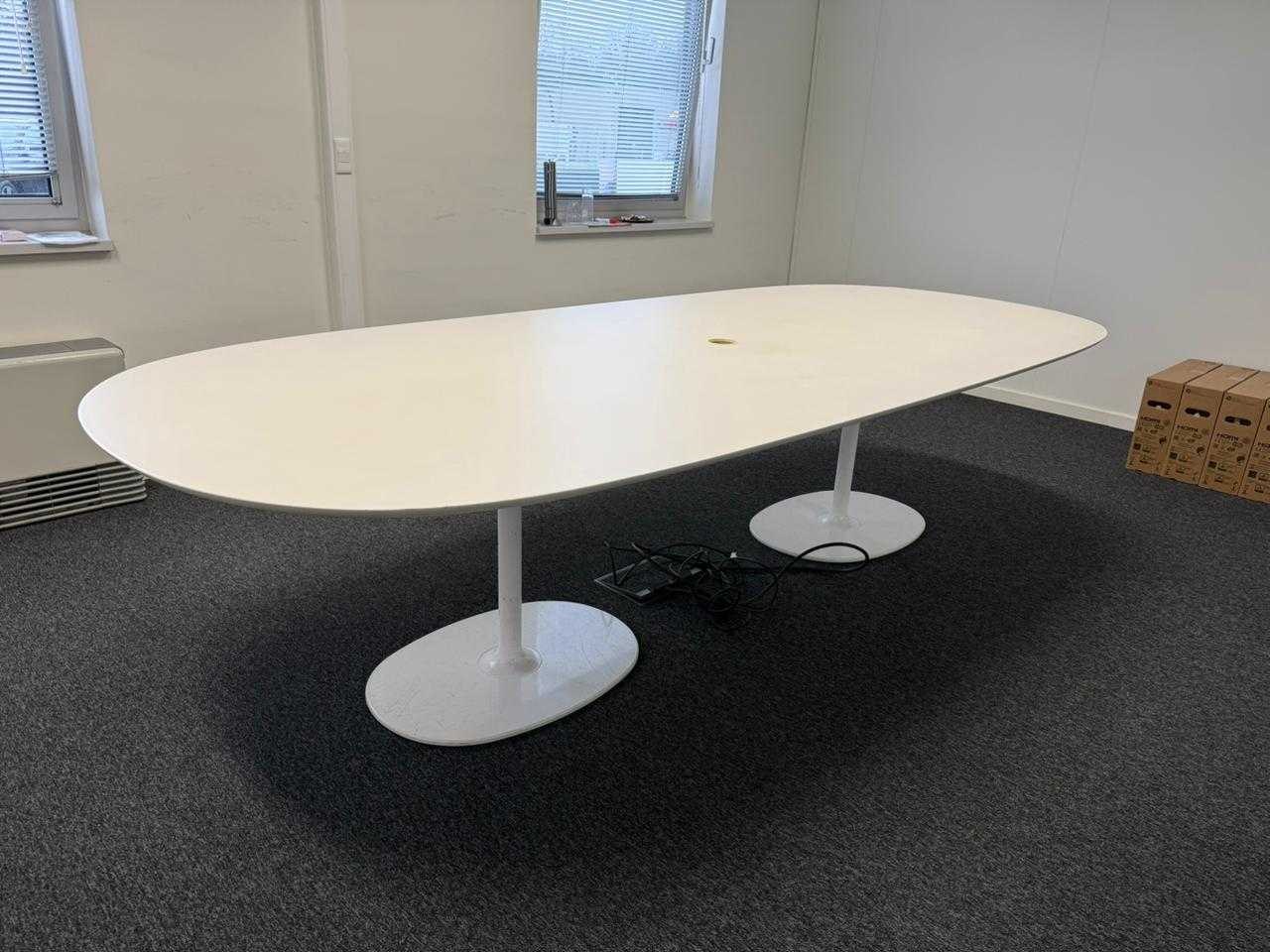 Ovale vergadertafel in witte kunststof met dubbele centrale poot met vloerplaat. Enkele gebruikssporen aanwezig. Nee Kleur: Wit Lengte: 300cm Breedte: 130cm Hoogte: 73cm Materiaal: Kunststof