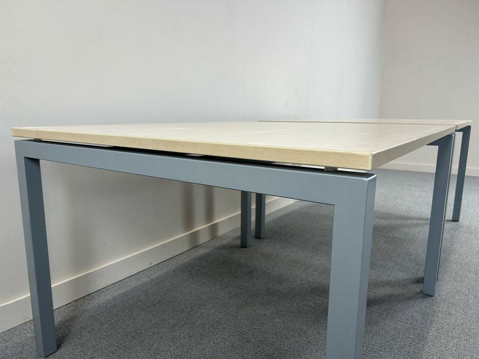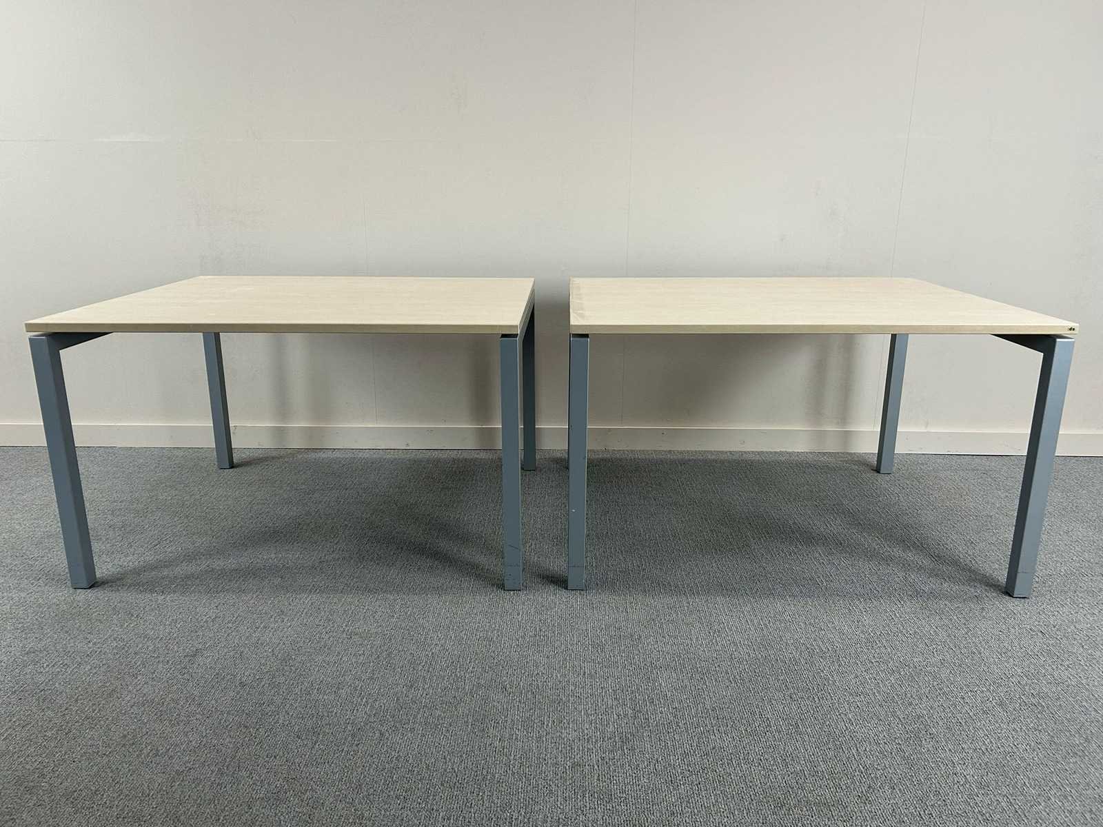 Een set van 2 tafels met metalen vierpoot, blad in licht hout. Lichte gebruikssporen, kan variëren per item. No Type: Tafel Kleur: Creme Gewicht: 25kg Lengte: 100cm Breedte: 120cm Hoogte: 70cm