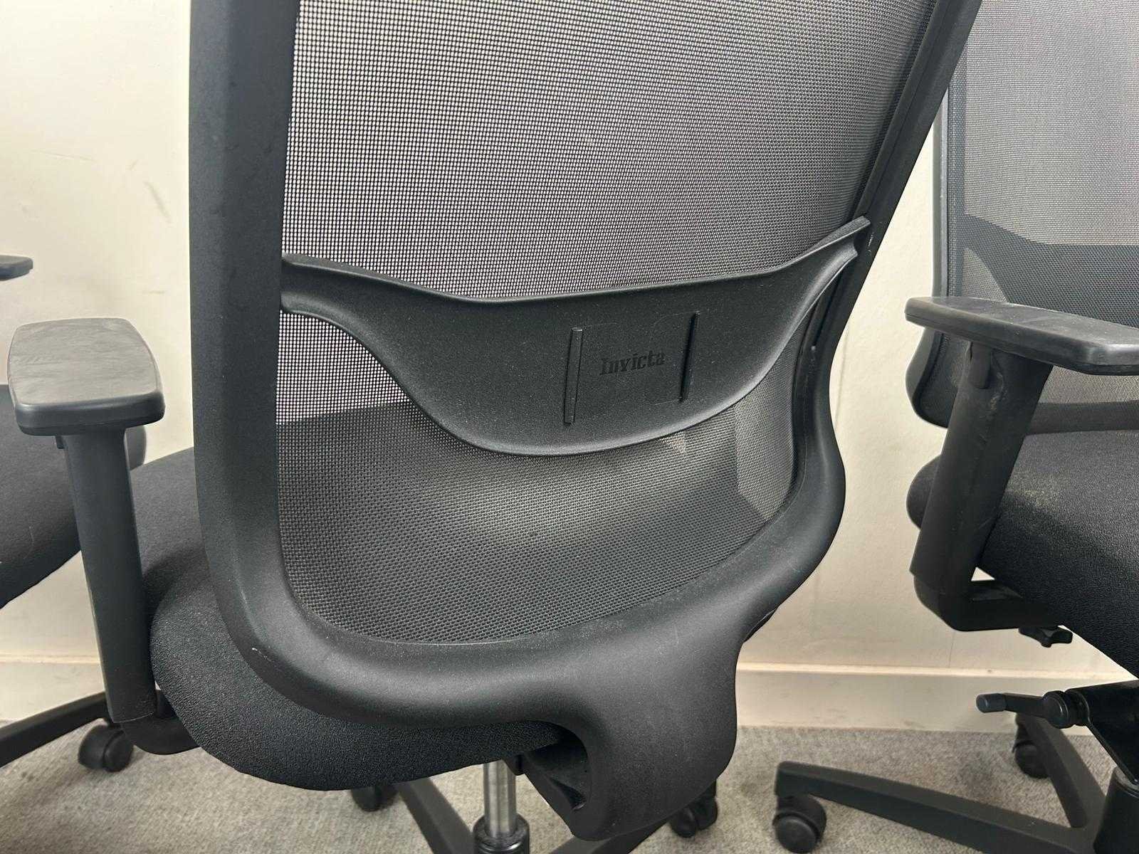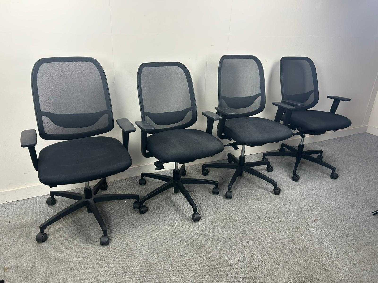 Kavel van 4 Invicta bureaustoelen in het zwart met mesh rugleuning. Handmatig instelbare armleuningen en zithoogtes, mechanismeschade mogelijk. Staat en schade kan variëren per item in de set. Nee Merk: INVICTA Kleur: Zwart Gewicht: 200kg Materiaal: Stof