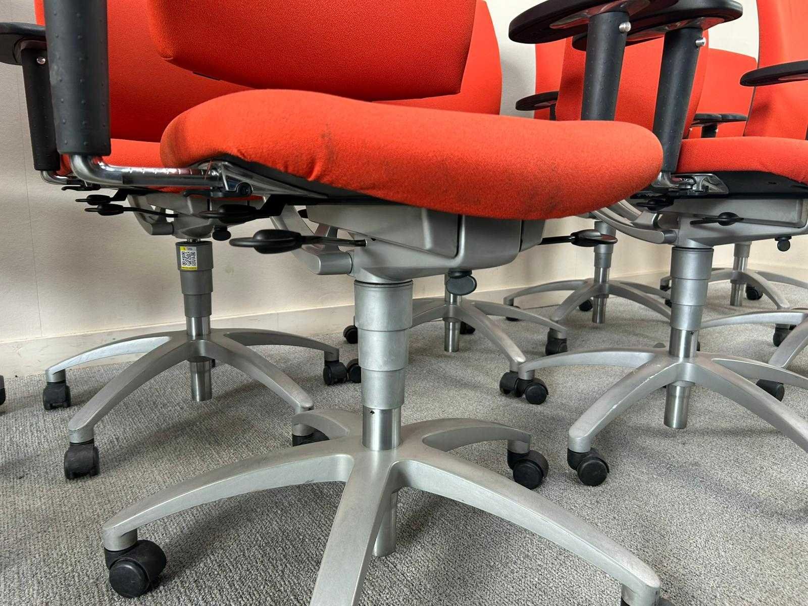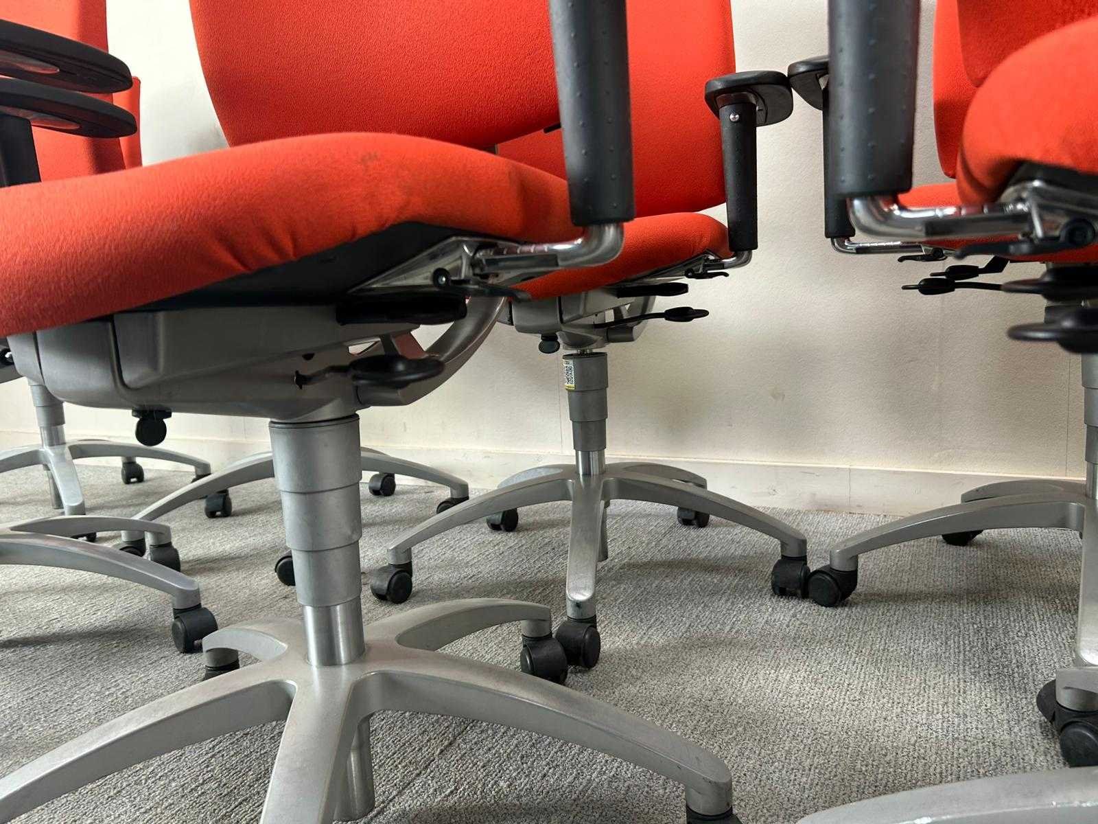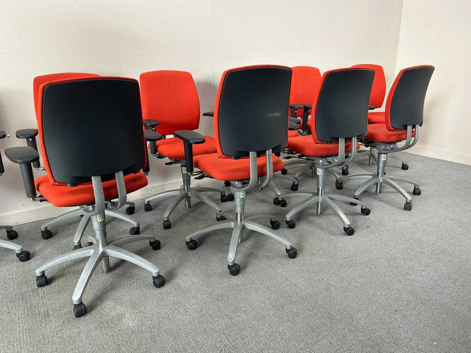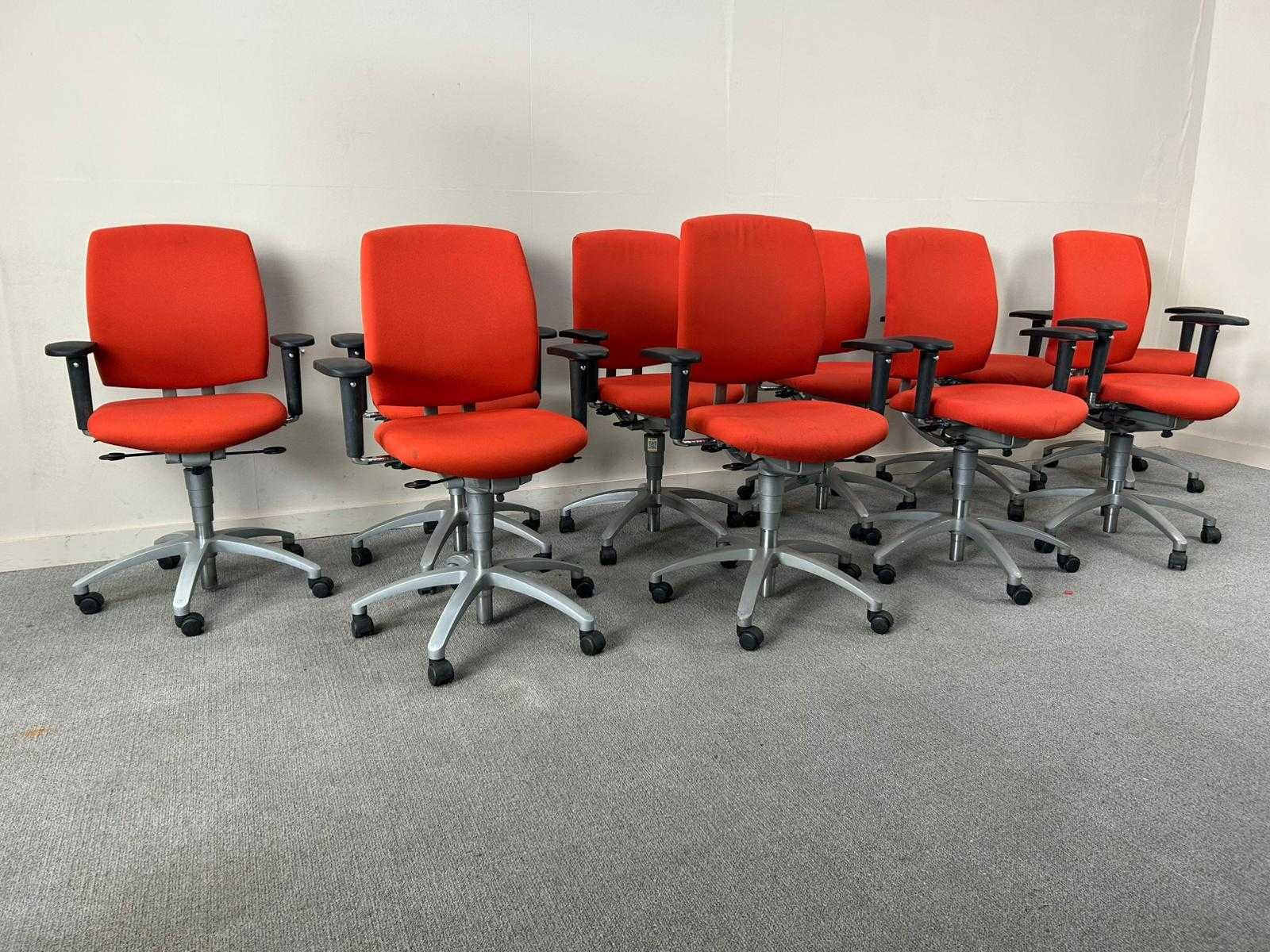 Set van 10 Drabert bureastoelen in het rood op metalen voetkruis met wielen. Verstelbare zithoogte en armleuningingen, Staat kan variëren per item. Nee Merk: DRABERT Type: Entrada Kleur: Rood Gewicht: 90kg