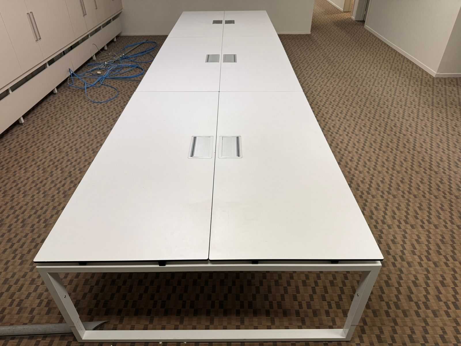 6-persoons workbench in het wit met ruime werkoppervlakte (600x160), verdeeld in 6, met individuele kabeldoorvoeren voor optimale werkruimte. Nee Product type: 6p-Workbench Kleur: Wit Gewicht: 120kg Lengte: 400cm Breedte: 160cm Hoogte: 62-85cm Materiaal: Melamine