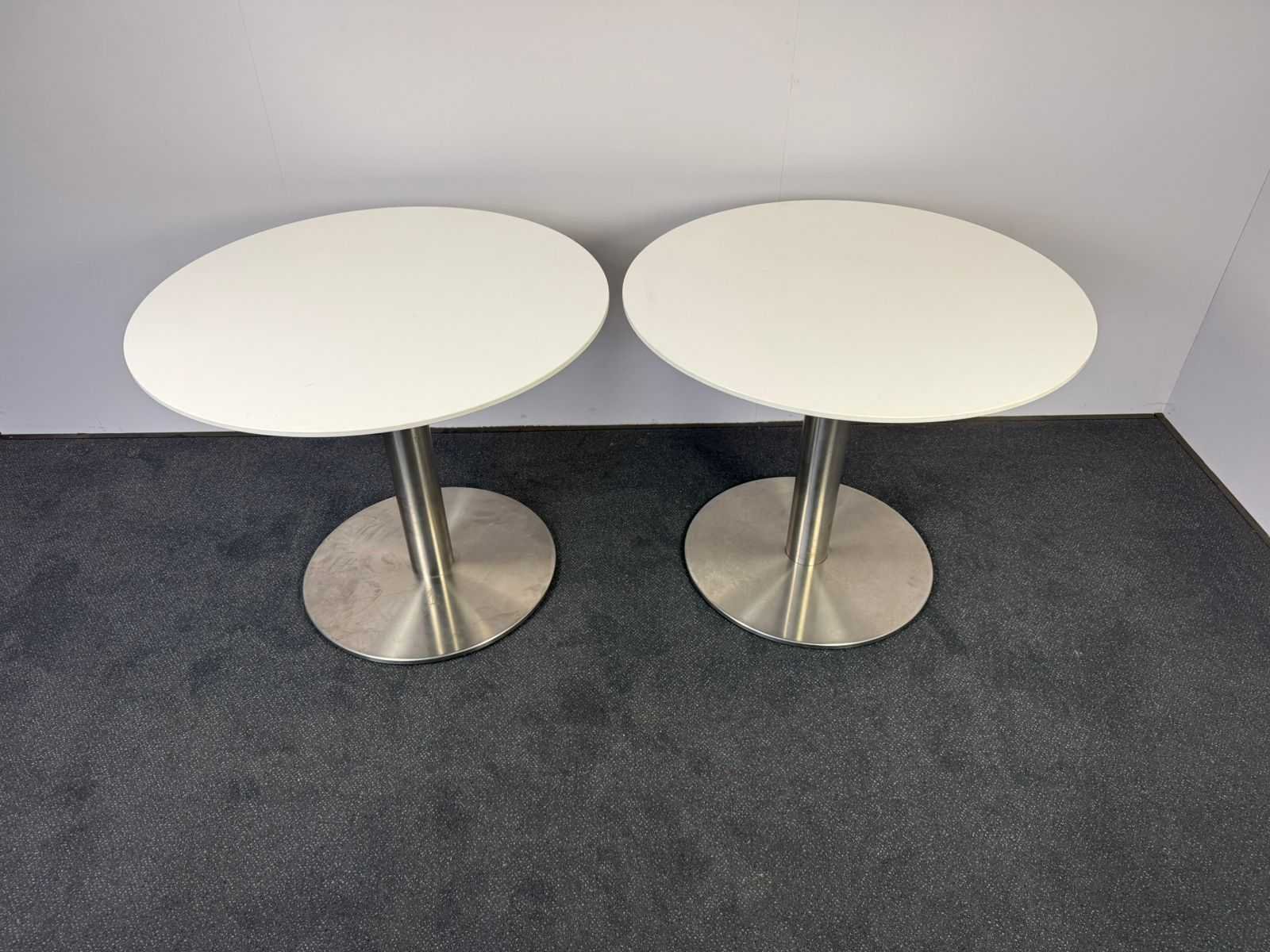 Duo van witte ronde tafels (Diameter 90cm) op centrale metalen poot met ronde vloerplaat. Nee Type: Ronde tafel Kleur: Wit Gewicht: 50kg Lengte: 90cm Breedte: 90cm Hoogte: 74cm Materiaal: Melamine