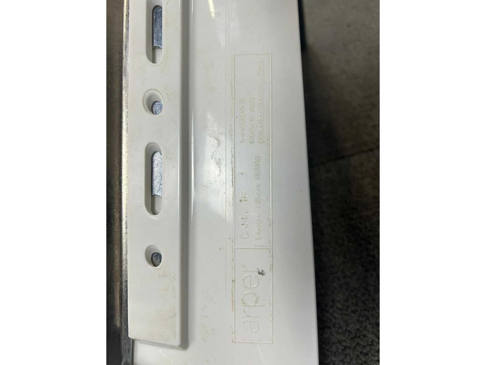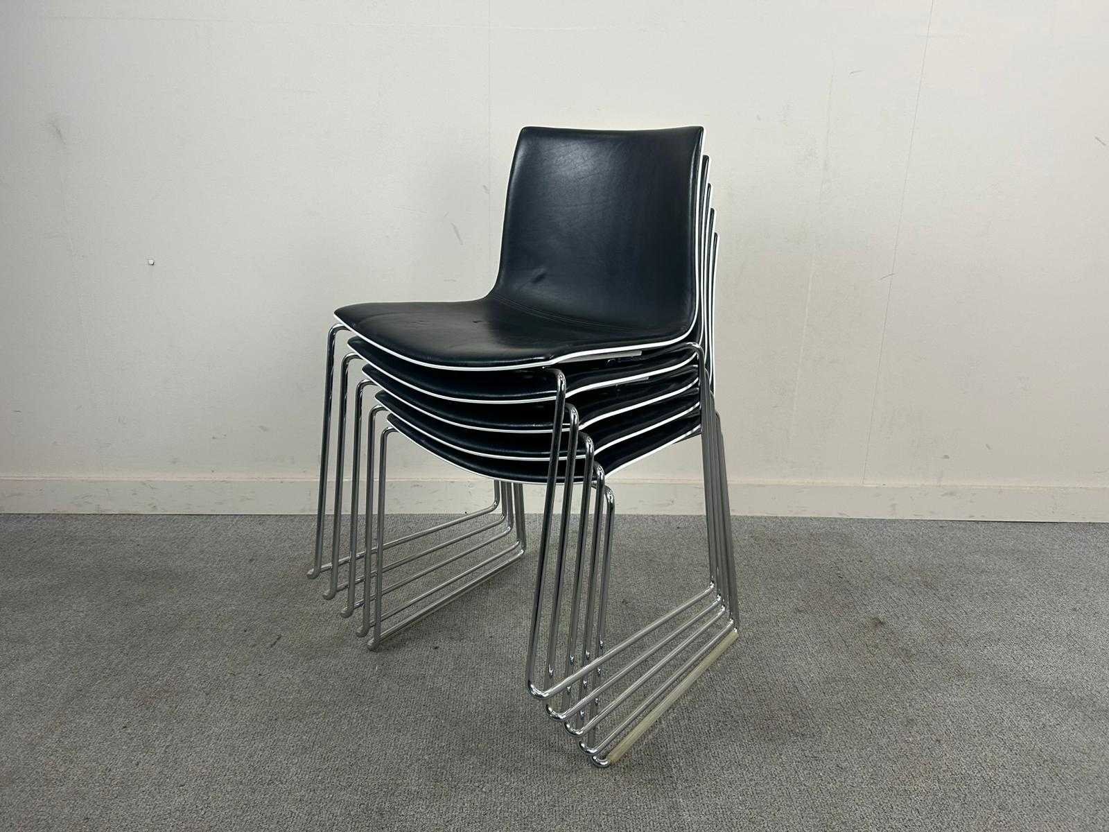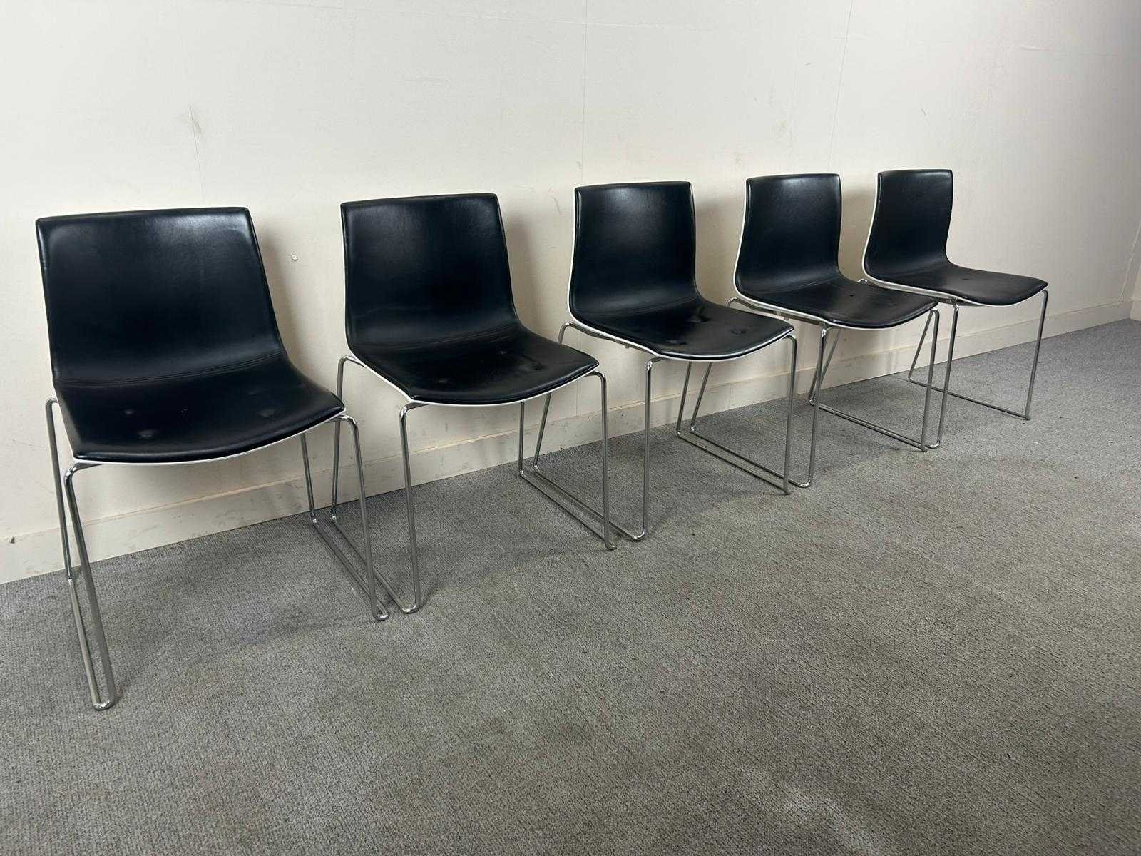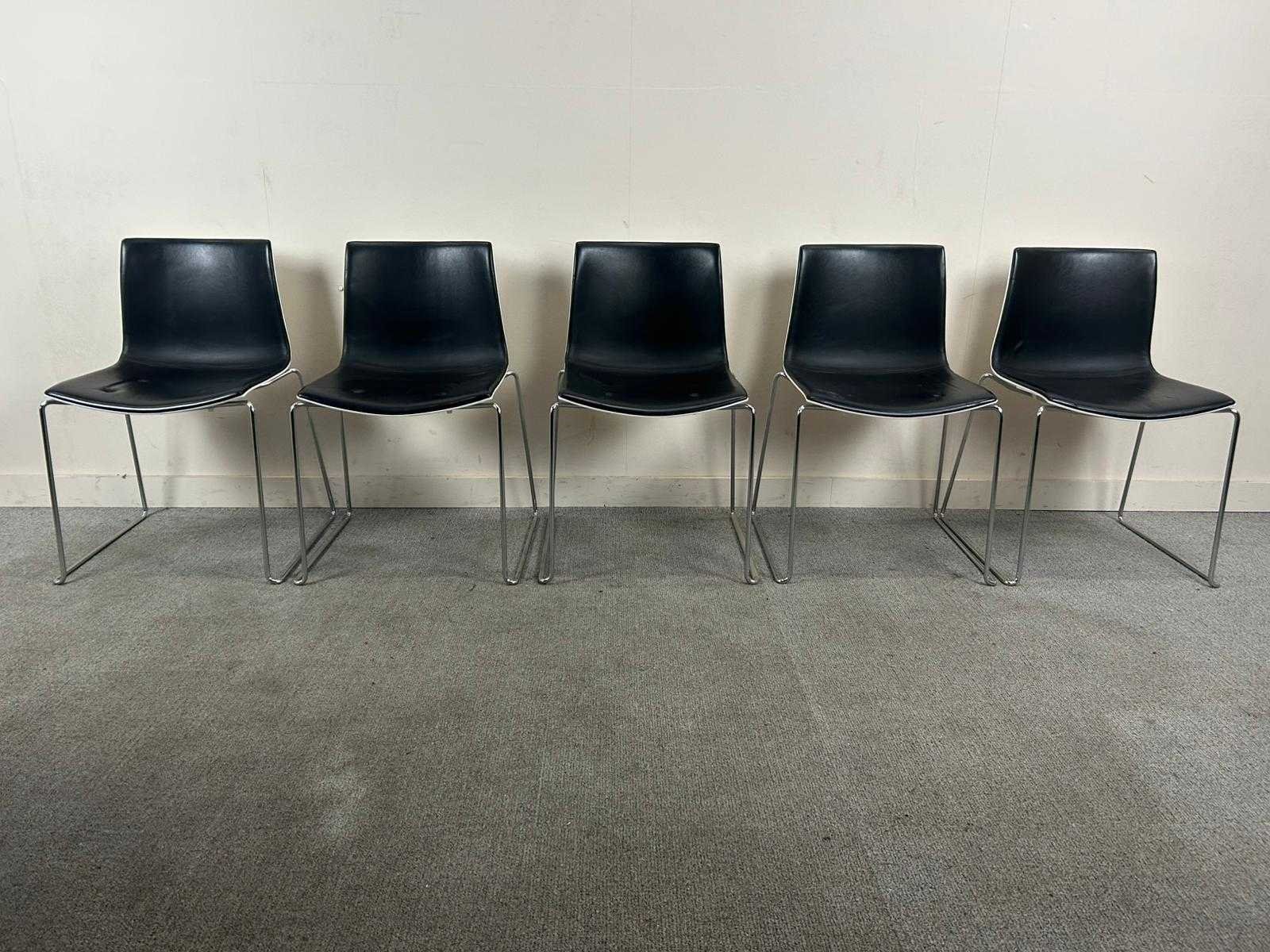 Set van 5 Arper catifa stapelbare kantinestoelen in zwarte leder met witte accenten op een verchroomde sledepoot. Met gebruikssporen, staat kan variëren per item. Mogelijke deuken op zitoppervlakken. Nee Merk: ARPER Model: Catifa Product type: Kantinestoel Stapelbaar: true Kleur: Zwart Gewicht: 45kg Materiaal: Leder