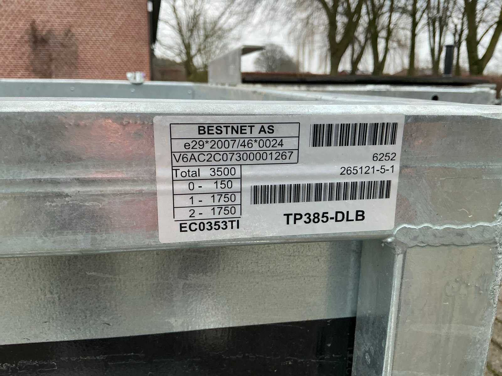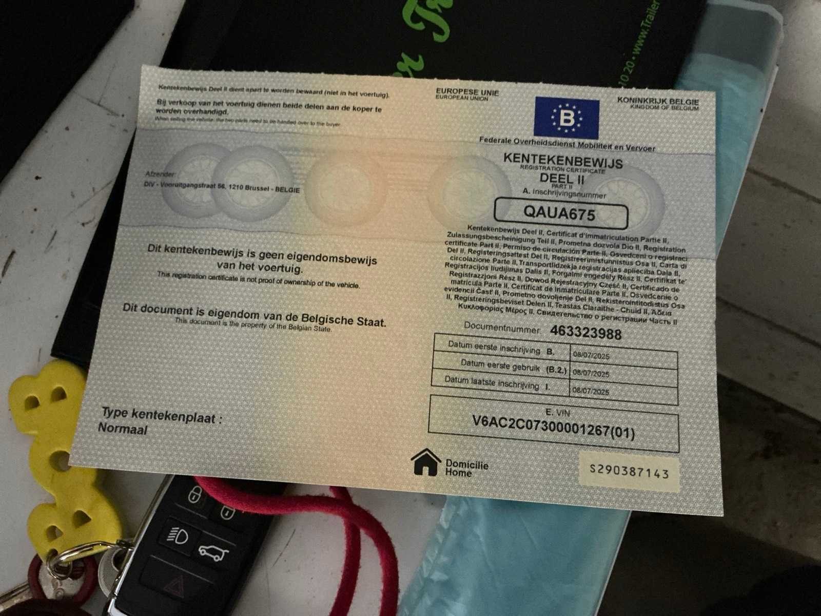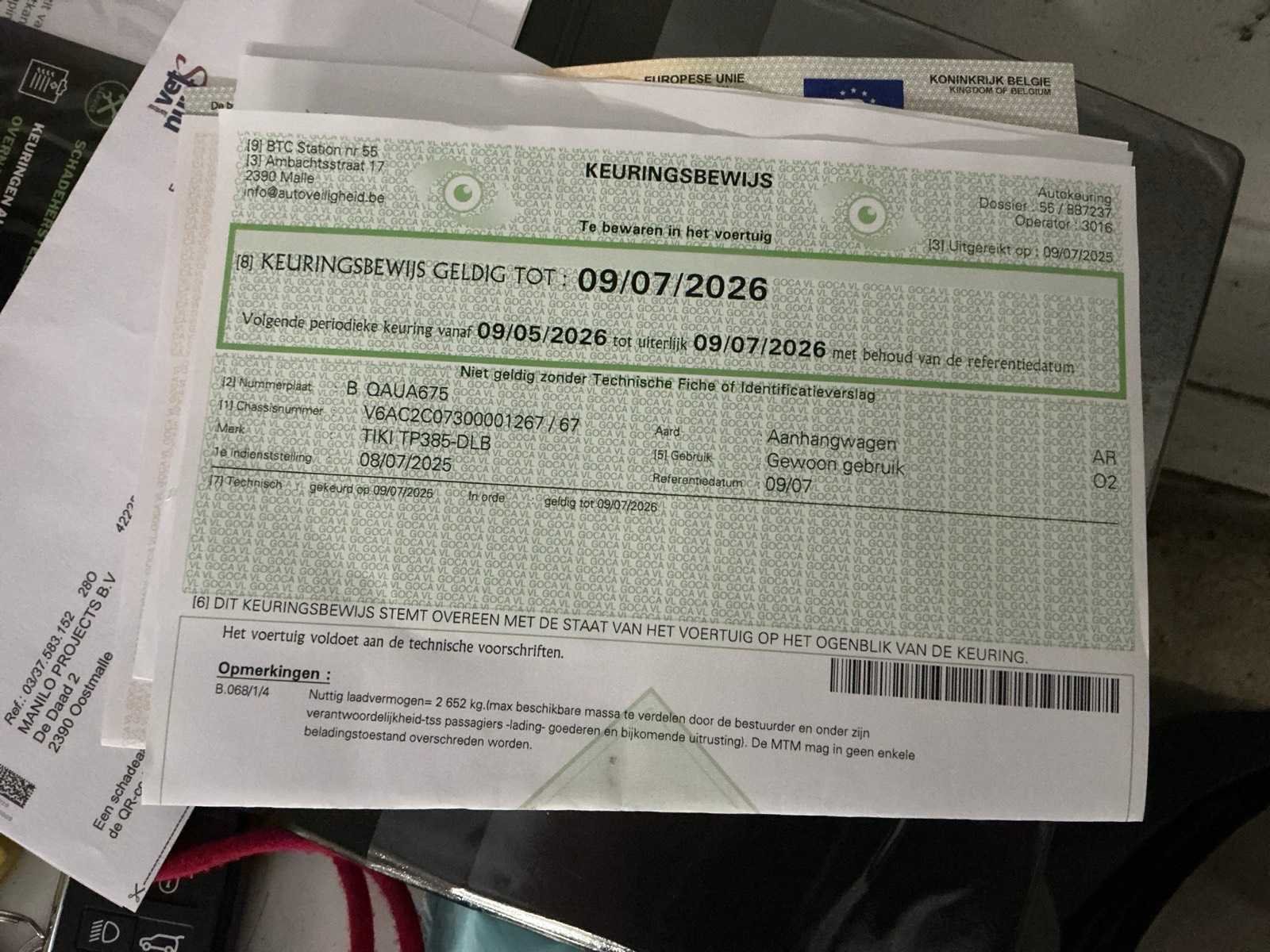 Aanwezige documenten: kentekenbewijs deel 1 en deel 2, keuringsbewijs, identificatieverslag en gelijkvormigheidsattest. Nee Merk: Tiki Type: TP385-DLB Bouwjaar: 2025 Chassisnummer: V6AC2C07300001267 Laadvermogen: 3500kg Eigen gewicht: 848kg Aantal assen: 2 Datum eerste toelating: 08/07/2025