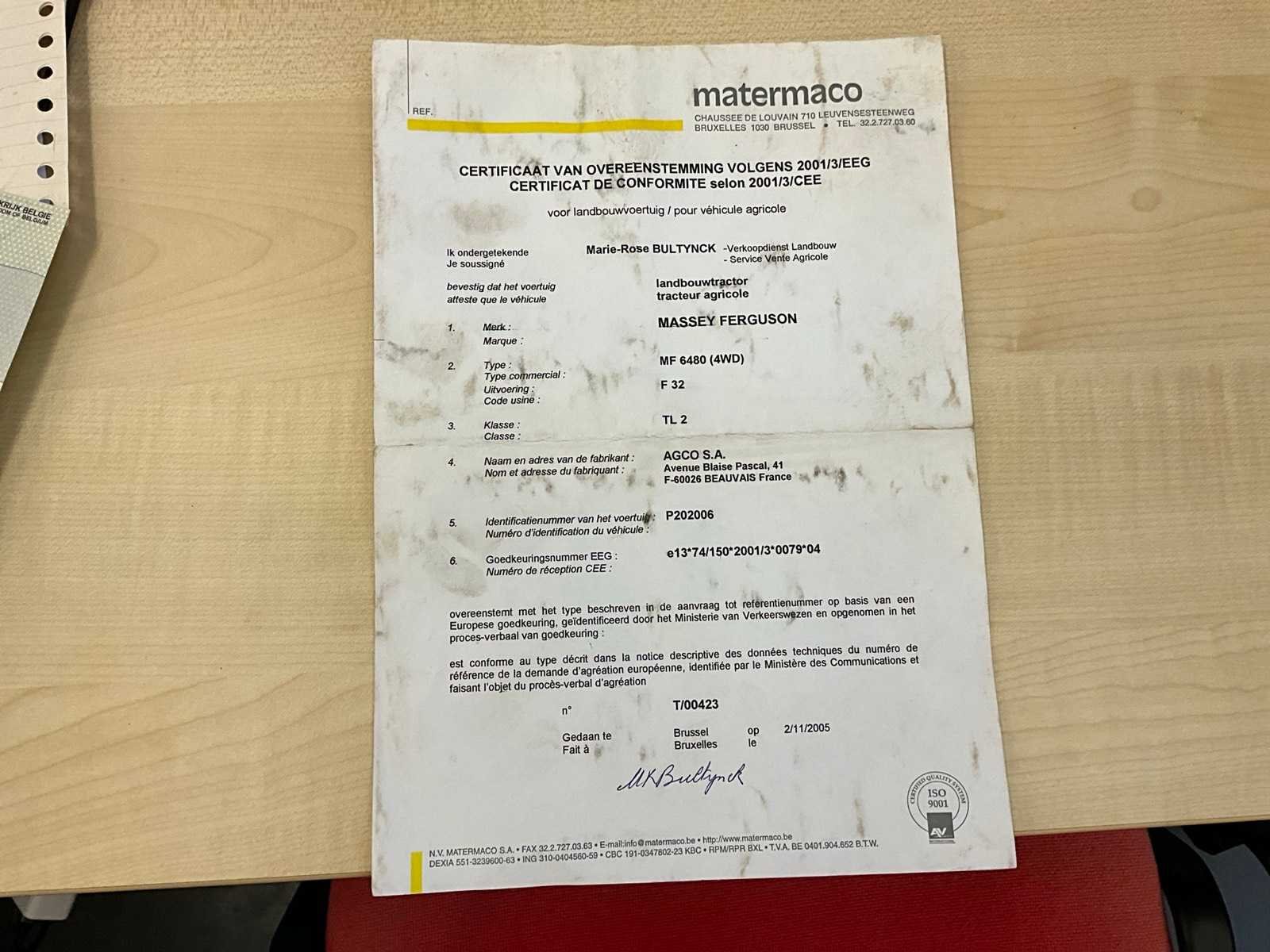 Compleet met contergewicht vooraan. Voorste banden worden vervangen door michelin. Tier 2 perkins. Geveerde vooras + geveerde cabine, airco, load sensing en fronthef. De tractor rijdt, heft en schakelt normaal. Nee Merk: Massey Ferguson Type: 6480 Bouwjaar: 2005 Serienummer: P202006 Motorvermogen (kW): 114kW Afgelezen urenstand: 7653 Chassisnummer: P202006 Datum eerste toelating: 30/11/2005