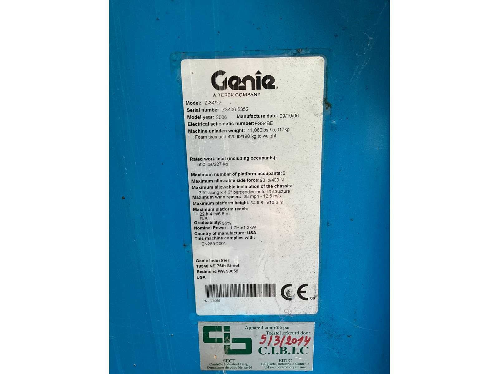 Alles werkt buiten het voor en achteruit rijden - Buiten dit is deze volledig functioneel (mast, sturen van de wielen, ...) - gebruikte maar algemeen goede staat Nee Merk: Genie Type: Z34 22 Bouwjaar: 2006 Elektrisch: true Motorvermogen (kW): 1.3kW Masthoogwerker: true Werkhoogte: 10.6mm Horizontale rijkwijdte: 6.8mm Platform capaciteit: 227kg Eigen gewicht: 5017kg