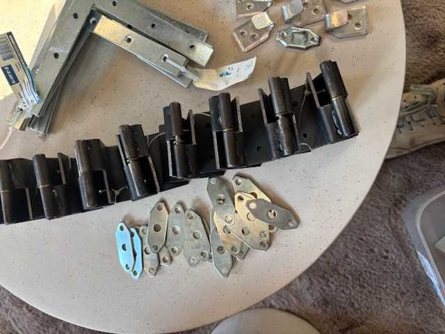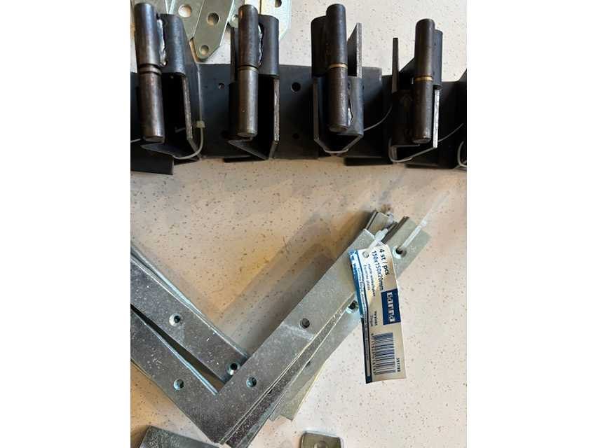 106 x diverse beugels -haakjes-scharnieren. 10 X ophanghaakjes 16 x Gamma winkelhoek /raamhoek 50 x hoekje 20 x plat plaatje 10x scharnier Nee