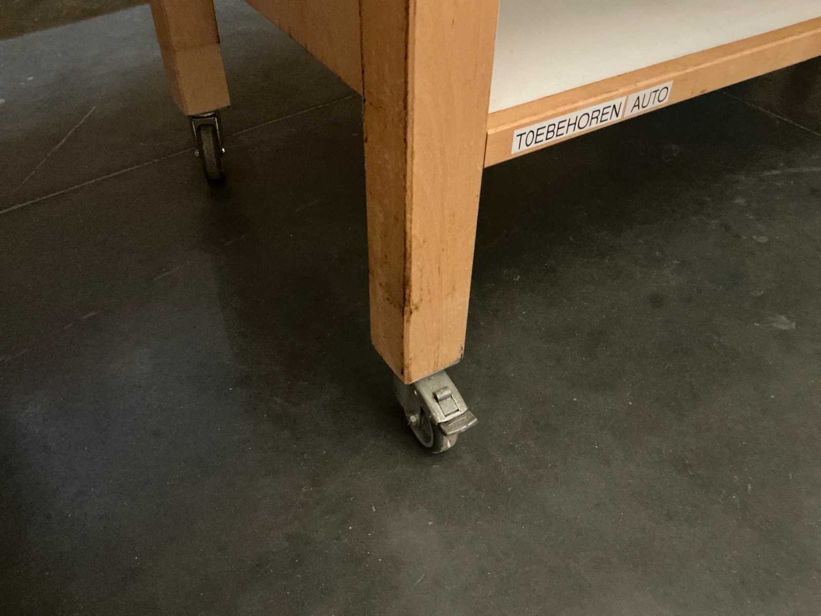 Lot van 3 werkbanken met leggers en schuiven. 2 op wielen, 1 zonder wielen. 175cm x 65cm x 100cm No