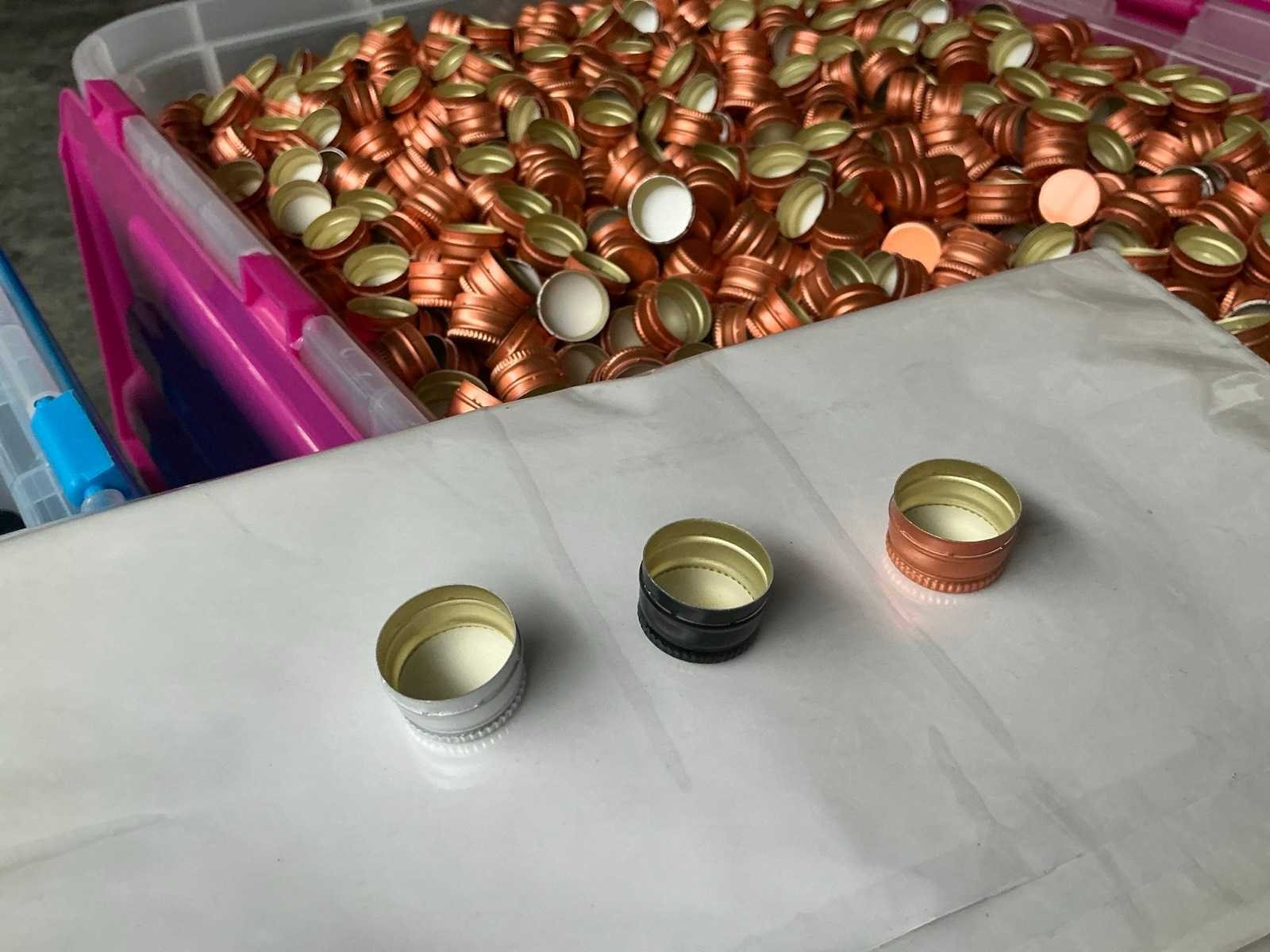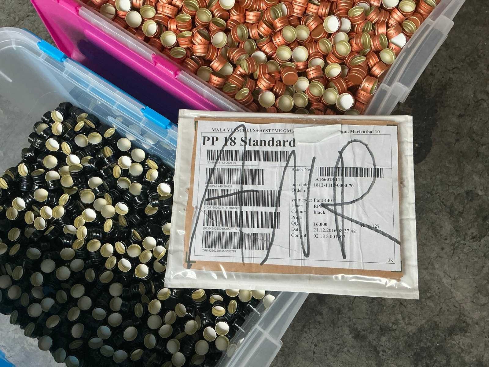 Dit lot bestaande uit meerdere ‘Schroefdop PP18’ in kleuren: zwarte, grijs (zilver) en koperkleurig. Stock: zwart: 1500 (1 box) Stock: zilver: 6000 (3x2000 in box) Stock: koper: 130000 (8 cartons +2000 in a box) Nee Merk: Schroefdop PP18