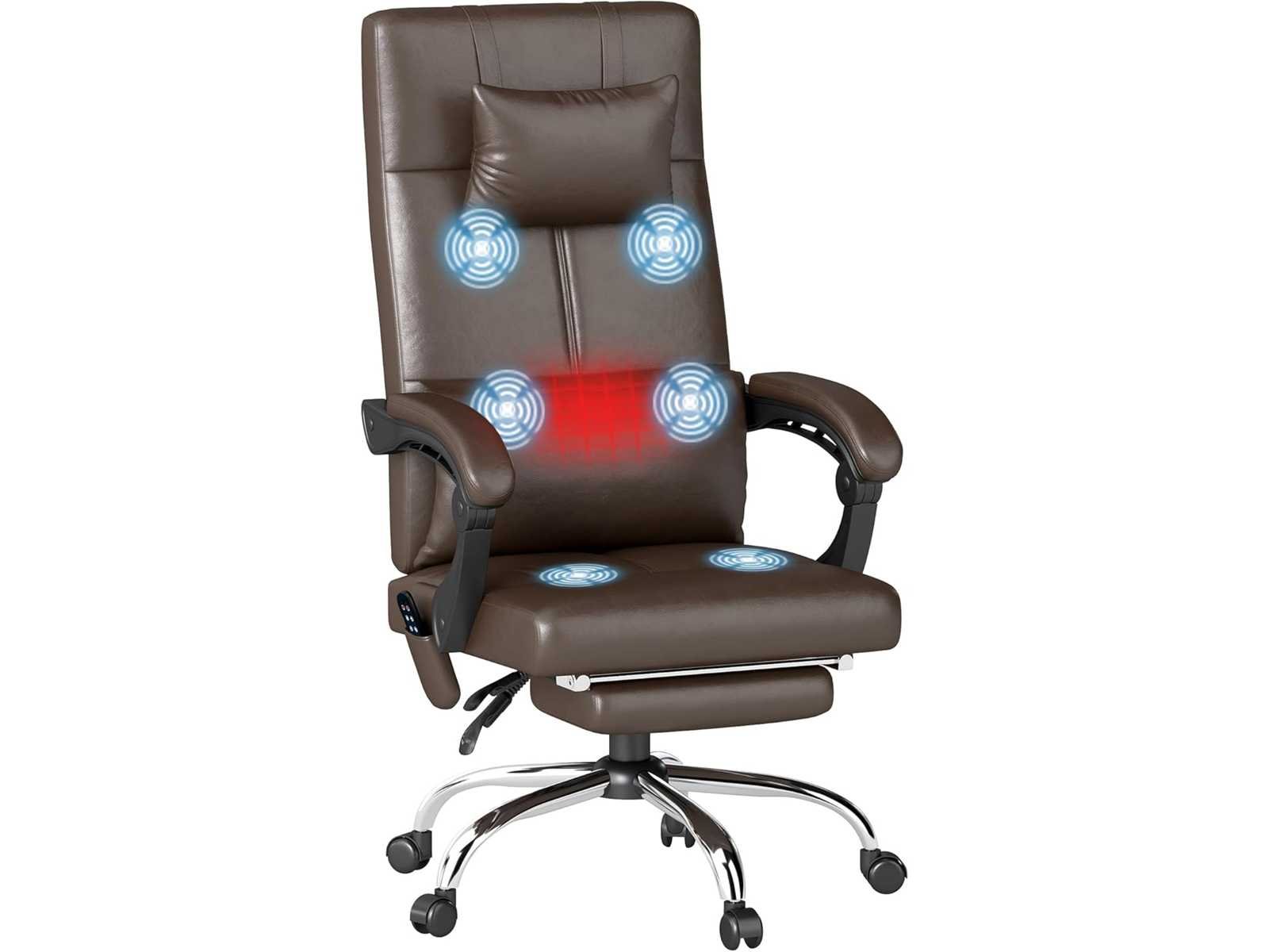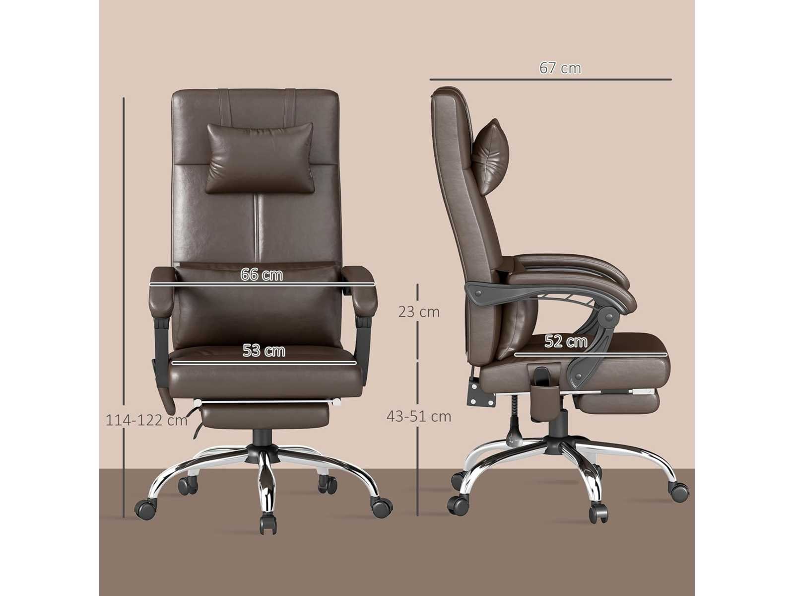 Donkerbruine kleur Materialen PU leer, schuim, metaal, PP Totale afmetingen: 66B x 67D x 115-123H cm; Hellende afmetingen: 66B x 1122D x 90H cm Zitafmetingen: 53B x 52D cm Zithoogte 46-54 cm Armleuningshoogte versus 23 cm (bij de zitting) Afmetingen rugleuning: 52B x 66H cm Hoofdkussendikte 12 cm Kabellengte 1,8 m Gewichtscapaciteit: 120 kg Non
