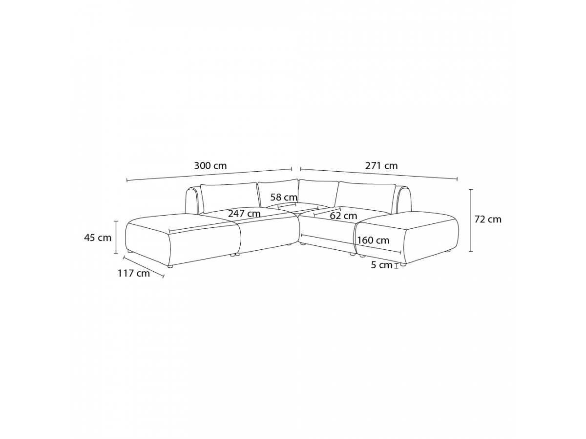 BANKAFMETINGEN: Lengte: 271 cm Breedte: 300 cm Hoogte: 72 cm Zithoogte: 45 cm Zitbreedte: 218 cm Zitdiepte zonder kussens (fauteuil): 83 cm Zitdiepte met kussens (fauteuil): 62 cm Zitdiepte zonder kussens (hoek): 76 cm Zitdiepte met kussens (hoek): 58 cm Beenhoogte: 5 cm AFMETINGEN VAN DE KLEINE POUF: Lengte: 66 cm Breedte: 117 cm Hoogte: 45 cm Beenhoogte: 5 cm AFMETINGEN VAN DE GROTE OTTOMAN: Lengte: 95 cm Breedte: 117 cm Hoogte: 45 cm Beenhoogte: 5 cm Soort zitcomfort Gebalanceerd? Stevige ondersteuning en optimaal comfort. Al onze gestoffeerde banken bieden dit comfort. Cabriolet Nee Kofferbak Nee Coating Getextureerde stof Aantal plaatsen 5 Structuur Hout en spaanplaat Rugleuningvulling HD-schuim en watten Rugsteundichtheid (kg/m3) 21 Zitbekleding HD Foam, HR Foam en HD Foam Zitdichtheid (kg/m3) 21 / 30 / 25 Materiële voeten Plastic Stijl Modern Productie Europa Om jezelf in elkaar te zetten Ja (Kit) Verwijderbare afdekking Nee Omkeerbaar Ja Totale lengte (cm) 271 Totale breedte (cm) 300 Totale hoogte (cm) 72 Zithoogte (cm) 45 Maximale belasting (kg) 450 Gewicht (kg) 200 Type zadelvering Zigzagveren Rugleuningophanging type Vezelplaat Gemiddelde kussenafmetingen (cm) 74 x 35 Grote kussenafmetingen (cm) 84 x 35 Martindale Test (Cycli) 32 000 Non