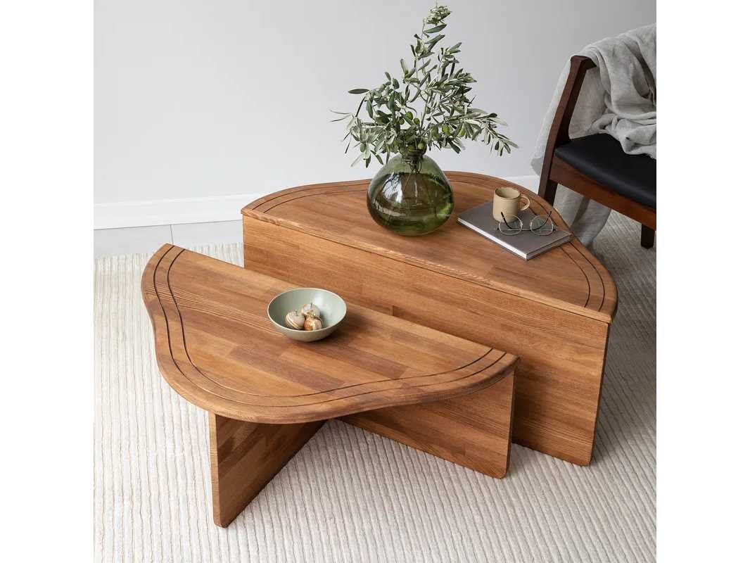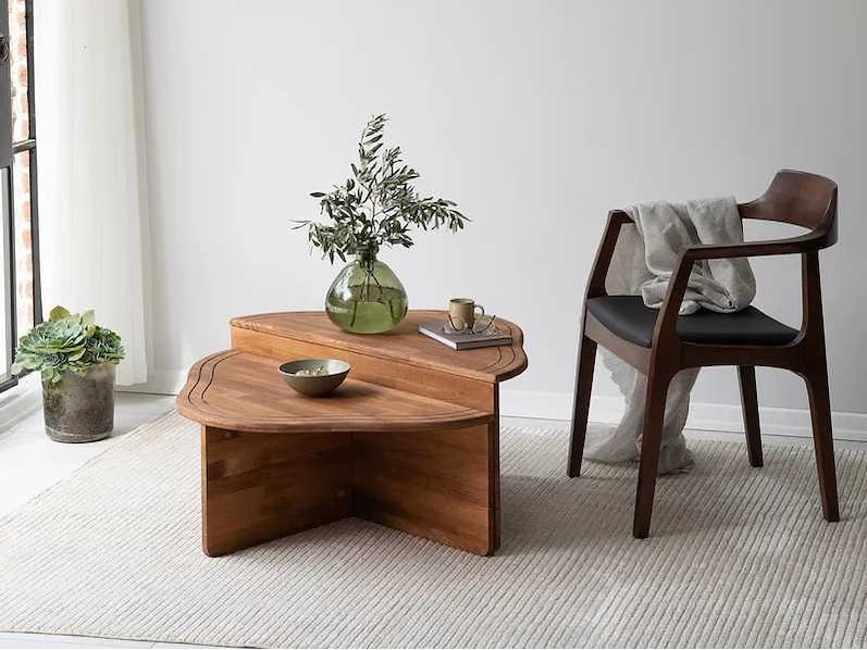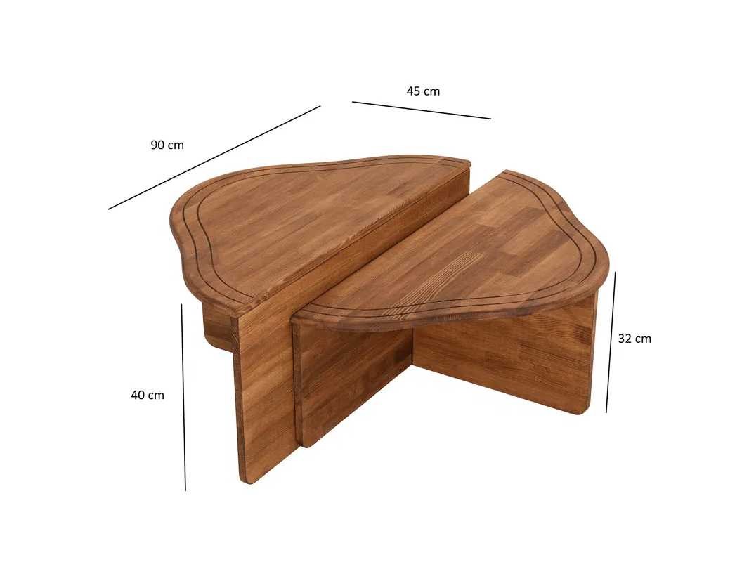 Productbeschrijving: Salontafel van massief hout in kastanjekleur. Het bestaat uit twee structuren, waarvan de afmetingen zijn: 90 cm breed, 40 cm diep en 45 cm diep. 90 cm breed, 32 cm hoog en 45 cm diep. Non