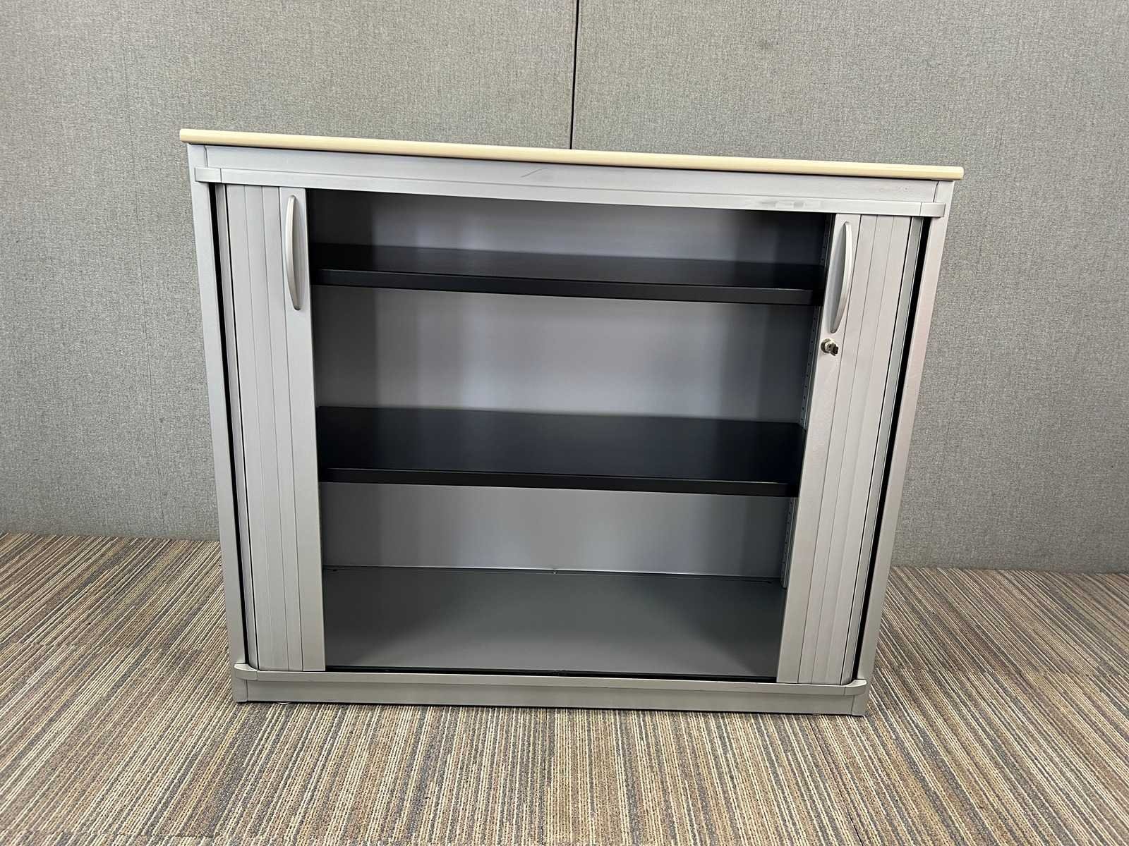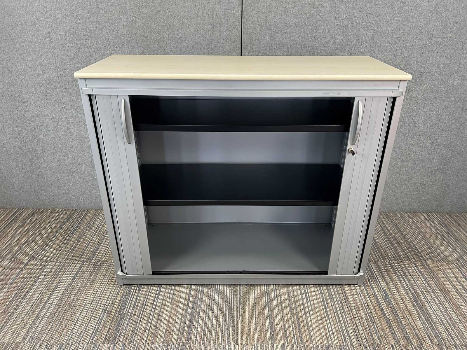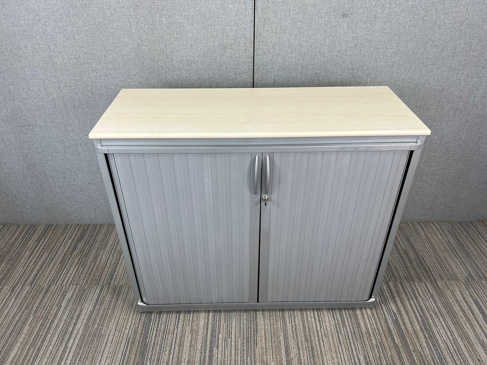 Halfhoge roldeurkast Steelcase, metalen frame met kunststof roldeuren, esdoorn topblad, 2 leggers per kast. Gebruiksporen aanwezig, sleutel is niet gegarandeerd Nee Merk: STEELCASE Type: Halfhoge roldeurkast H130 Kleur: zilvergrijs Gewicht: 60kg Breedte: 120cm Hoogte: 130cm Diepte: 45cm Materiaal: metaal