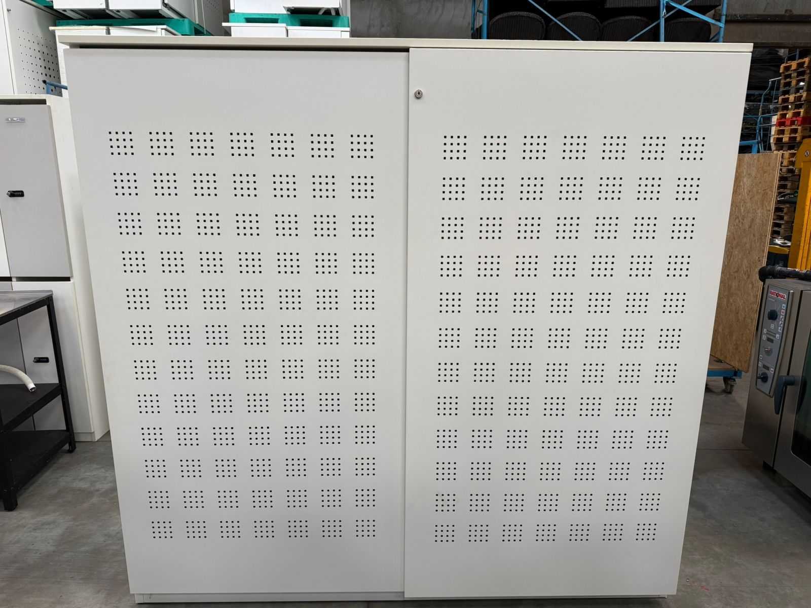Robuuste metalen archiefkast in lichtgrijze uitvoering, voorzien van twee geperforeerde schuifdeuren voor ventilatie. De kast is uitgerust met meerdere verstelbare legborden en biedt ruime opslag voor dossiers, mappen of materialen. Ideaal voor kantoor, archief, werkplaats of technische ruimte. sleutels niet gegarandeerd Nee Merk: PAMI Type: akoestisch schuifdeurkast Kleur: lichtgrijs Gewicht: 90kg Breedte: 200cm Hoogte: 195cm Diepte: 49cm