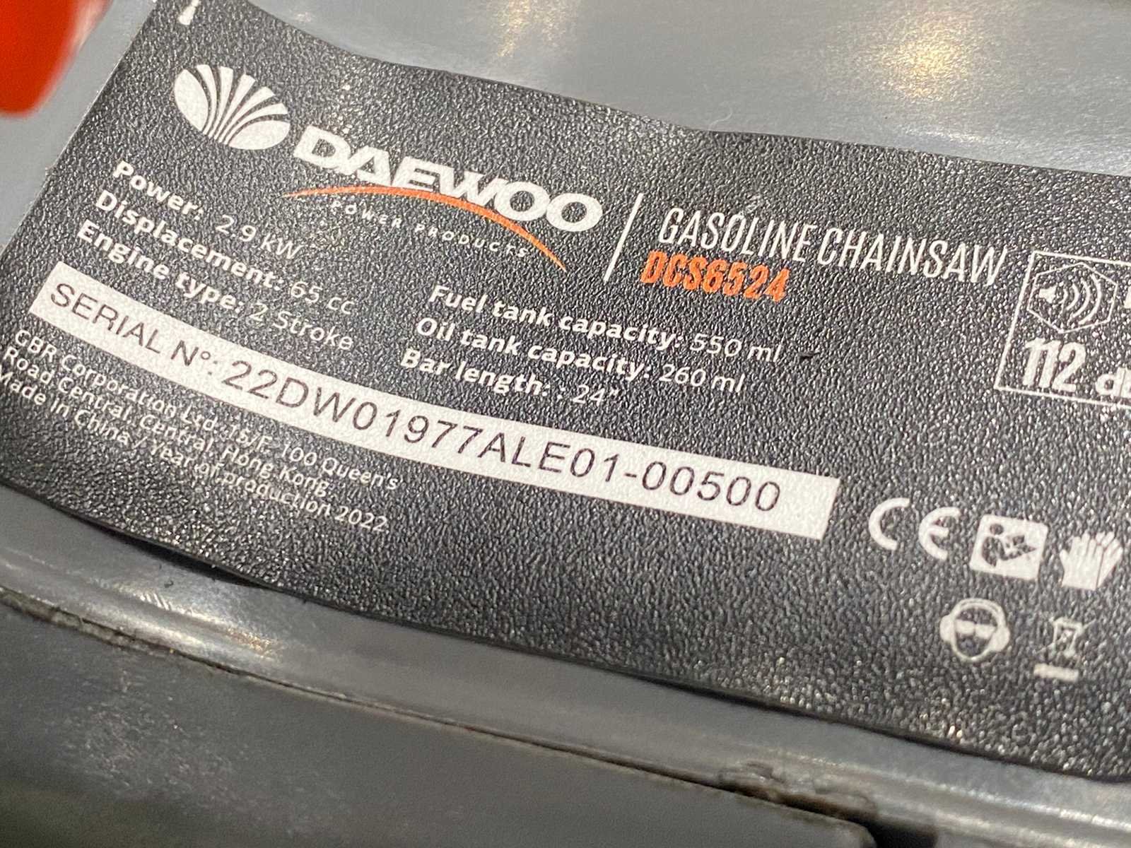 <li><strong>Merk:</strong> Daewoo</li> <li><strong>Type:</strong> DCS6524</li> <li><strong>Motorvermogen:</strong> 2.9 kW</li> <li><strong>Motorinhoud:</strong> 65 cc</li> <li><strong>Brandstof:</strong> 2-takt benzine</li> <li><strong>Voorzien van:</strong> automatische kettingsmering</li> <li><strong>Lengte zaagblad:</strong> 600 mm / 24 inch</li> <li><strong>Staat:</strong> ongebruikt, in de originele verpakking</li> No Merk: Daewoo Type: DCS6524