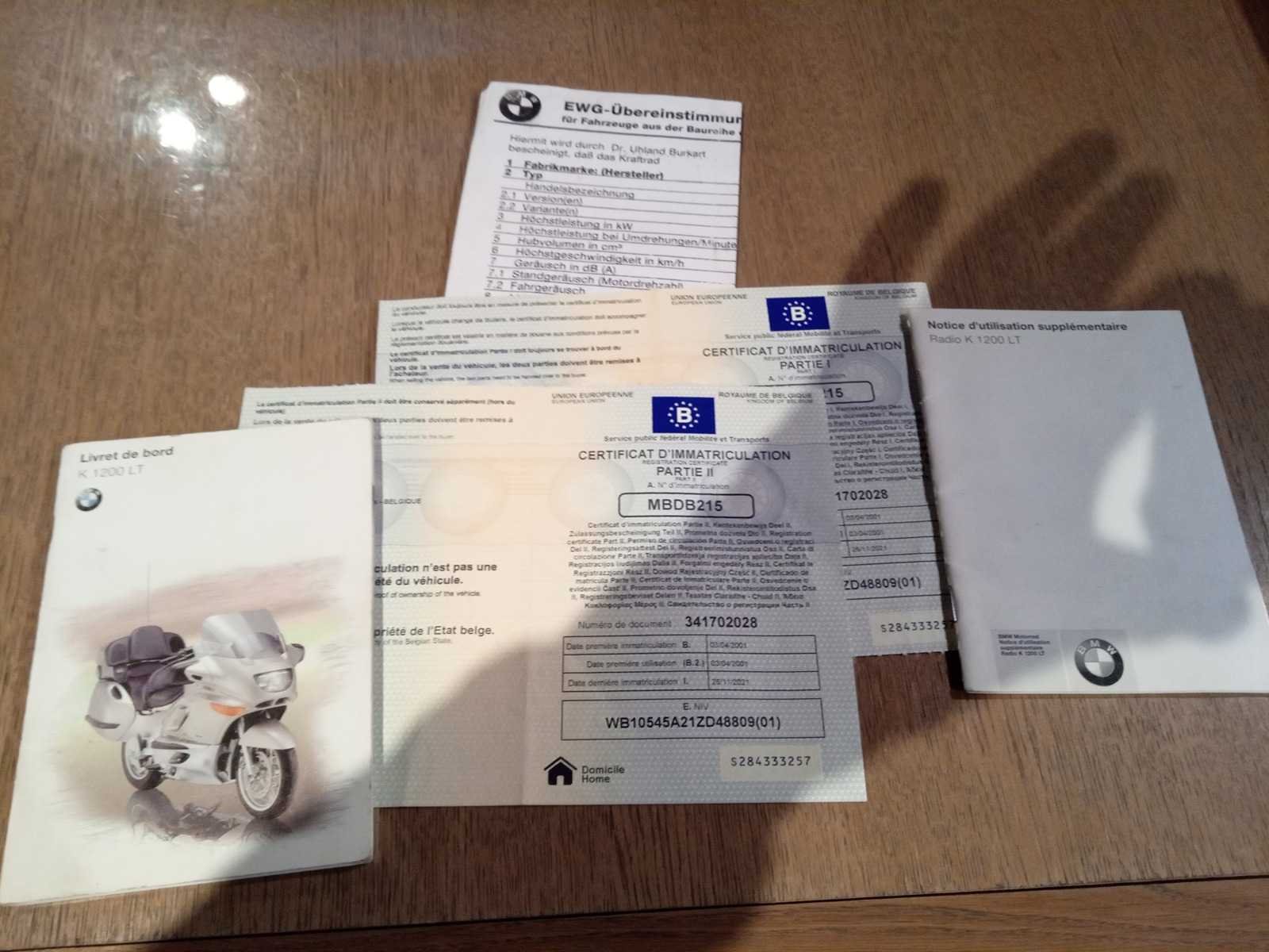 Inschrijvingsbewijs deel 1 en 2 aanwezig, gelijkvormigheidsattest copy moto start niet . Benzinepomp vervangen Nee Merk: bmw Model: Lt 1200 Chassisnummer: WB10545A21ZD48809 Cilinderinhoud: 1200cc Datum eerste toelating: 03/04/2001 Vermogen (kW): 72kW Afgelezen kilometerstand: 70795km Boorddocumenten aanwezig?: true Aantal sleutels: 1 Startinformatie: neen . accu vervangen Bouwjaar: 2001