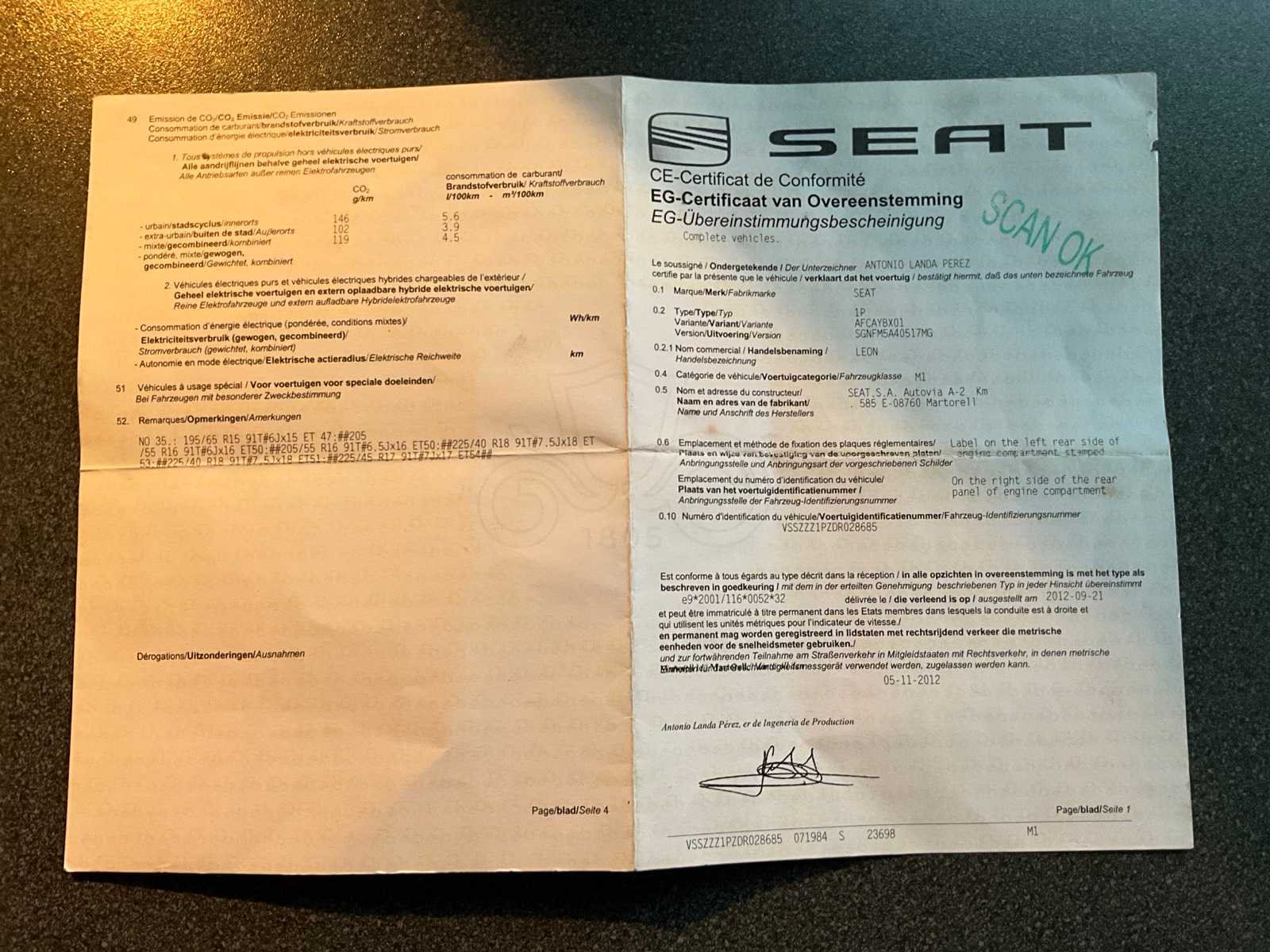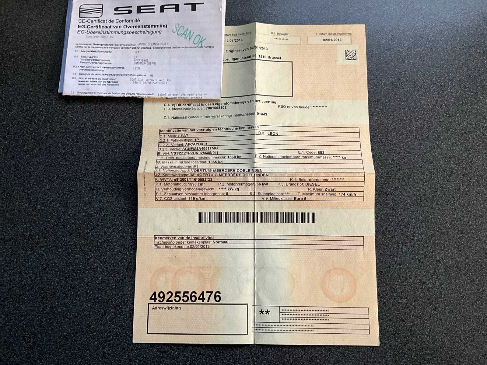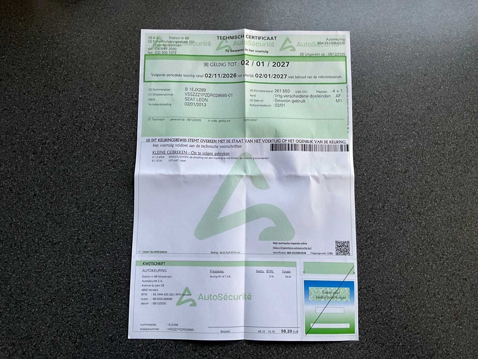 Verkoop door eerste eigenaar. Op 08/12/2025 gekeurd - keuring geldig tot 02/01/2027. Origineel volkswagen scherm geïnstalleerd RNS 510 compleet met gps, Bluetooth audio, Bluetooth, gps, SD kaartlezer. Vol automatische airco dual zone, sportzetels, 16” lichtmetalen velgen, recentere banden. Sportuitlaatstuk, getinte ramen van fabriek. Nee Merk: Seat Model: Leon 1.6 TDI Bouwjaar: 2013 Afgelezen kilometerstand: 261858km Cilinderinhoud: 1598cc Vermogen (kW): 66kW Brandstof: diesel Chassisnummer: VSSZZZ1PZDR028685 Datum eerste toelating: 02/01/2013 Transmissie: Handgeschakeld Aantal sleutels: 2 Nationaliteit documenten: Belgisch Start en rijdt: Ja startinformatie : Start en rijdt Inschrijvingsbewijs - deel 1 : Aanwezig Inschrijvingsbewijs - deel 2: Aanwezig