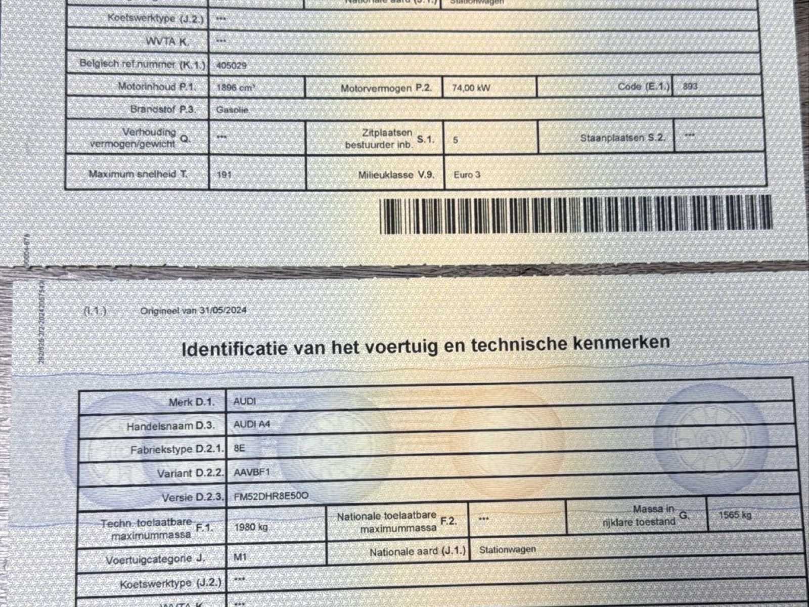 Audi A4 Avant 1.9 TDI (74 kW – 1896 cc) uit 2004. Euro 3. Start en rijdt, maar batterij zwak → starten met booster. Airco, elektrische spiegels, JVC-radio, nette stoffen zetels. Goed onderhouden motorruimte. Met trekhaak. Exterieur: Koetswerk in goede staat voor leeftijd Lichte gebruikssporen naar leeftijd (krassen, matte plekken) Dakrails Velgen in normale staat Achterruit en zijruiten donker getint Interieur: Stofzetels in goede en nette staat Dubbele digitale klimaatregeling (airco) → zichtbaar werkend op 17,5 °C ESP-knop aanwezig Aftermarket JVC-radio met Bluetooth Geen grote slijtage aan het dashboard Interieurpanelen en vloeren proper Elektrische spiegels met verwarmingsstand Elektrische ramen vooraan No Merk: Audi Model: A4 Avant Type: stationwagen Bouwjaar: 2004 Afgelezen kilometerstand: 400634km Cilinderinhoud: 1896cc Vermogen (kW): 74kW Brandstof: diesel Chassisnummer: WAUZZZ8E34A227679 Datum eerste toelating: 17/3/2004 Aantal zitplaatsen: 5 Transmissie: manueel Emissieklasse: Euro 3 Ledig gewicht: 1565kg Nationaliteit documenten: B Start en rijdt: ja Vavato voert geen technische keuring uit.: true Airconditioning: true Inschrijvingsbewijs - deel 1 : aanwezig Inschrijvingsbewijs - deel 2: aanwezig