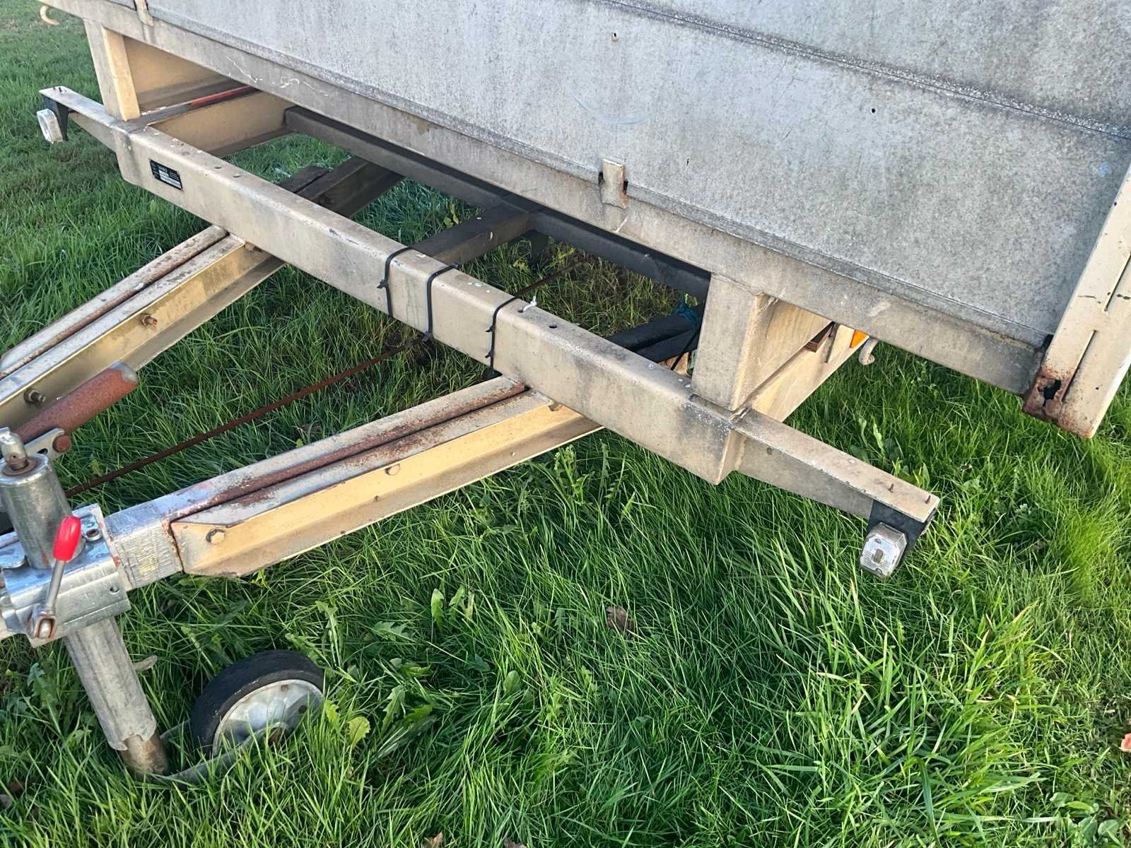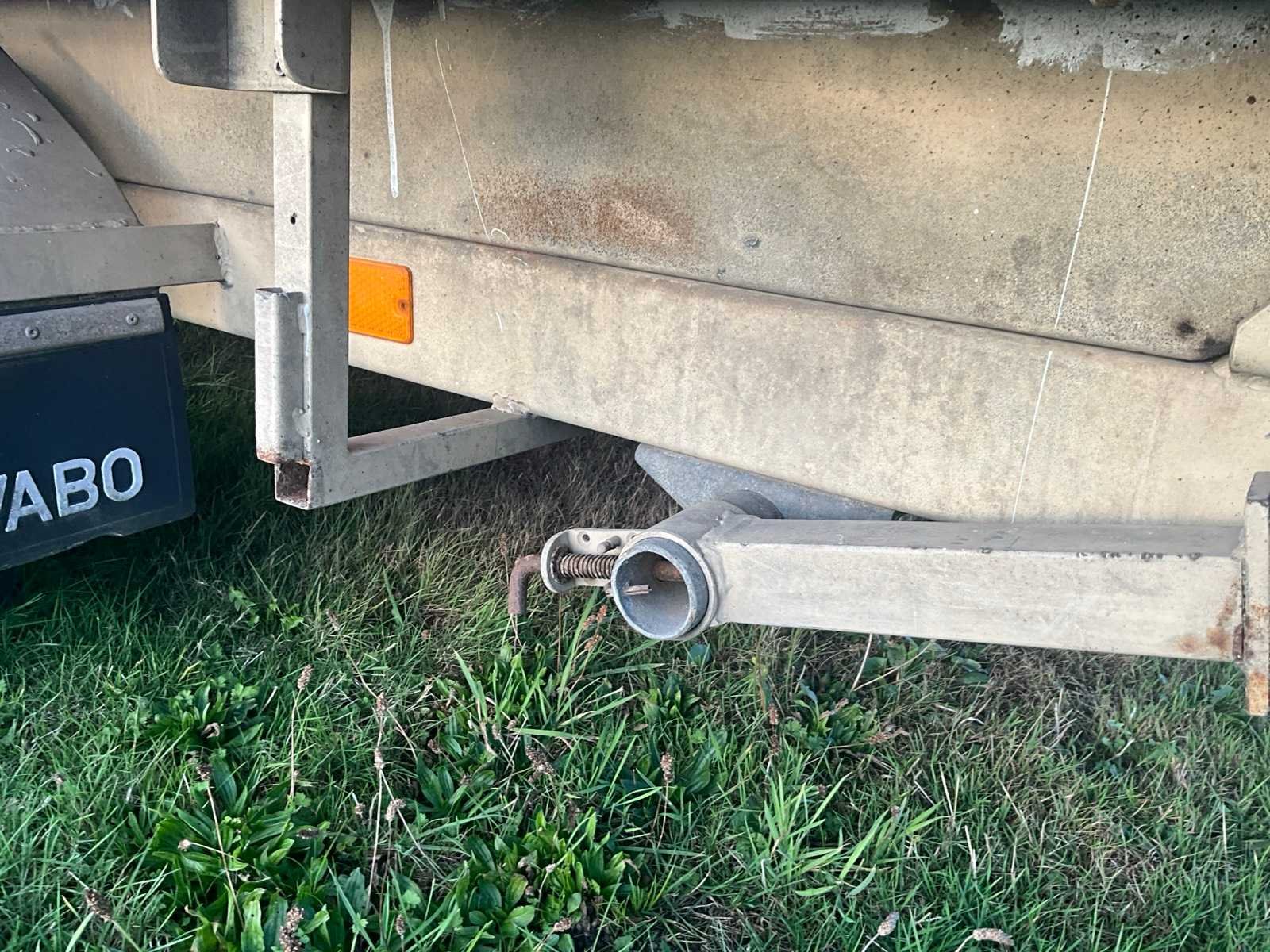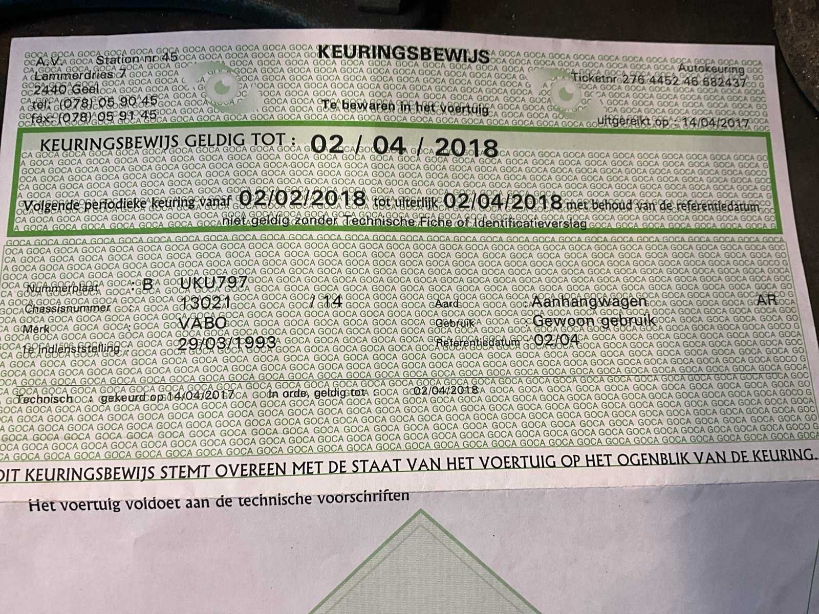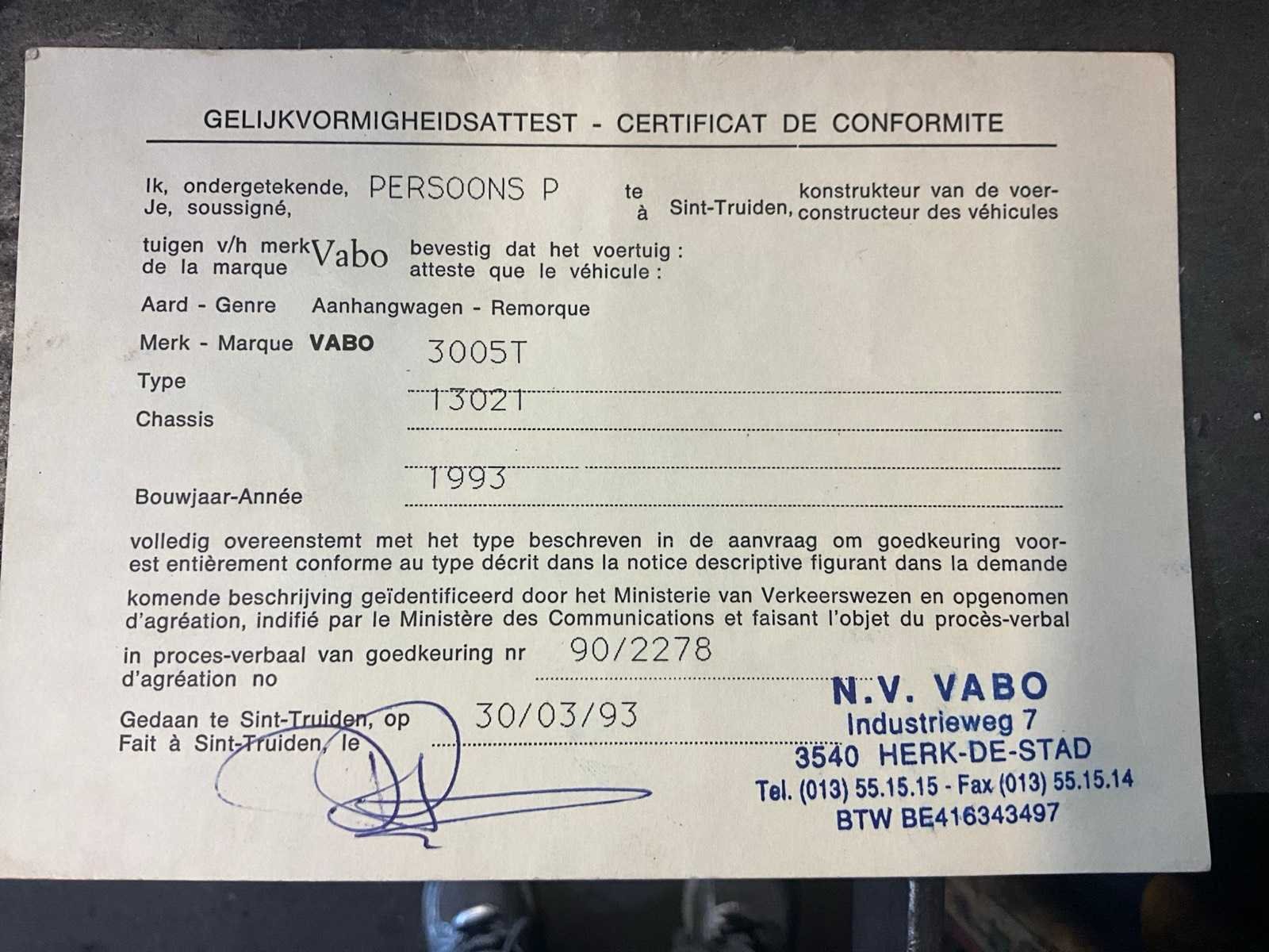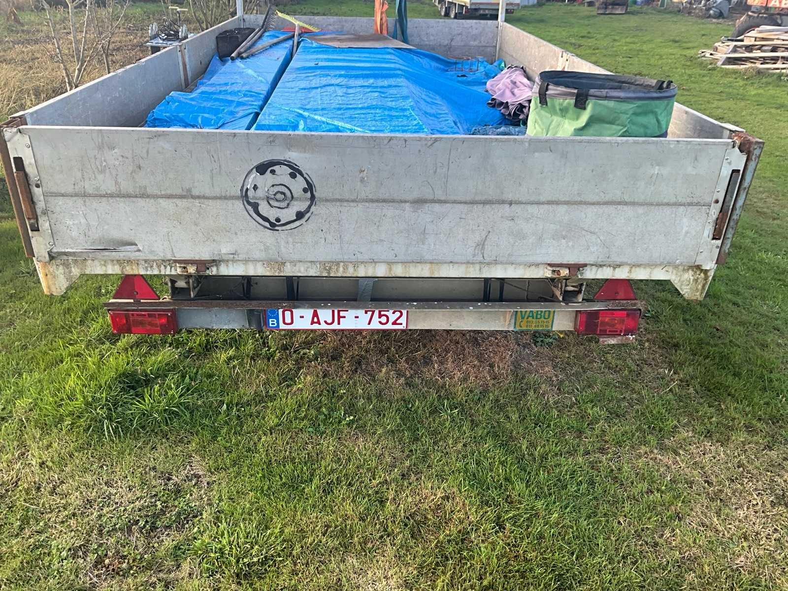 Stevig gebouwde Vabo 3UU5T kipperaanhangwagen uit 1993, MTM 3000 kg, met een laadvermogen van 1900 kg. Uitgerust met een grote laadbak van 410 × 225 cm en een wandhoogte van 40 cm, goed voor een laadvolume van ca. 3,5 m³. Ideaal voor losgestorte materialen zoals zand, aarde, mest, houtsnippers of puin - De hydraulische kipinstallatie werkt correct (zie foto’s en video), en de bodemplaat verkeert volgens verkoper in goede staat. Dissellengte 145 cm. De aanhangwagen wordt leeg verkocht. Het chassisnummer is duidelijk zichtbaar en de officiële documenten (identificatieverslag + keuring) zijn aanwezig. Conditie zoals weergegeven op de foto’s: gebruikssporen, oppervlakteroest op chassis en zijborden, maar constructief solide, alles is in werkende staat. Nee Merk: Vabo Type: kipper Model: 3UU5T Bouwjaar: 1993 Chassisnummer: 13021 Aantal assen: 2 Laadbak afmeting l: 410cm Laadbak afmeting b: 225cm Ledig gewicht: 1100kg Laadvermogen: 1900kg Datum eerste toelating: 29/3/1003 Kentekenpapieren compleet?: true Nationaliteit documenten: B