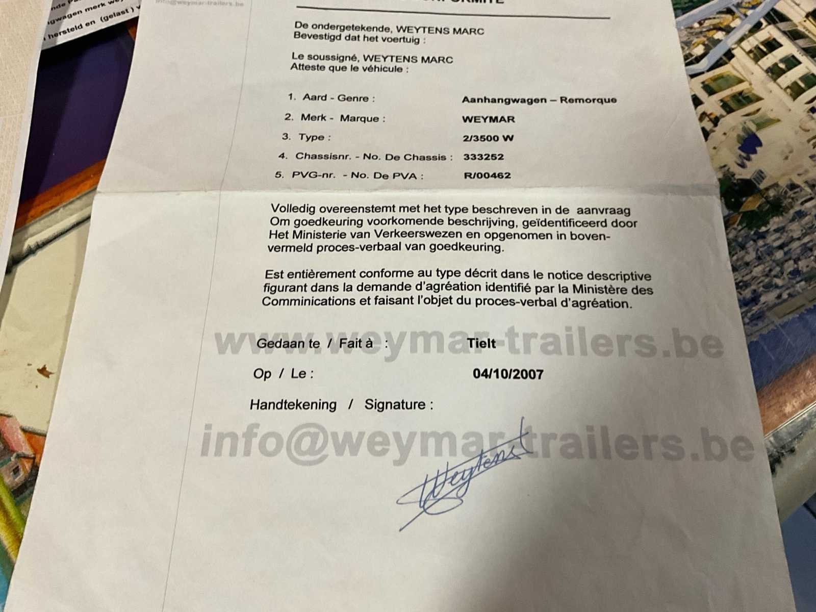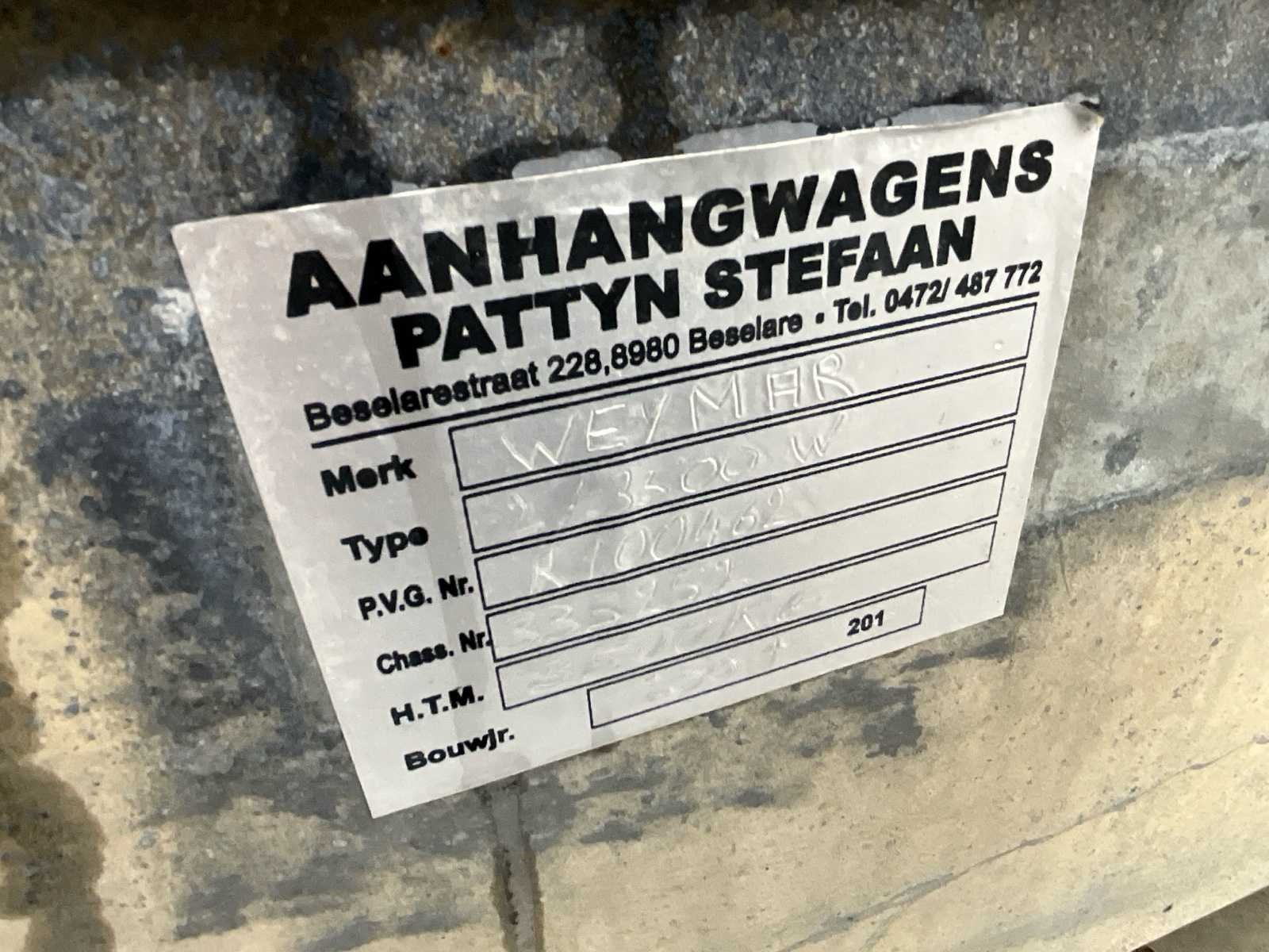 Belgische documenten 330X175 Elektrisch kipsysteem defect en dient nagekeken te worden No Merk: Weymar Type: 2/3500W Bouwjaar: 2007 Chassisnummer: 333252 Aantal assen: 2 Nationaliteit documenten: Belg
