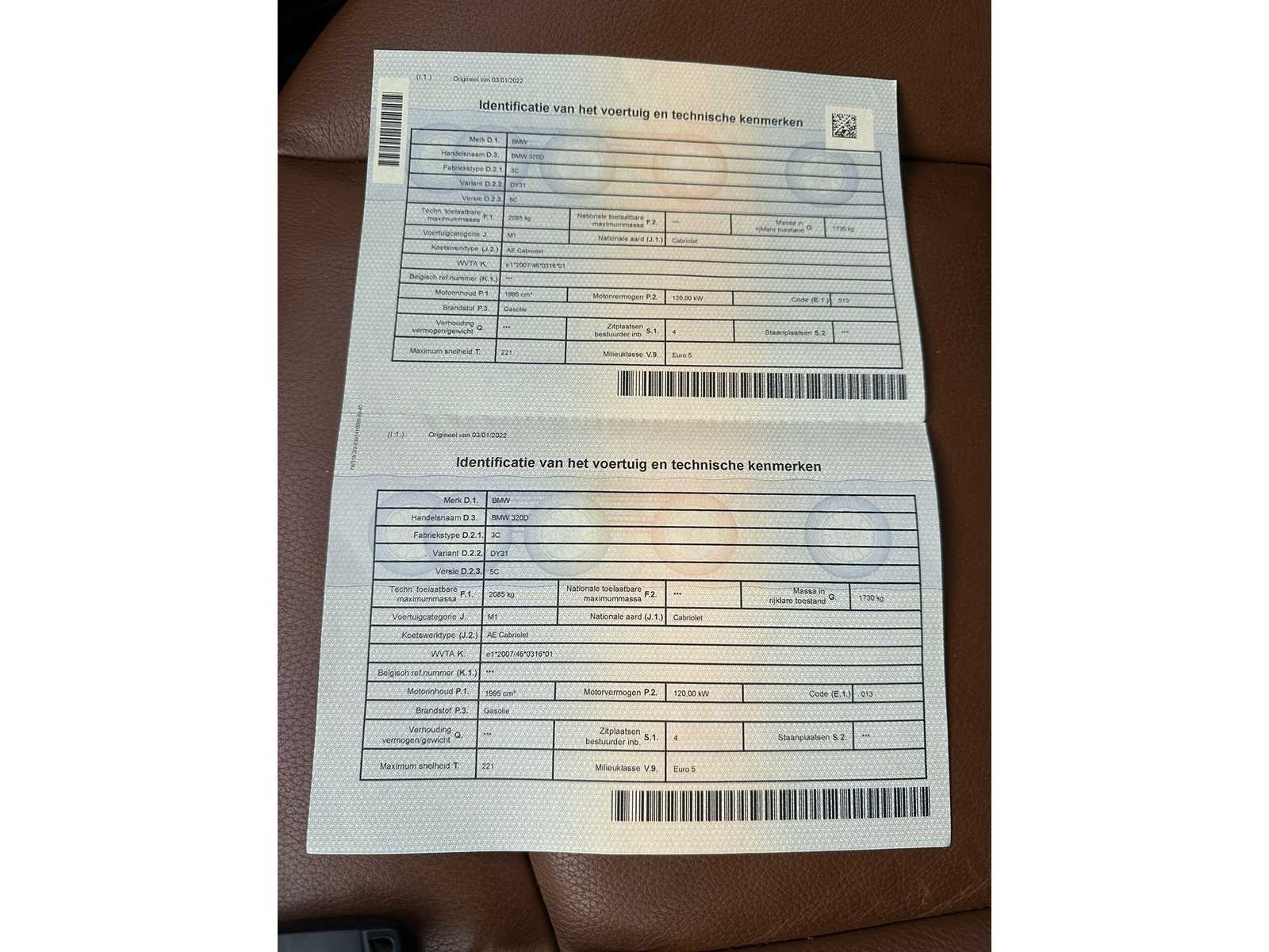 Trekhaak aanwezig Start en rijd 1995cc Bj2010 Nee Merk: BMW Model: 320D cabrio Bouwjaar: 2010 Afgelezen kilometerstand: 197618km Cilinderinhoud: 1995cc Vermogen (kW): 120kW Brandstof: diesel Datum eerste toelating: 29032010 Stuurwiel: links Emissieklasse: 5 Carrosserie: cabrio Nationaliteit documenten: Belg Start en rijdt: ja Vavato voert geen technische keuring uit.: true Inschrijvingsbewijs - deel 1 : aanwezig Inschrijvingsbewijs - deel 2: aanwezig