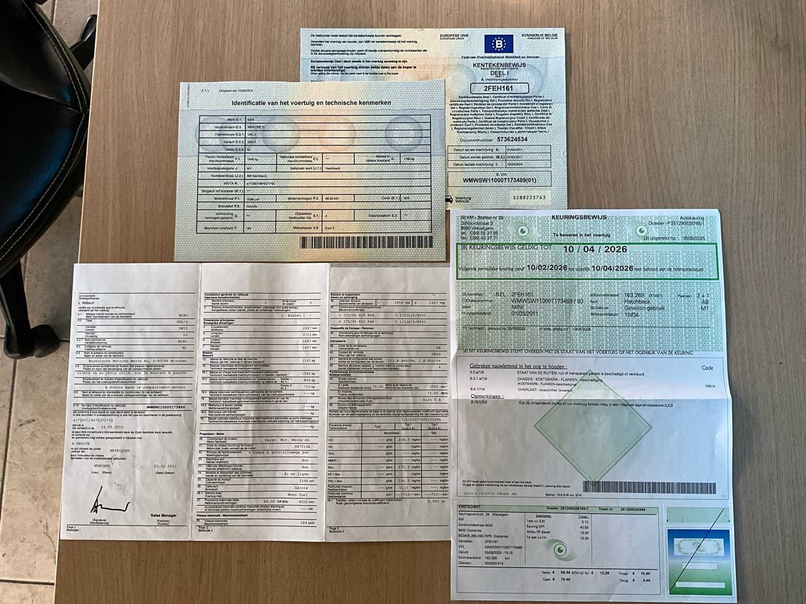 No Merk: Mini Cooper Model: Onze D Bouwjaar: 2011 Afgelezen kilometerstand: 179003km Cilinderinhoud: 1598cc Vermogen (kW): 66kW Brandstof: Diesel Chassisnummer: WMWSW11000T173489 Datum eerste toelating: 01/03/2011 Aantal zitplaatsen: 4 Transmissie: Handgeschakeld Aantal deuren: 3 Ledig gewicht: 1165kg Nationaliteit documenten: BE Gelijkvormigheidsattest aanwezig: true Start en rijdt: JA Keuringsrapport geldig tot: 10/04/2026 Inschrijvingsbewijs - deel 1 : Aanwezig Inschrijvingsbewijs - deel 2: Aanwezig