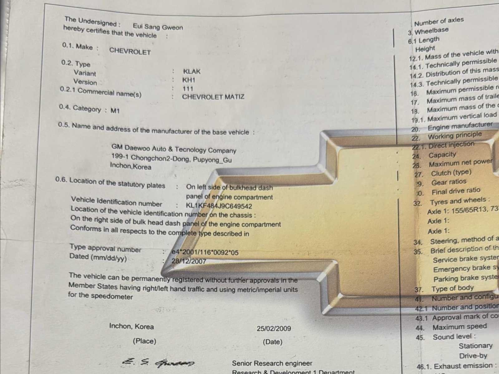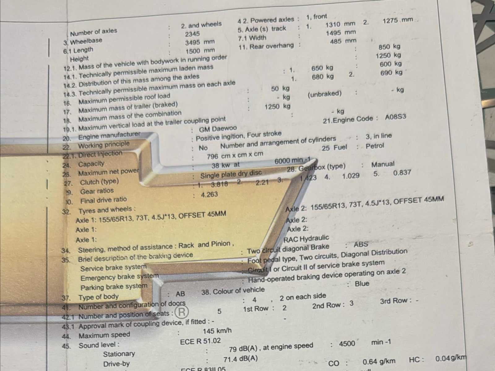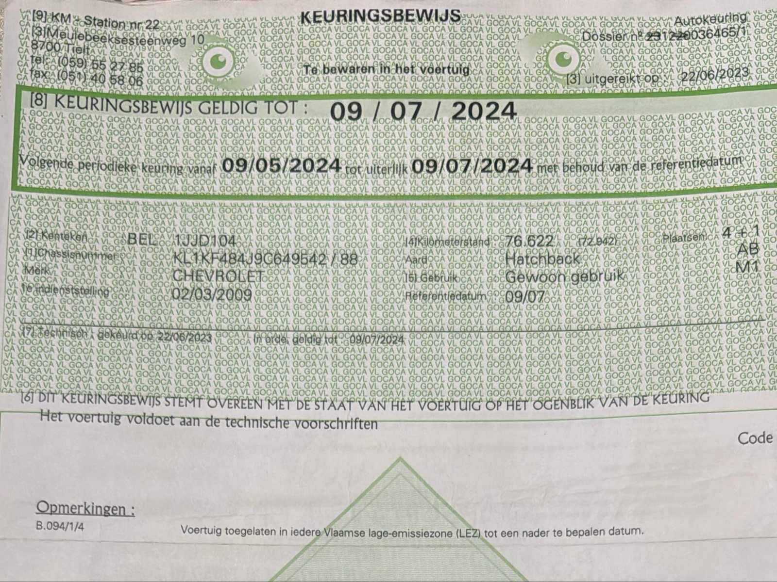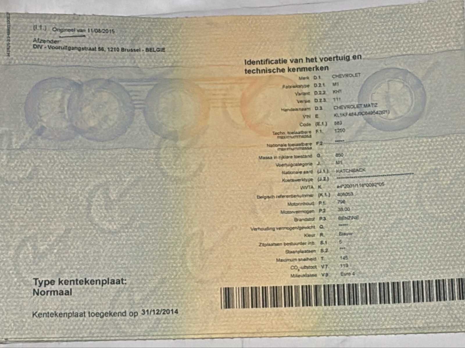 No Merk: Chevrolet Model: Matiz Bouwjaar: 2009 Afgelezen kilometerstand: 78273km Cilinderinhoud: 796cc Vermogen (kW): 38kW Brandstof: Benzine Chassisnummer: KL1KF484J9C649542 Laadvermogen: 400kg Datum eerste toelating: 02/03/2009 Vermogen (pk): 52hp Aantal zitplaatsen: 5 Transmissie: Handgeschakeld Emissieklasse: Euro 4 Ledig gewicht: 850kg Nationaliteit documenten: BE CO2-uitstoot NEDC: 119 Gelijkvormigheidsattest aanwezig: true Start en rijdt: Ja Keuringsrapport geldig tot: 09/07/2024 startinformatie : Start, rijdt, remt Inschrijvingsbewijs - deel 1 : Ok Inschrijvingsbewijs - deel 2: Ok