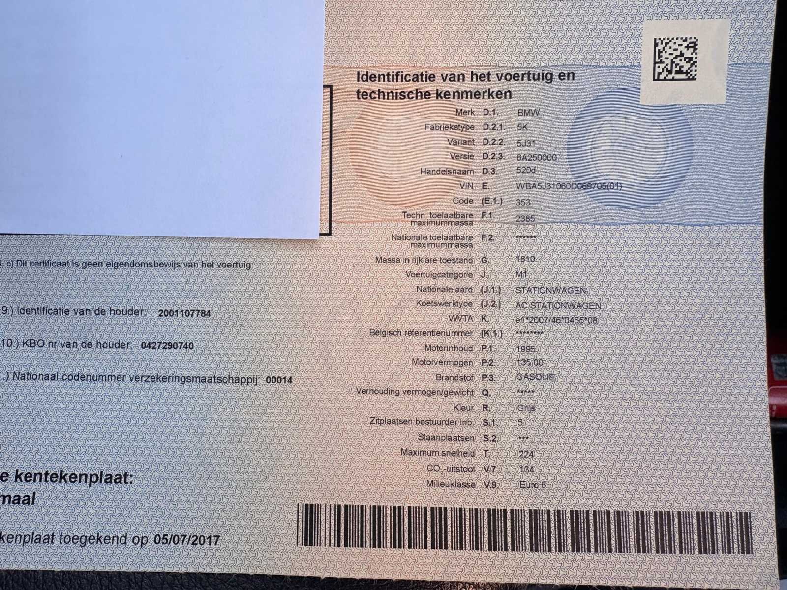 Nee Merk: Bmw Model: 520D Bouwjaar: 2013 Afgelezen kilometerstand: 342049km Cilinderinhoud: 1995cc Vermogen (kW): 135kW Brandstof: Diesel Chassisnummer: WBA5J31060D069705 Datum eerste toelating: 22/10/2013 Vermogen (pk): 184hp Aandrijving: Achterwiel Aantal zitplaatsen: 5 Maximaal trekgewicht ongeremd: 750kg Maximaal trekgewicht geremd: 2000kg Transmissie: Automaat Stuurwiel: Links Emissieklasse: Euro 6 Aantal deuren: 5 Ledig gewicht: 1810kg Aantal cilinders: 4 Carrosserie: Stationwagen Nationaliteit documenten: BE CO2-uitstoot NEDC: 134 Gelijkvormigheidsattest aanwezig: true Start en rijdt: Ja Keuringsrapport geldig tot: 05/07/2026 startinformatie : Start, rijdt, remt Vavato voert geen technische keuring uit.: true Airconditioning: true Navigatie: true Leder bekleed: true Inschrijvingsbewijs - deel 1 : OK Inschrijvingsbewijs - deel 2: Attest Politie