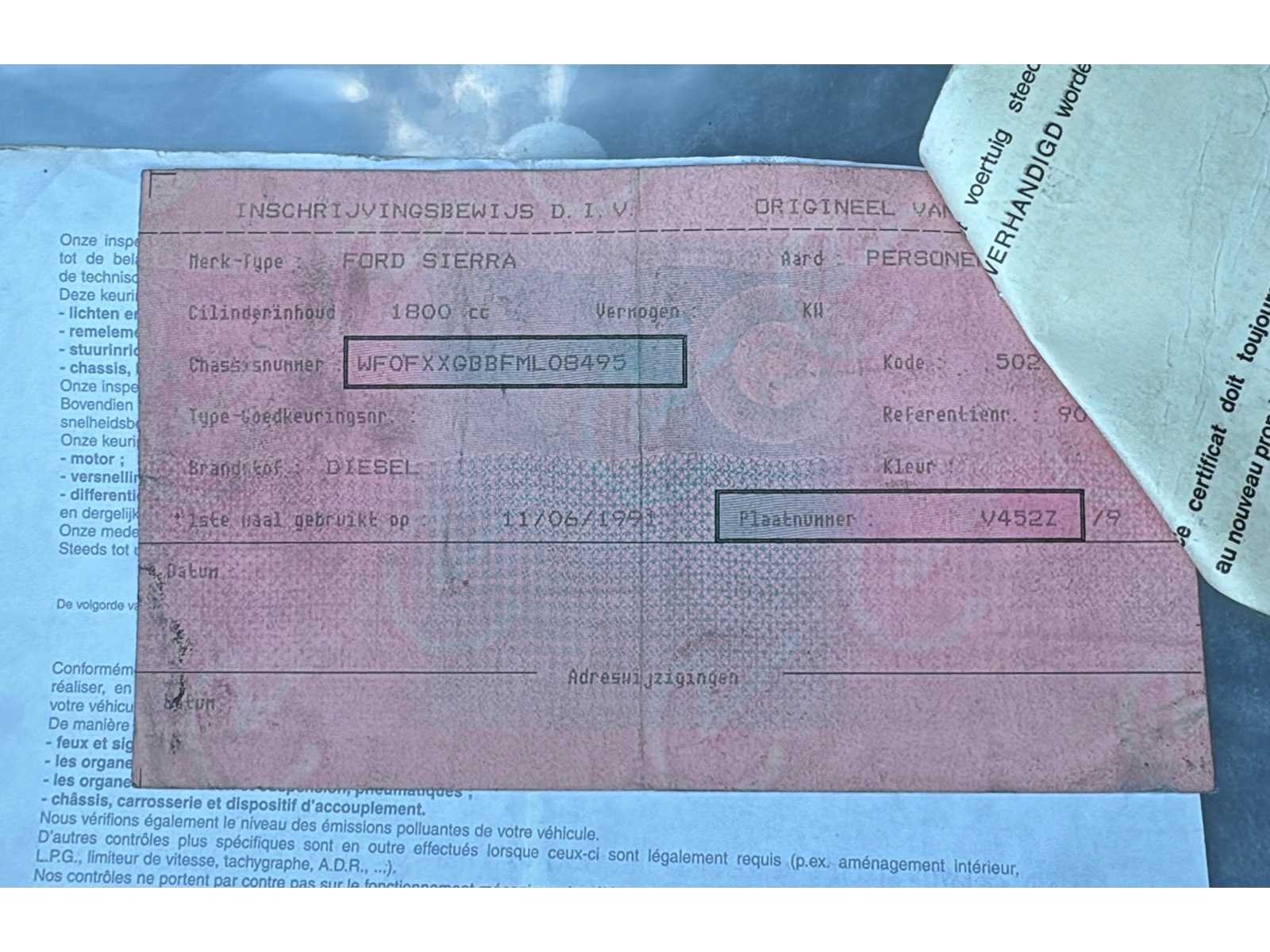 Nee Merk: Ford Model: Sierra Type: 1.8D Bouwjaar: 1991 Afgelezen kilometerstand: 49676km Cilinderinhoud: 1800cc Vermogen (kW): 44kW Brandstof: Diesel Chassisnummer: WF0FXXGBBFML08495 Datum eerste toelating: 14/06/1991 Vermogen (pk): 60hp Aantal zitplaatsen: 5 Transmissie: Handgeschakeld Nationaliteit documenten: BE Gelijkvormigheidsattest aanwezig: true Start en rijdt: Ja Keuringsrapport geldig tot: 11/07/2019 startinformatie : Start, rijdt, remt Zichtbare schade: Relais van contact te vervangen Vavato voert geen technische keuring uit.: true Inschrijvingsbewijs - deel 1 : OK Inschrijvingsbewijs - deel 2: OK