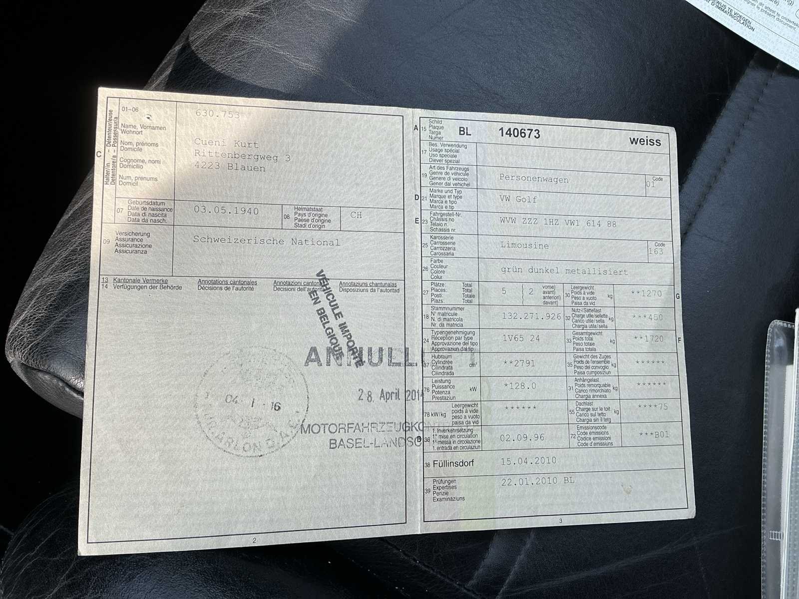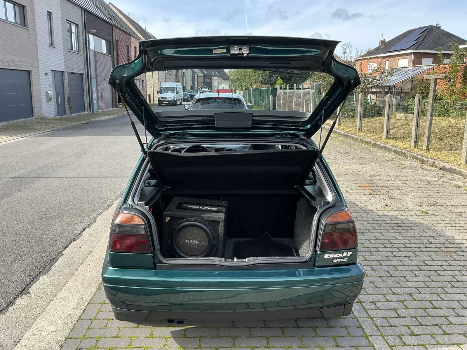 Volkswagen Golf VR6 uit 1996 met 223000 kilometer op de teller. Deze wagen is zowel binnen als buiten in goede staat. Motorisch geen problemen. Problemen met remleidingen, silent blocs en wiellagers werden opgelost. Klein beetje roestvorming aan de uitlaat. Kleine lakschade (zie foto’s). Klemmen omhulsel stuurhuis afgebroken (zie foto). Wagen werd nog nooit ingeschreven in België maar alle documenten zijn aanwezig. Nee Merk: Volkswagen Model: Golf Type: VR6 Bouwjaar: 1996 Afgelezen kilometerstand: 223713km Cilinderinhoud: 2791cc Vermogen (kW): 128kW Brandstof: benzine Chassisnummer: WVWZZZ1HZVW161488 Datum eerste toelating: 02/09/1996 Aantal zitplaatsen: 5 Kleur: Groen Transmissie: Handgeschakeld Aantal deuren: 5 Leder bekleed: true