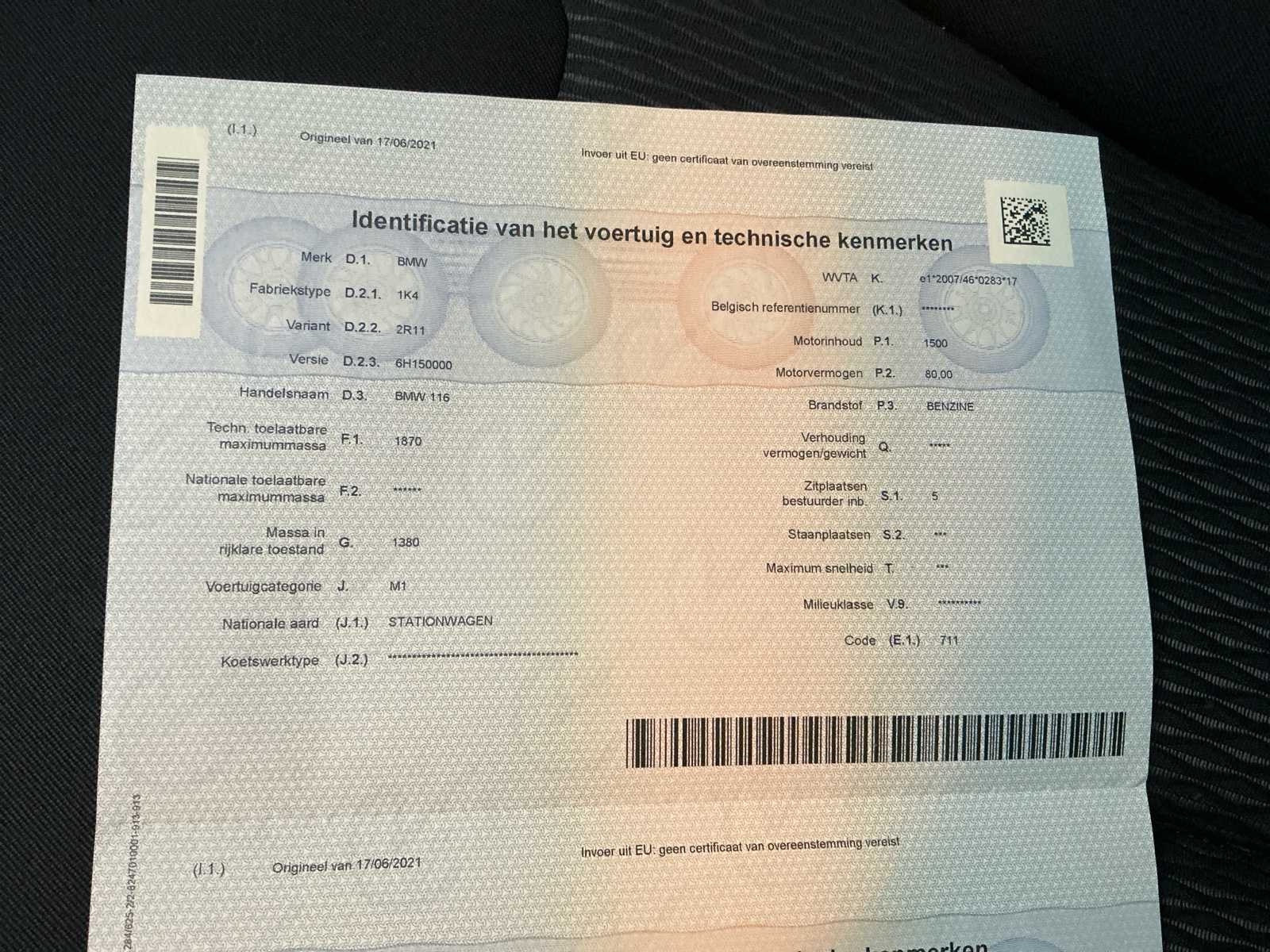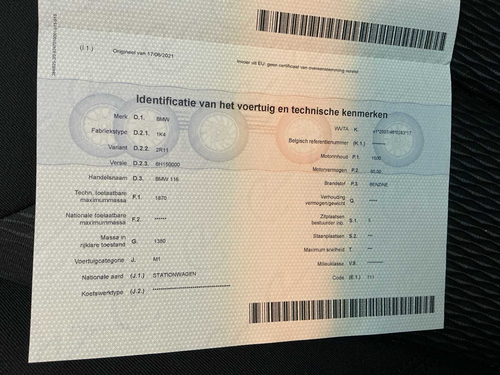 In volledig werkende staat. Kleine carrosserie schade. No Merk: BMW Model: 116i Bouwjaar: 2017 Afgelezen kilometerstand: 83873km Cilinderinhoud: 1500cc Vermogen (kW): 80kW Brandstof: Benzine Chassisnummer: WBA2R110905D66982 Datum eerste toelating: 14/12/2017 Aantal zitplaatsen: 5 Kleur: Zwart Transmissie: Manueel Emissieklasse: Euro 6b Aantal deuren: 5 Nationaliteit documenten: België Gelijkvormigheidsattest aanwezig: true Start en rijdt: Ja Vavato voert geen technische keuring uit.: true Airconditioning: true Inschrijvingsbewijs - deel 1 : Ja Inschrijvingsbewijs - deel 2: Ja