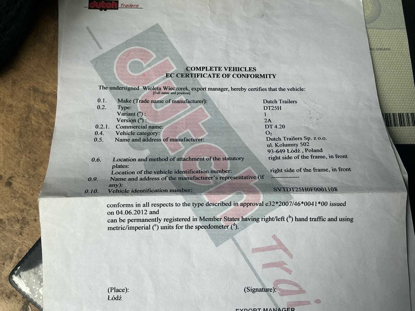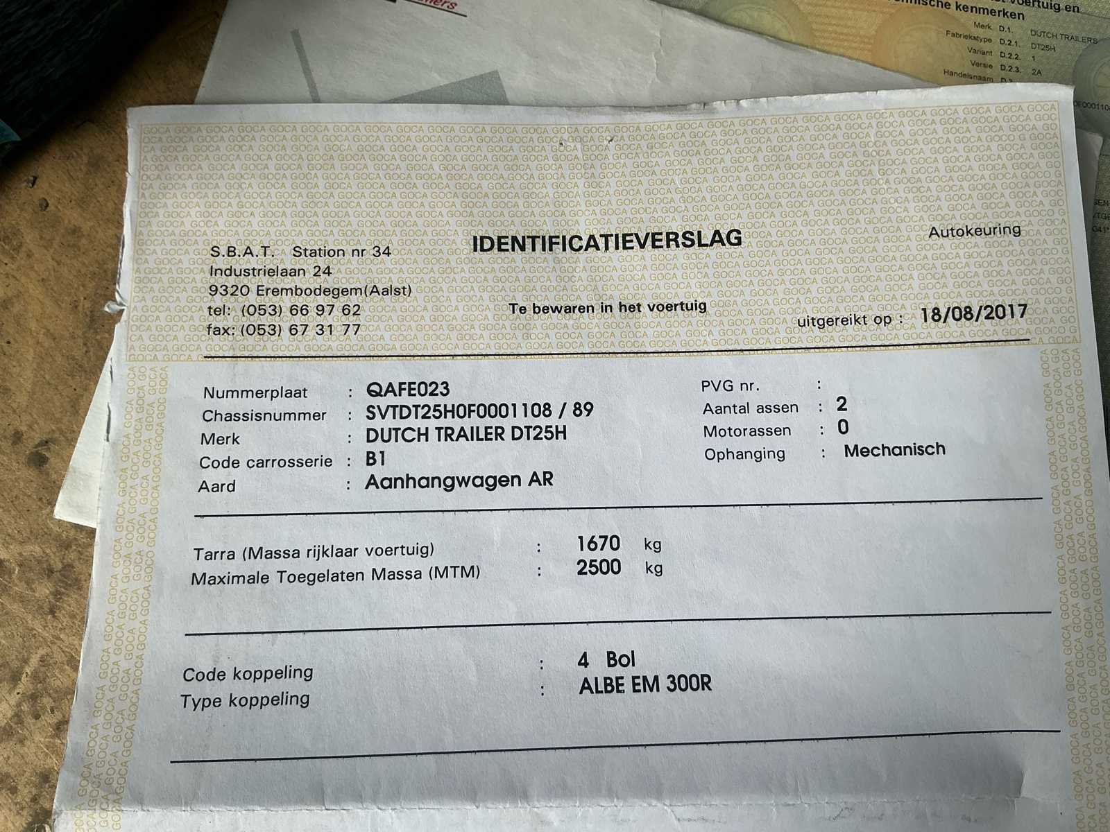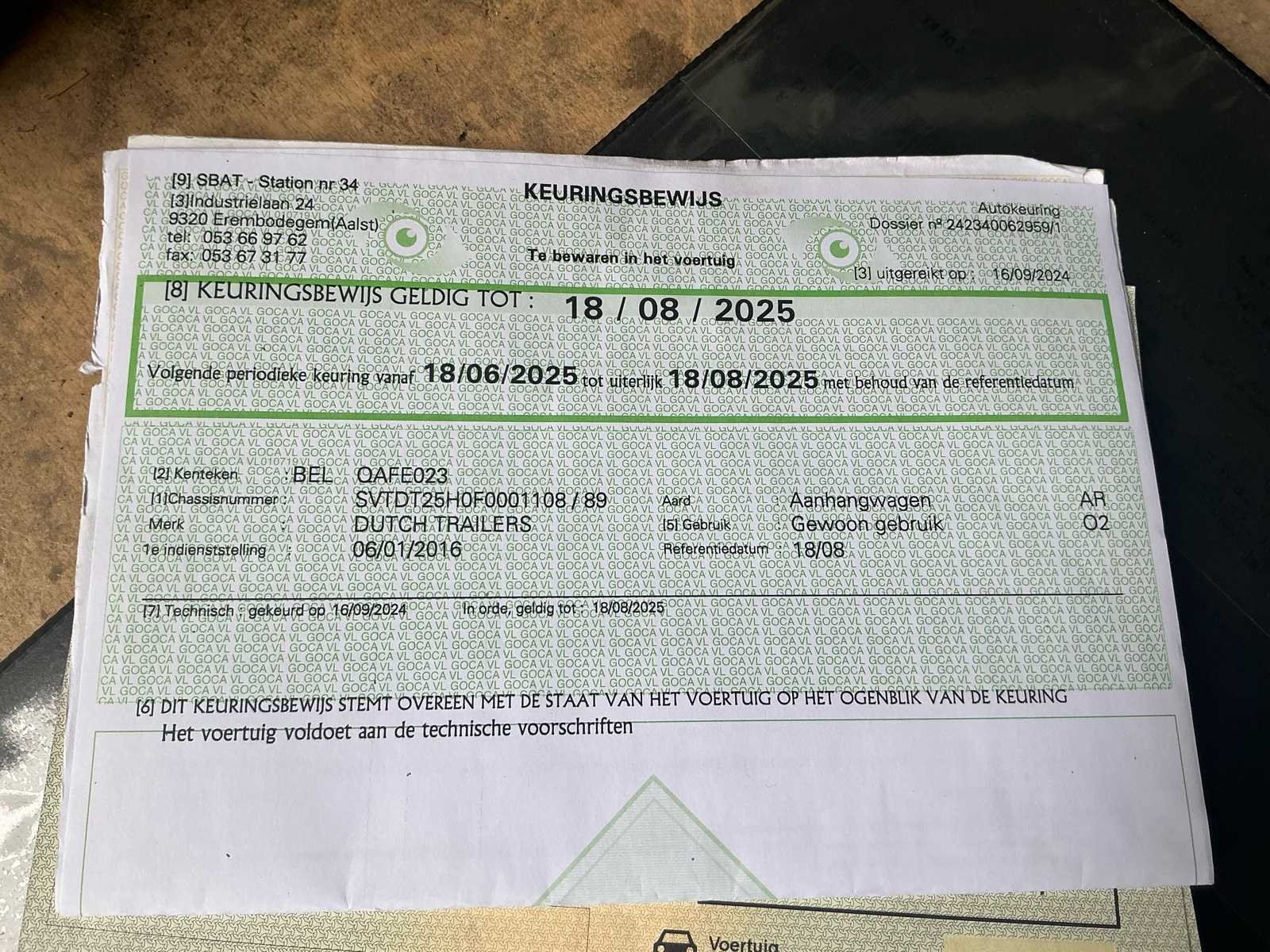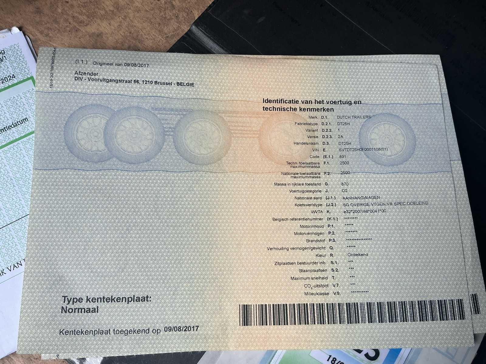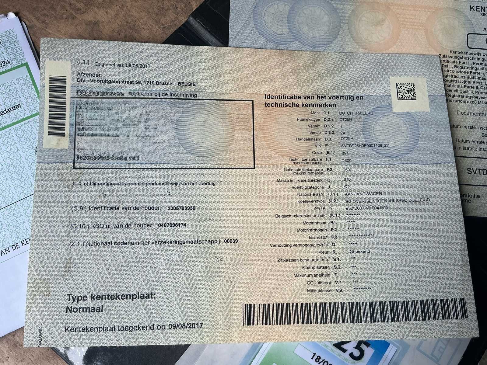 No Merk: Dutch Trailers Type: DT25H Bouwjaar: 2016 Chassisnummer: SVTDT25HOF0001108 Aantal assen: 2 Datum eerste toelating: 06/01/2026 Kenteken: Q-AFE 023 Kentekenpapieren compleet?: true Nationaliteit documenten: Belgische