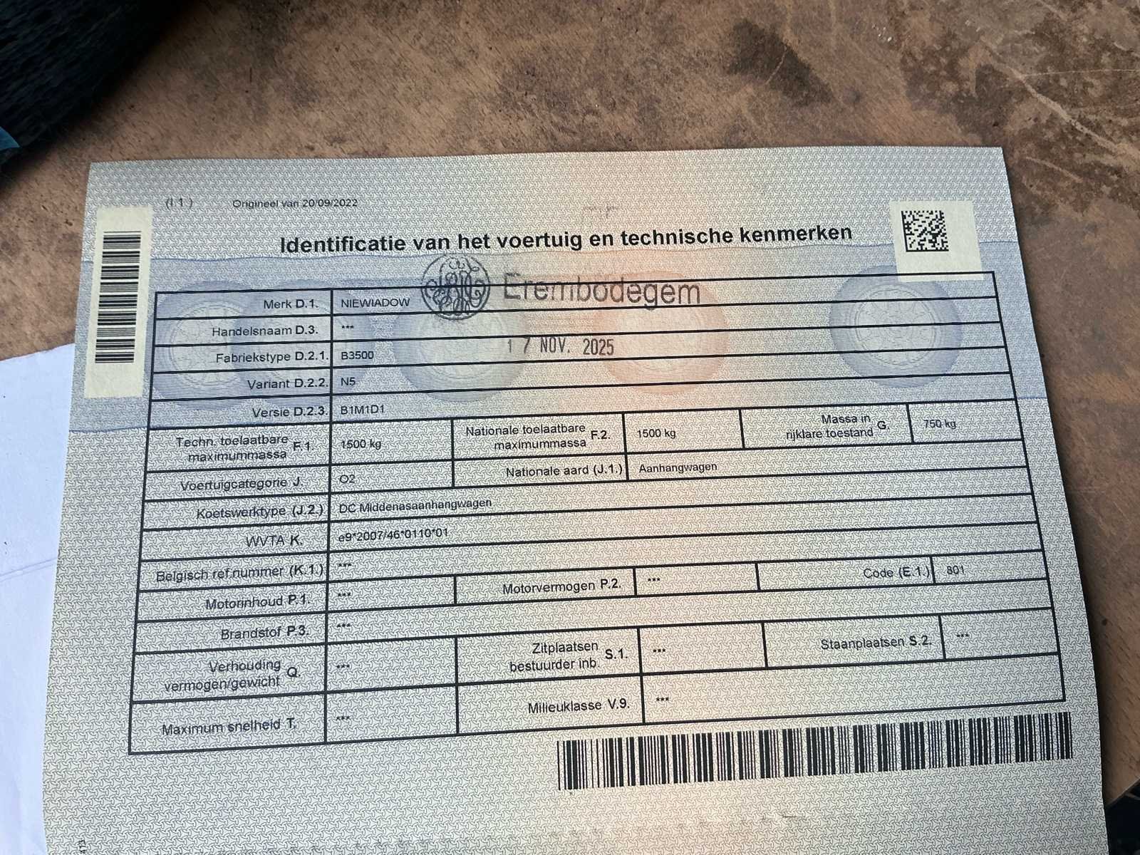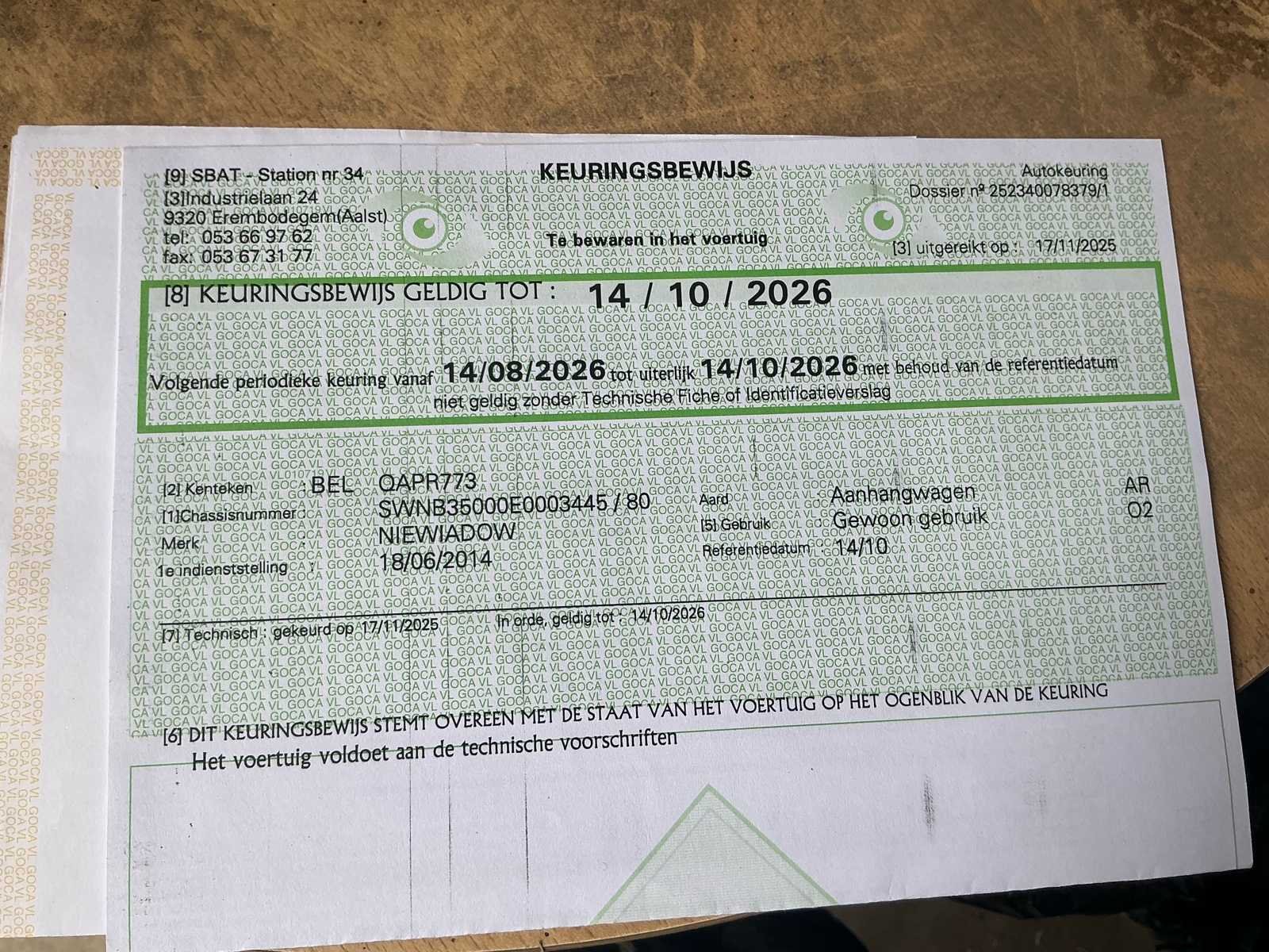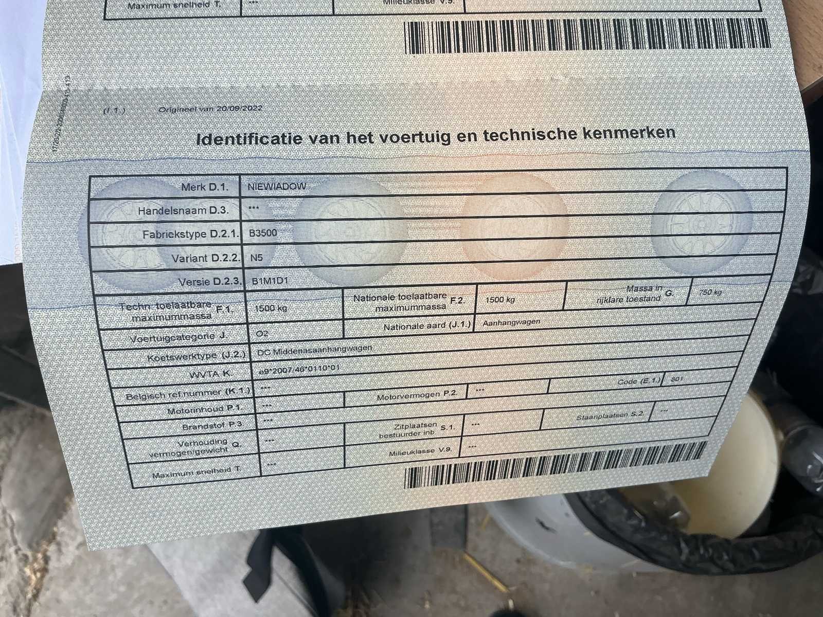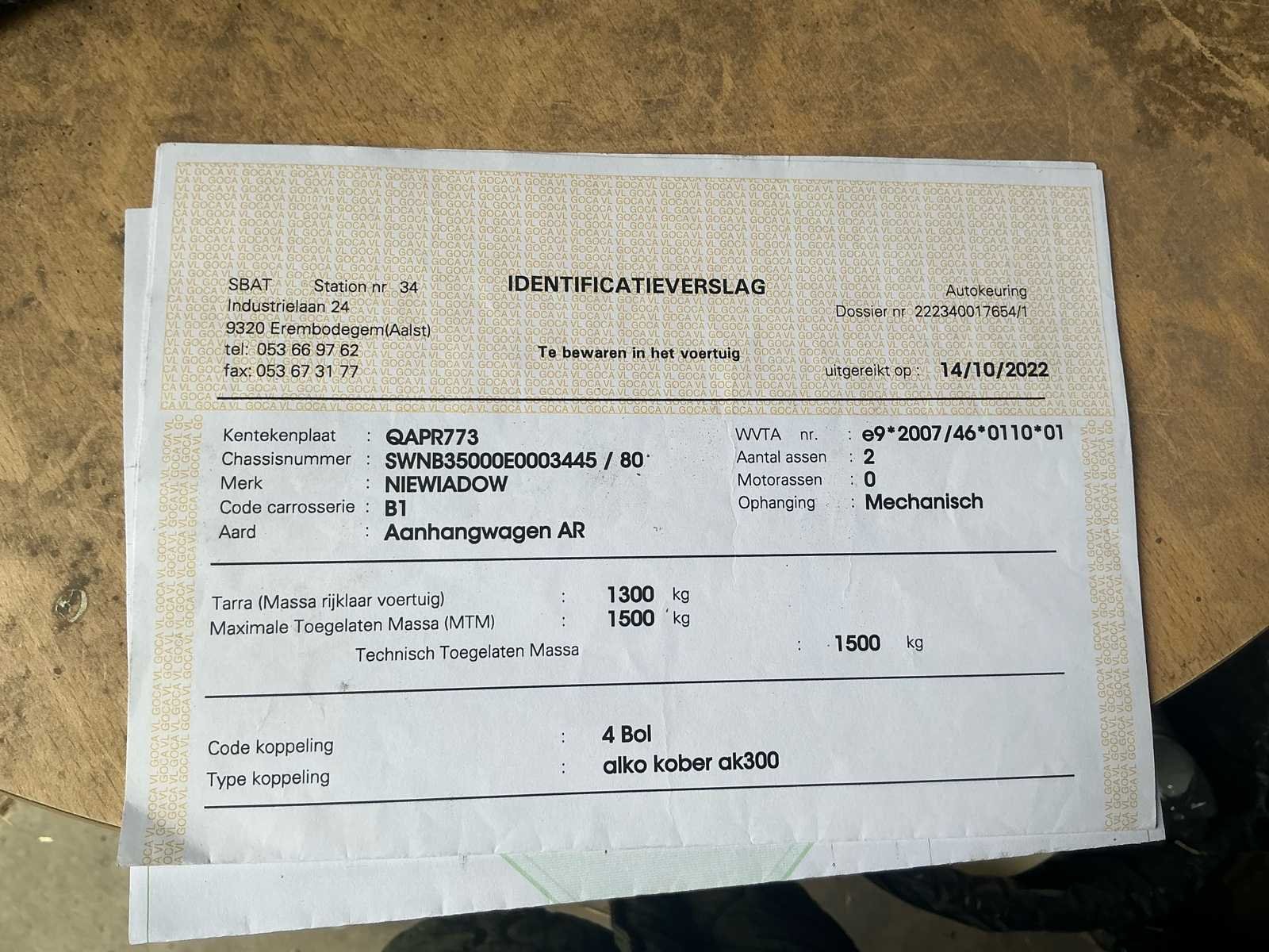 No Merk: Niewiadow Type: B3500 Chassisnummer: SWNB3500E0003445 Datum eerste toelating: 18/06/2014 Kenteken: QAPR773 Kentekenpapieren compleet?: true Nationaliteit documenten: Belgische