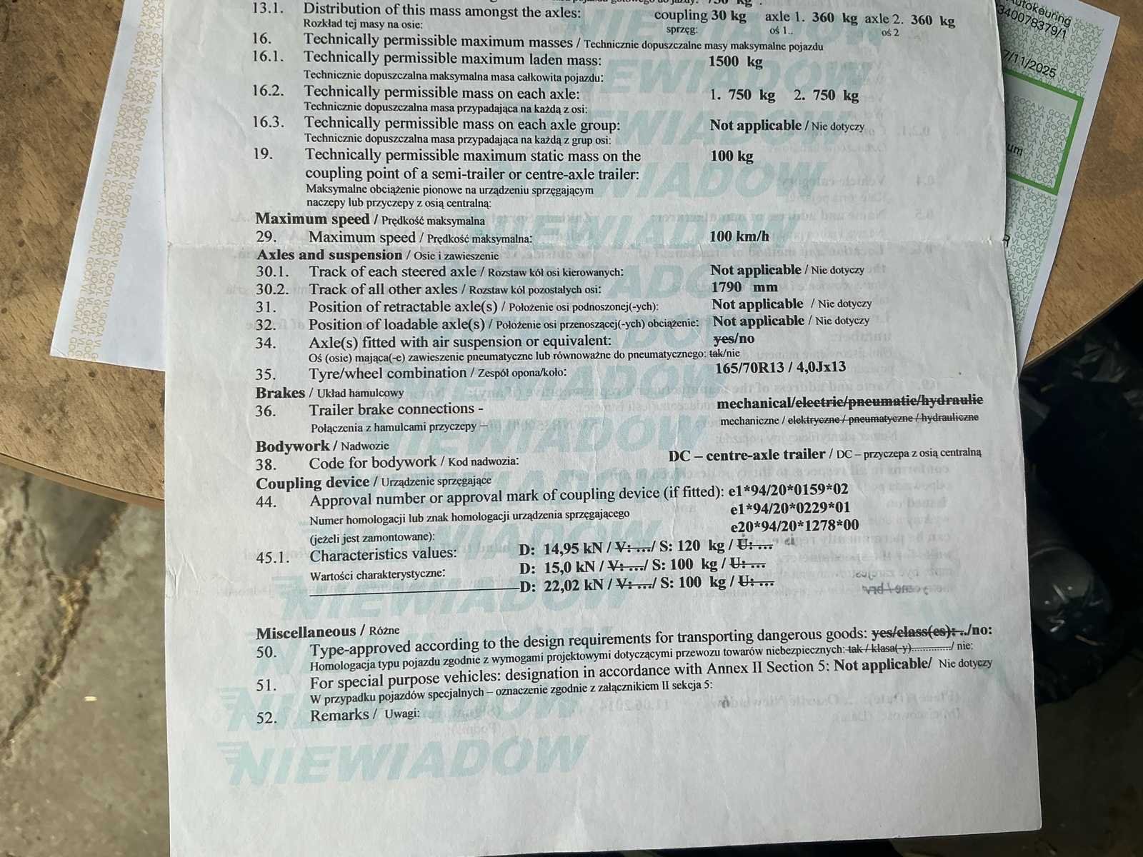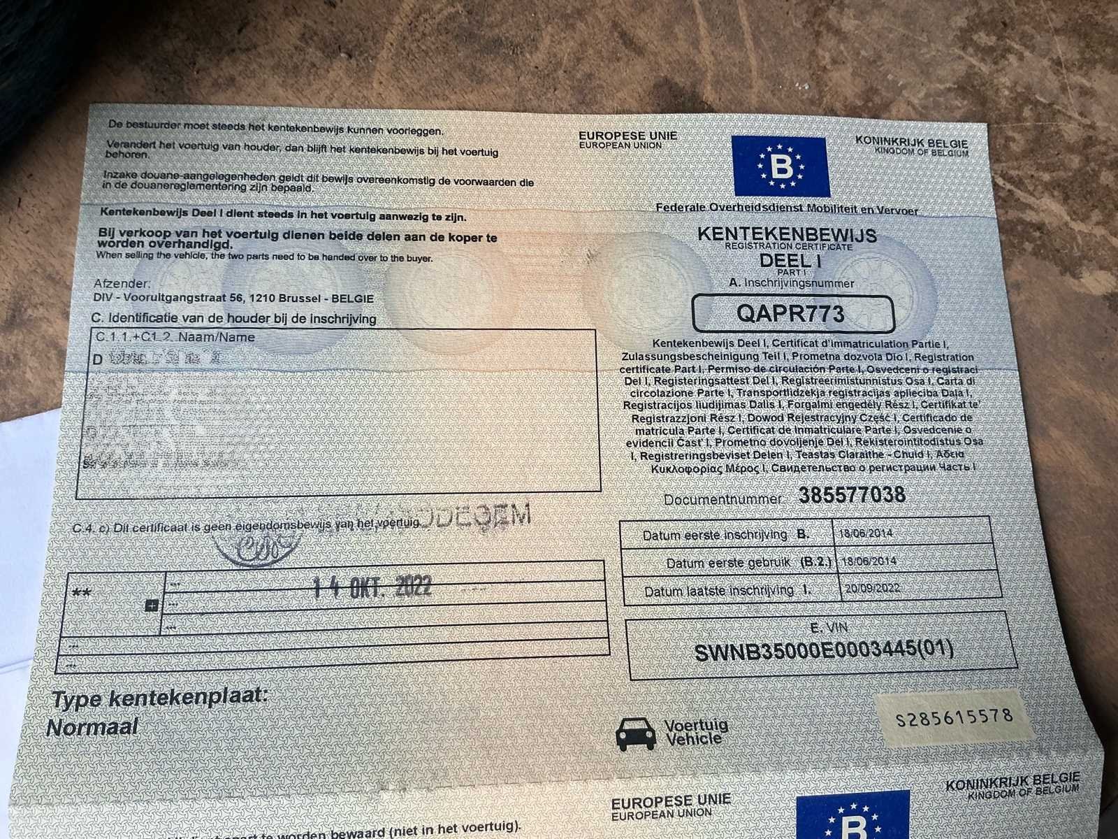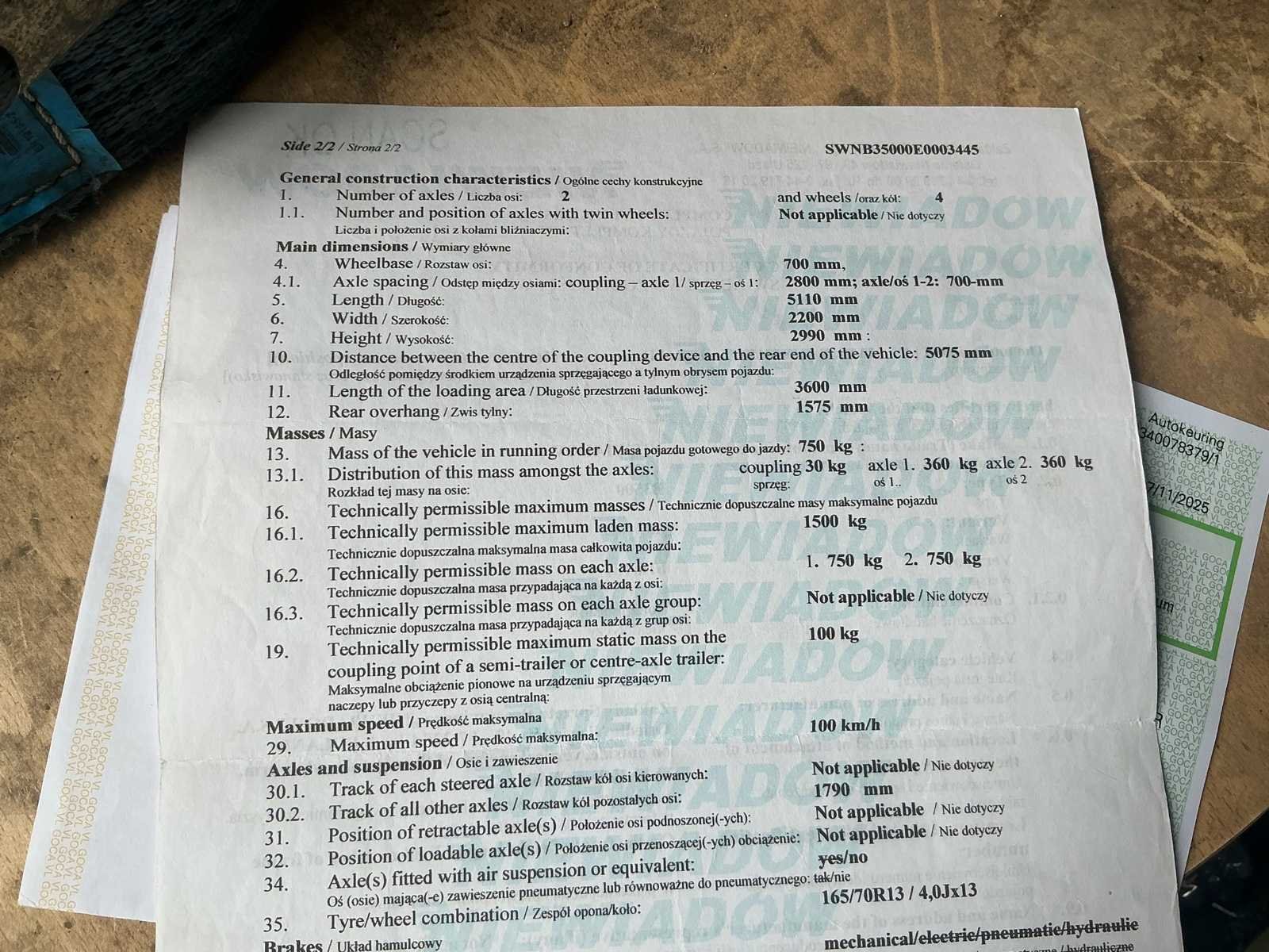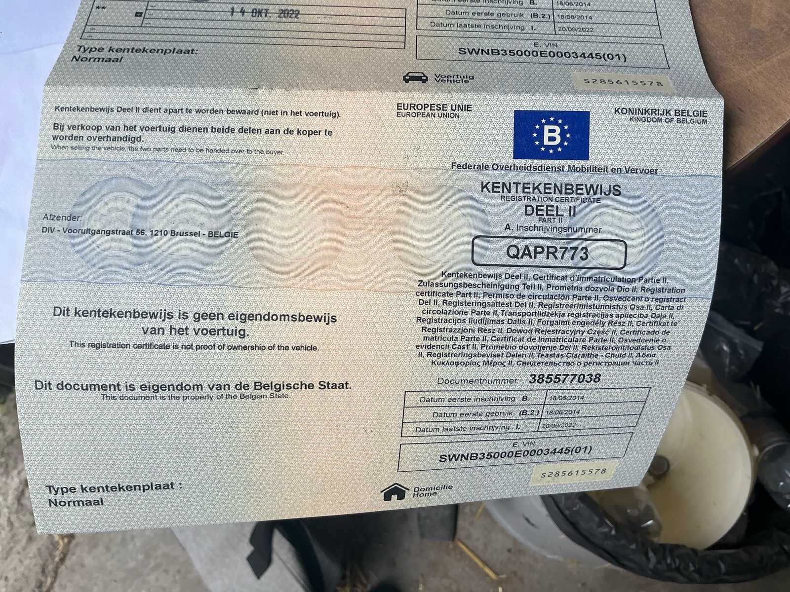 No Merk: Niewiadow Type: B3500 Chassisnummer: SWNB3500E0003445 Datum eerste toelating: 18/06/2014 Kenteken: QAPR773 Kentekenpapieren compleet?: true Nationaliteit documenten: Belgische