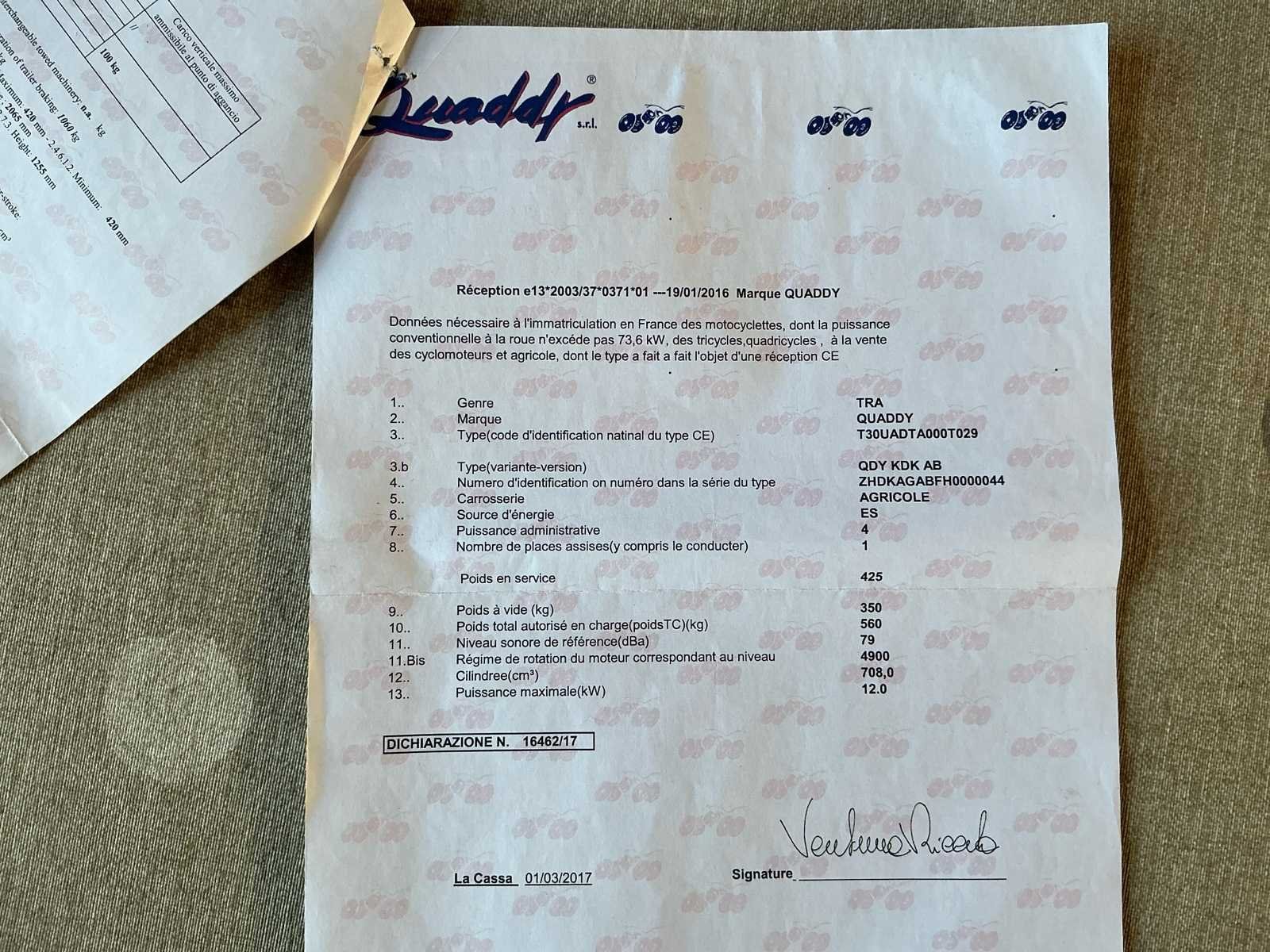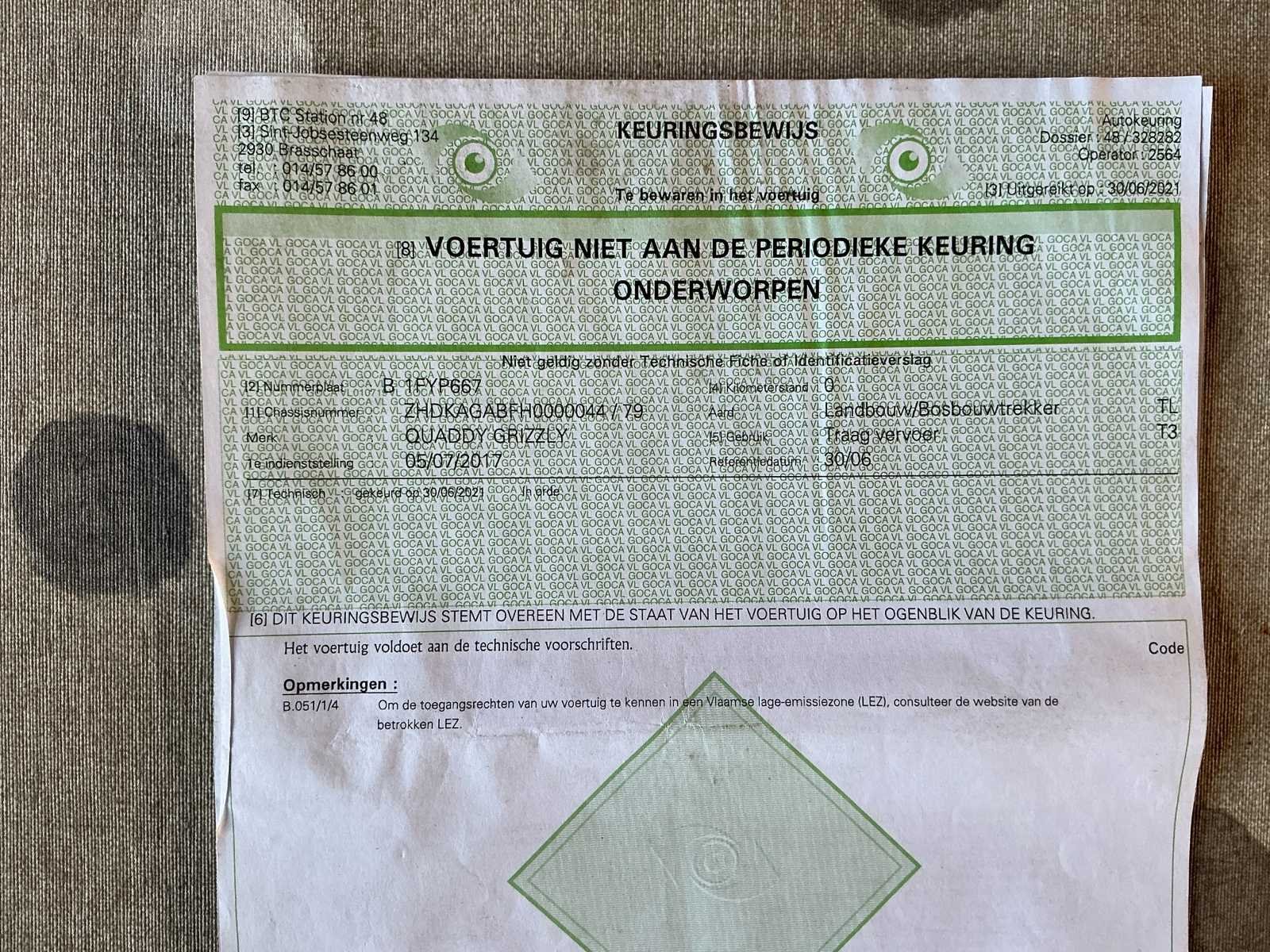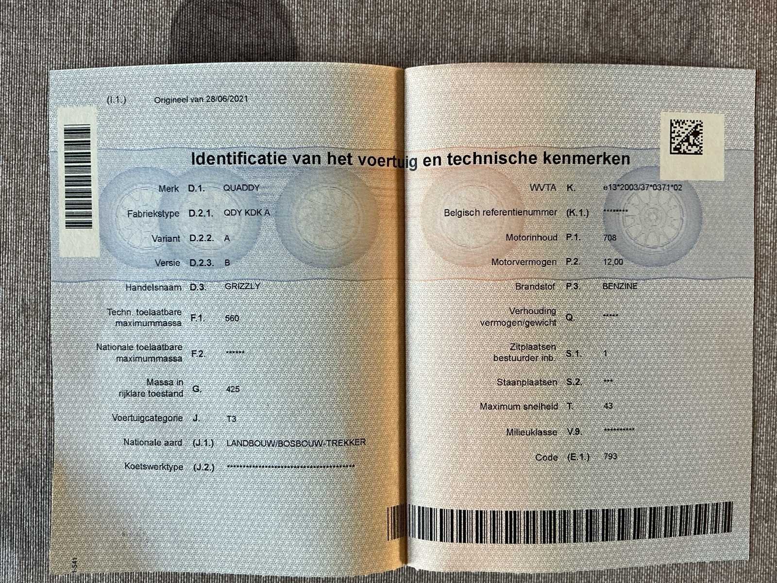 No Merk: Yamaha Model: Grizzly 700 Chassisnummer: ZHDKAGABFH0000044 Aantal sleutels: 1 Datum eerste toelating: 05/07/2017 Bouwjaar: 2016 Afgelezen kilometerstand: 9471km Vermogen (kW): 12kW Cilinderinhoud: 708cc Brandstof: Benzine Kleur: Zwart