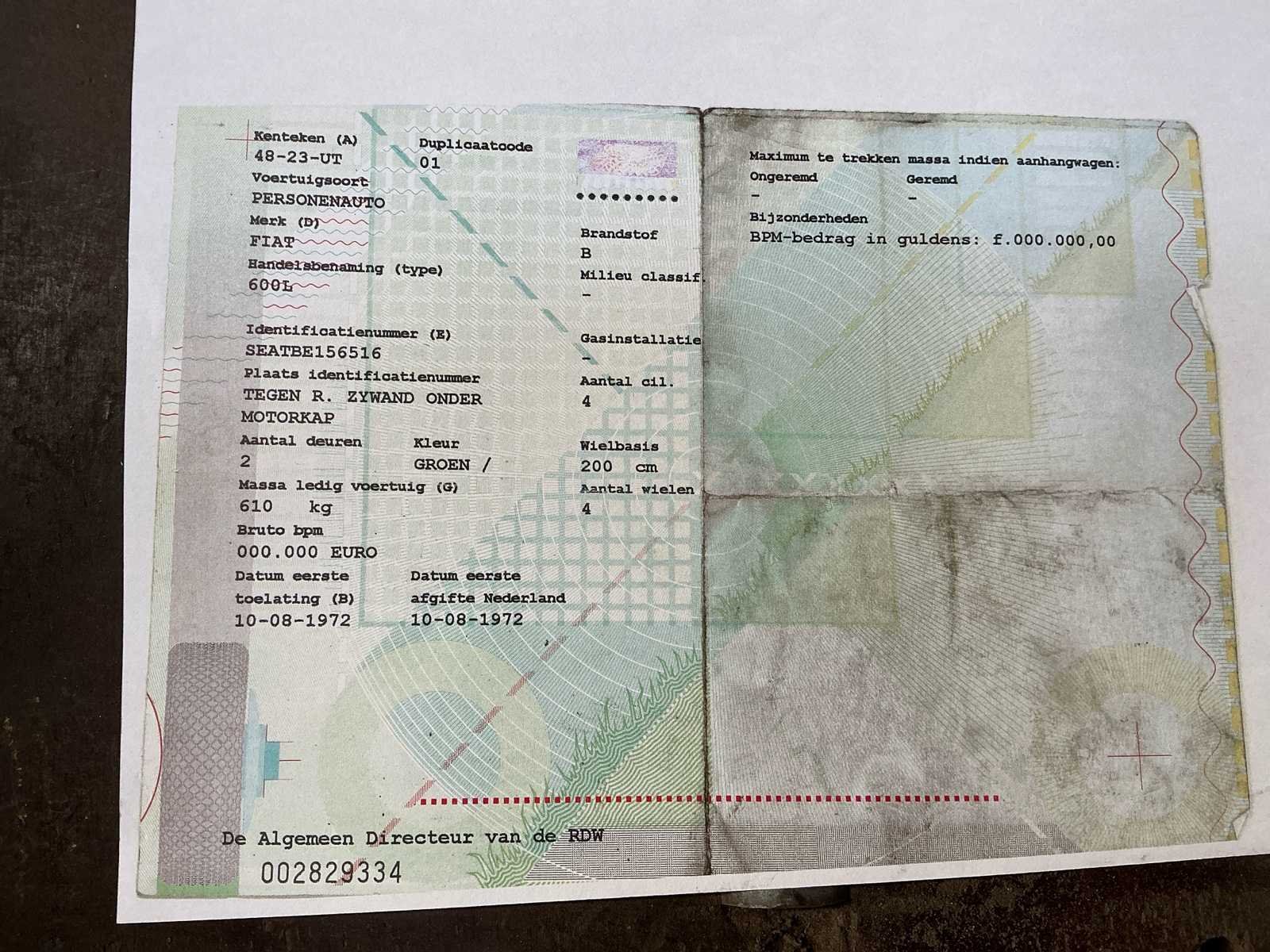 Na te kijken voor opstart. Opgelet, deze auto zal niet worden gekeurd voor verkoop (van toepassing op Belgische particuliere kopers). Nee Merk: Fiat Type: 600L Bouwjaar: 1972 Chassisnummer: SEAT BE 156516 Afgelezen kilometerstand: 74458 Brandstof: Benzine Nationaliteit documenten: Nederlands Startinformatie: Niet gekend.