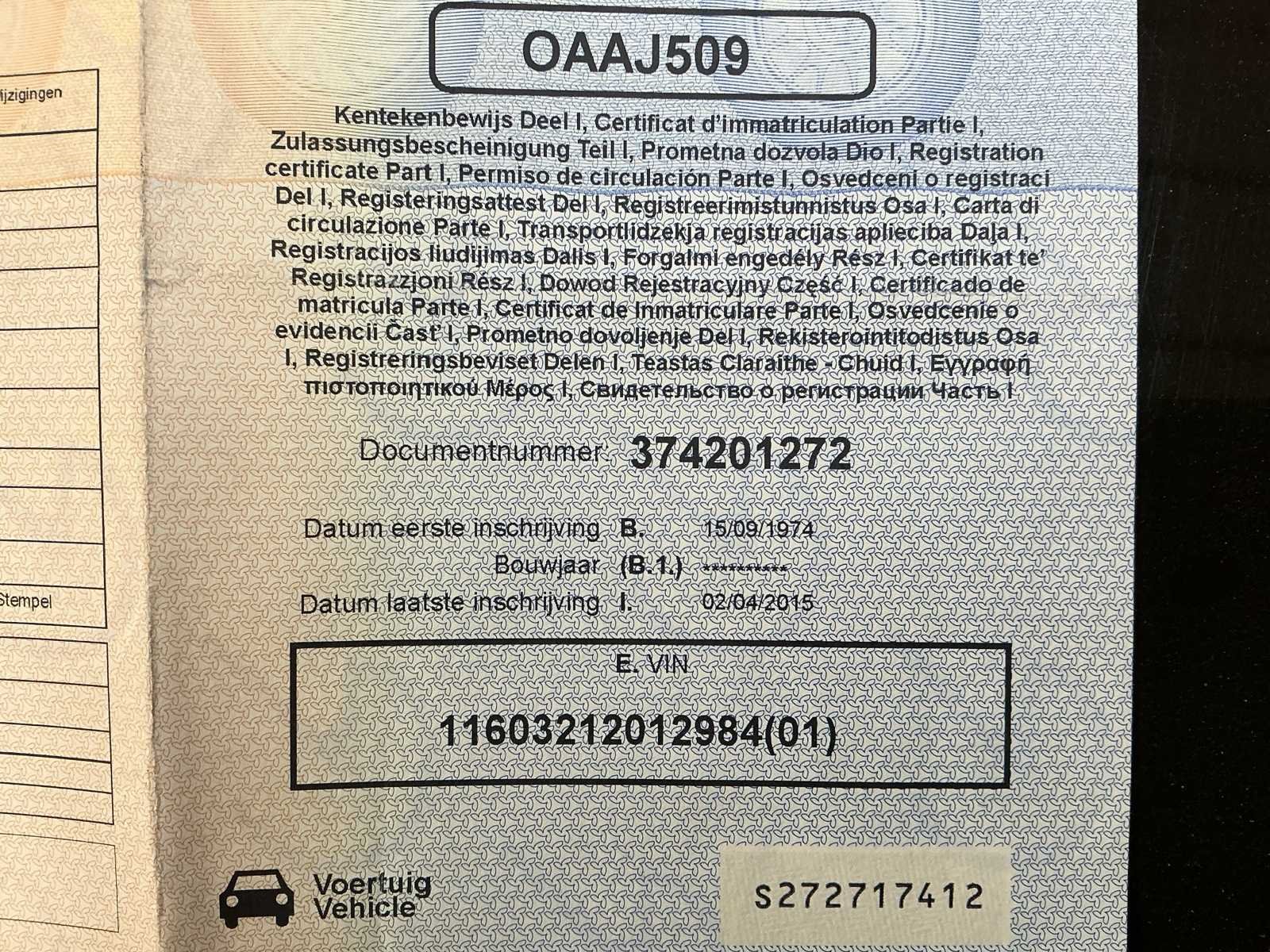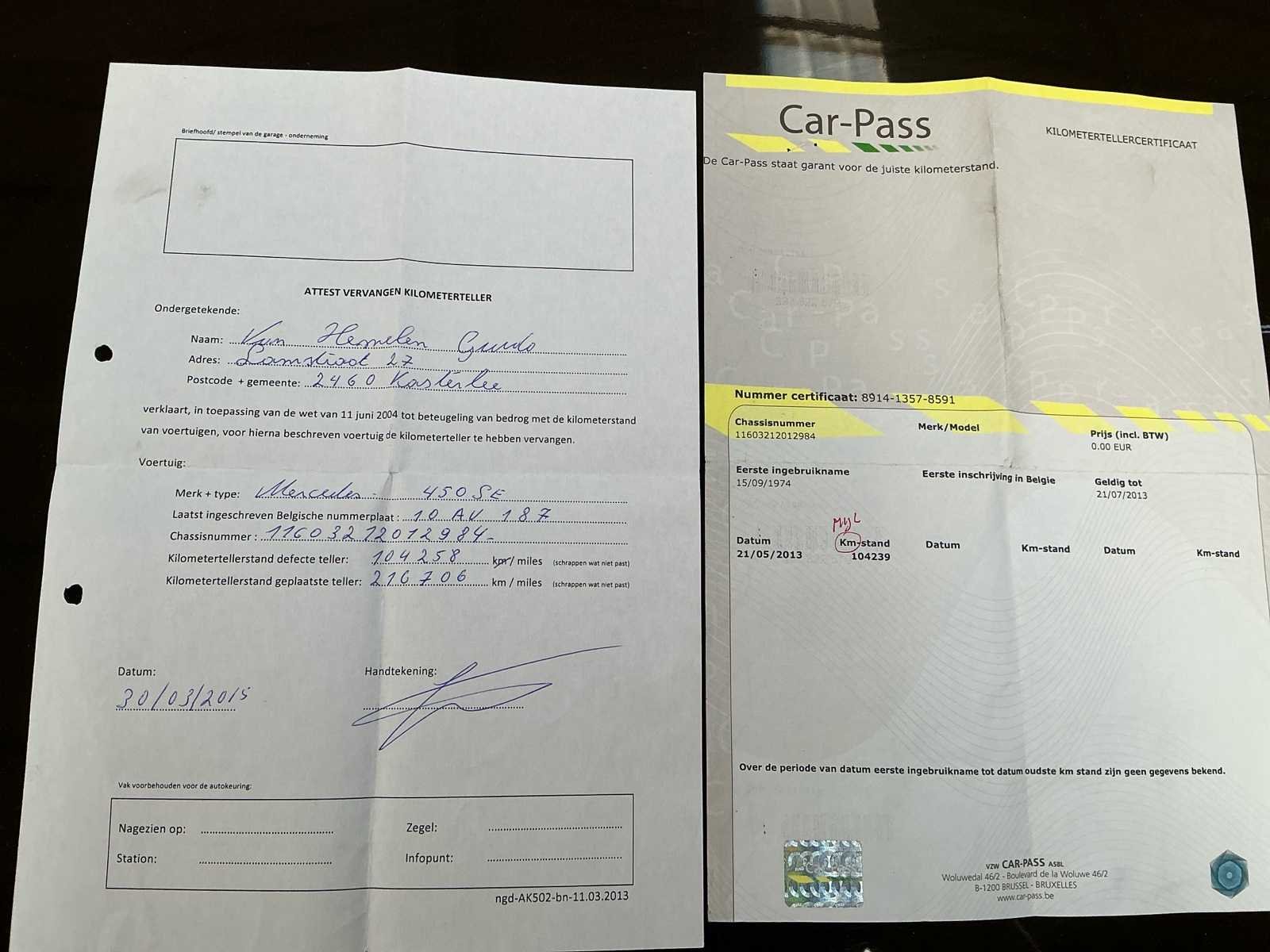 Niet opgestart. Batterij mankeert! De kilometerteller van deze Mercedes 450 SE werd officieel vervangen op 20/03/2015. De defecte teller stond toen op 104.258 km en de nieuwe teller werd geplaatst met een stand van 216.706 km. Met de huidige tellerstand van 217.262 km komt de werkelijke kilometerstand uit op ongeveer 104.800 km. Documenten ter inzage aanwezig. Opgelet, deze auto zal niet worden gekeurd voor verkoop (van toepassing op Belgische particuliere kopers). Nee Merk: Mercedes Type: 450SE Bouwjaar: 1974 Chassisnummer: 11603212012984 Afgelezen kilometerstand: 104814 Brandstof: Benzine Nationaliteit documenten: Belgisch Kentekenpapieren compleet?: true Startinformatie: Niet opgestart. Inschrijvingsbewijs - deel 1 : Aanwezig Inschrijvingsbewijs - deel 2: Aanwezig