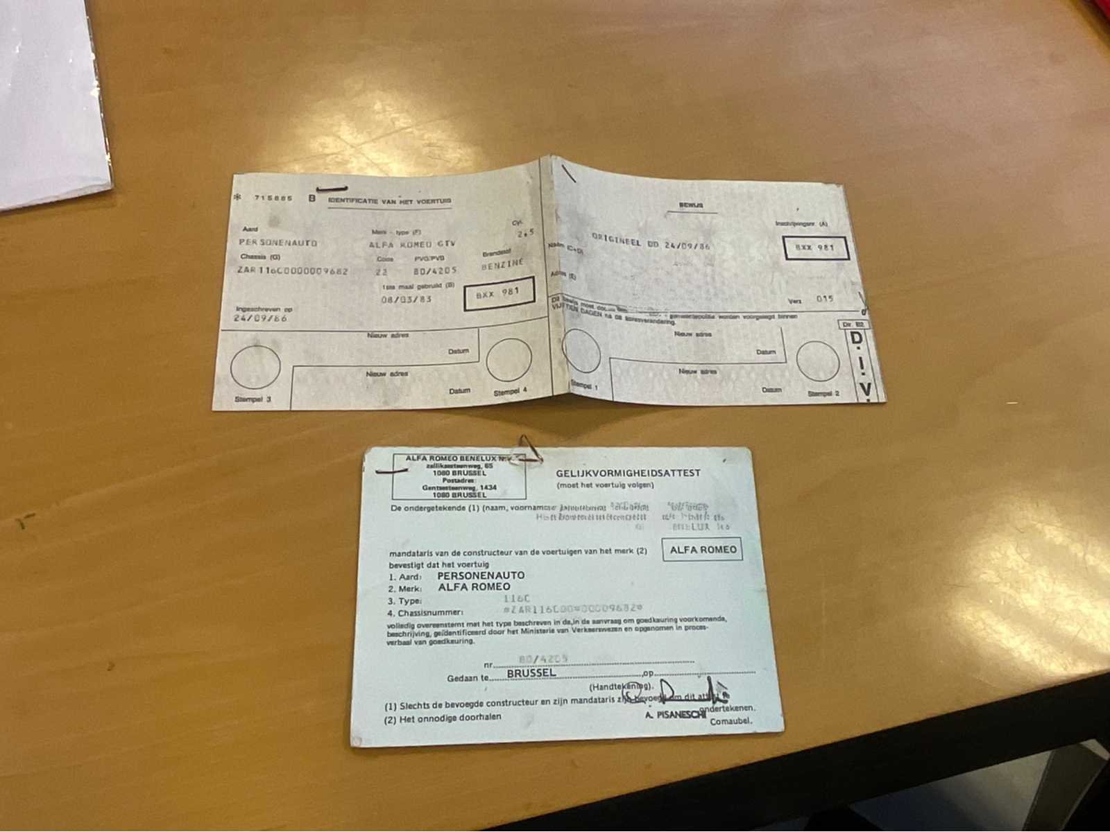 Alfa Romeo GTV6 2.5 uitgerust met de beroemde Busso V6-motor, gepresenteerd in een vintage dealerkleurstelling in de kleuren van Alfa Romeo – Verdeler (België). Dit voertuig werd gebruikt als promotie-/pictureauto, wat het een unieke presentatie gaf, typisch voor de jaren 80. De carrosserie is afgewerkt in wit en groen, met S.V.M.- en Alfa Romeo-markeringen, in een correcte stijl uit die periode, trouw aan de Alfa-esthetiek van die tijd. Het geheel biedt een sterke visuele aanwezigheid terwijl het een mechanische configuratie behoudt die overeenkomt met het origineel. Algemene staat Het voertuig is in goede staat van onderhoud. Interieur: zeer goed bewaard gebleven bruin/beige bekleding, voor- en achterstoelen in goede staat, dashboard zonder zichtbare scheuren, bekleding en tapijt die passen bij de leeftijd van het voertuig. Buitenkant: Goed uitgevoerde lak met lichte tekenen van normaal gebruik voor een voertuig van deze leeftijd. Correcte uitlijningen, nette presentatie. Mechanica: originele 2,5 V6 motor, schoon motorcompartiment met een compliant patina. Voertuig niet voorbereid op de wedstrijd. Uitrusting: handgeschakelde versnellingsbak, Veglia-instrumentatie, "telefoon"-achtige wielen. Technische informatie Merk: Alfa Romeo Model: GTV6 2.5 Type: 116C Motor: 2,5-liter V6 (Busso) Transmissie: Handgeschakeld Brandstof: Benzine Jaar: 1984 Kilometerstand: ca. 40.200 km Chassisnummer (VIN): ZAR116C0000009682 Non Merk: Alfa Romeo Model: GTV6 2.5 Type: 116C Bouwjaar: 1984 Afgelezen kilometerstand: 40200km Cilinderinhoud: 2492cc Vermogen (kW): 118kW Brandstof: Benzine Chassisnummer: ZAR116C0000009682 Datum eerste toelating: 1984 Vermogen (pk): 160hp Aandrijving: Links Aantal zitplaatsen: 4 Kleur: Witgroen Transmissie: Handgeschakeld Aantal deuren: 2 Aantal sleutels: 1 Nationaliteit documenten: België Vavato voert geen technische keuring uit.: waar