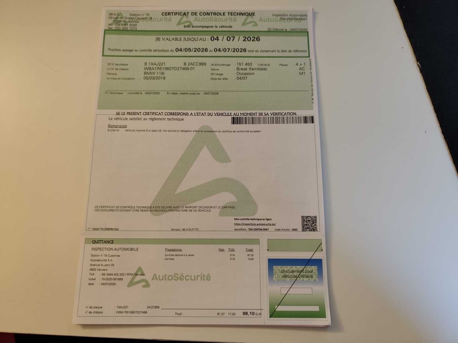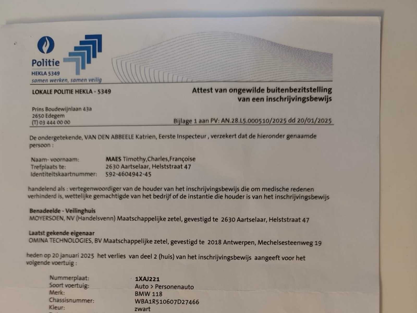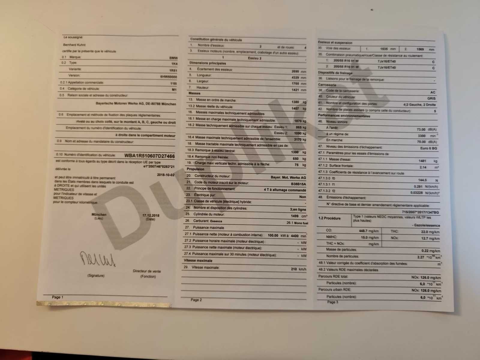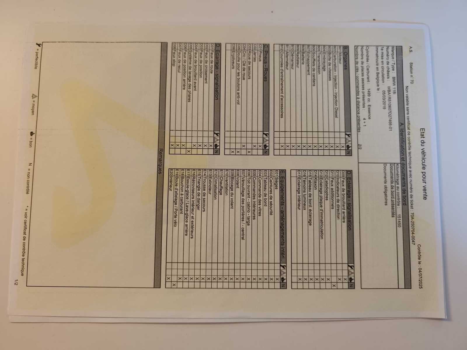 De wagen bevindt zich in goede staat, rijd en start. Aantal krassen aanwezig zie foto’s. OPGELET! Inschrijvingsbewijzen van de wagen zijn ontbrekend maar er is een attest verlies voorzien, de wagen heeft al een nieuw roos formulier (vervallen ondertussen). Opties: -Automatische airco. -Navigatie. -Bluetooth. -Cruise control. -Parkeersensoren achteraan. No Merk: Bmw Model: 118i hatchback Bouwjaar: 2019 Afgelezen kilometerstand: 151477km Cilinderinhoud: 1499cc Vermogen (kW): 100kW Brandstof: Benzine Chassisnummer: WBA1R510607D27466 Datum eerste toelating: 05/03/2019 Aantal zitplaatsen: 5 Kleur: Grijs Transmissie: Manueel Emissieklasse: Euro 6 Aantal deuren: 5 Aantal sleutels: 2 Gelijkvormigheidsattest aanwezig: true Vavato voert geen technische keuring uit.: true Airconditioning: true Navigatie: true Inschrijvingsbewijs - deel 1 : Afwezig Inschrijvingsbewijs - deel 2: Afwezig