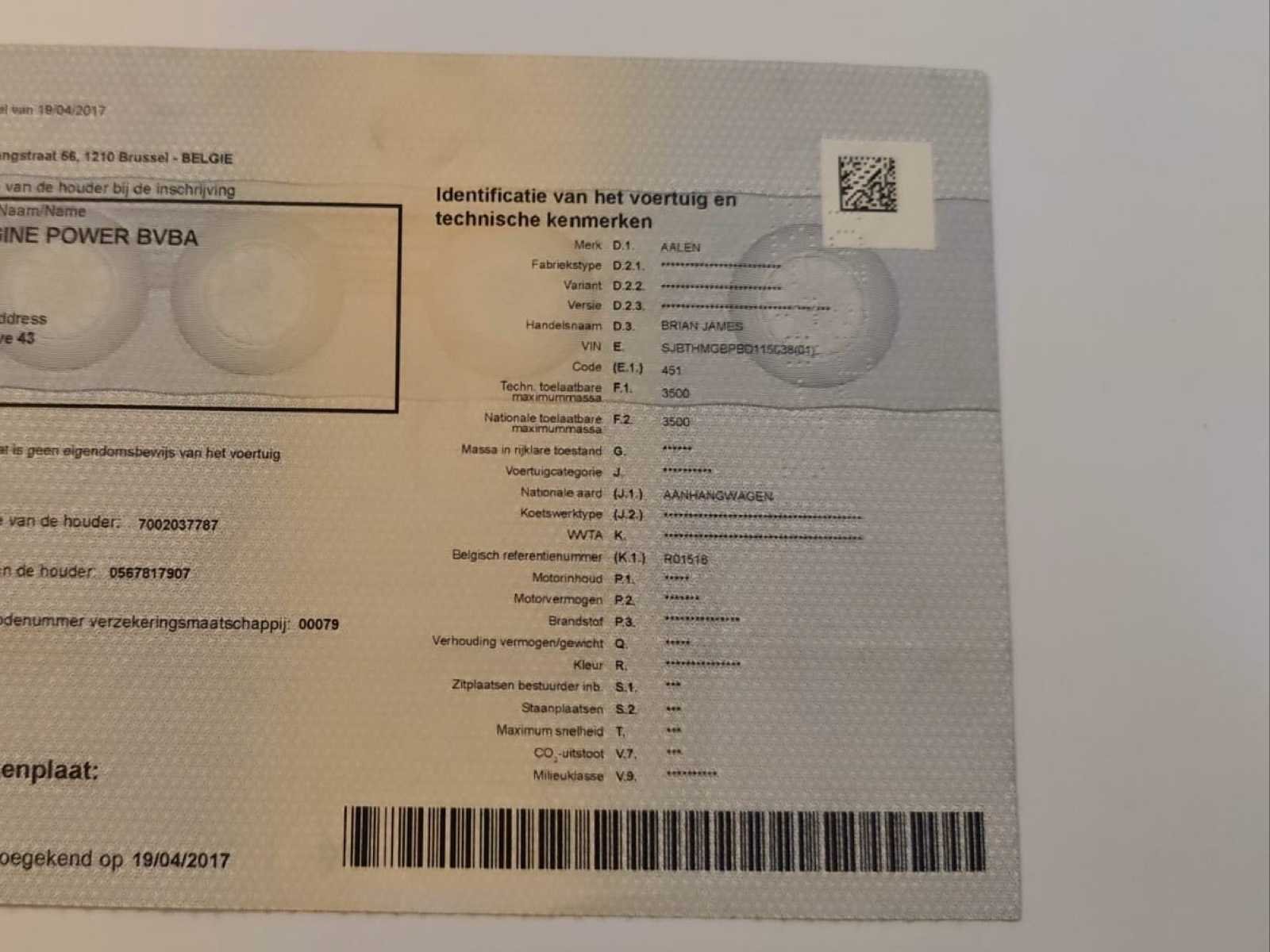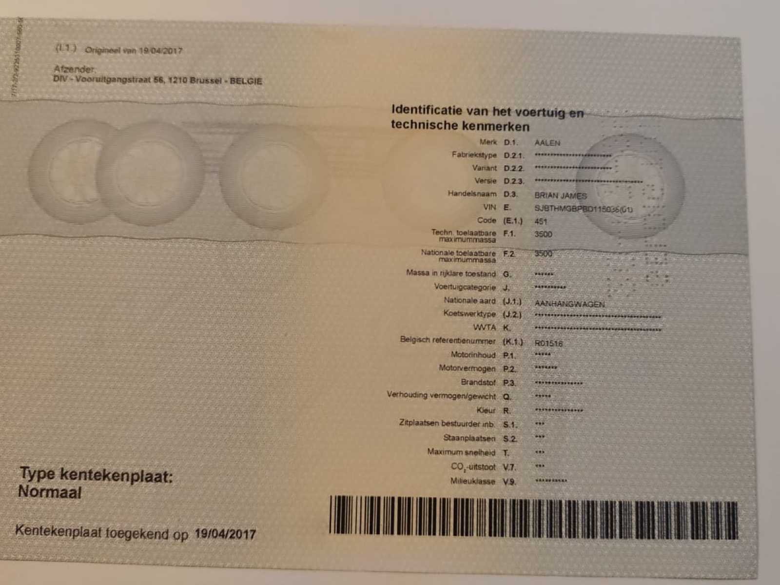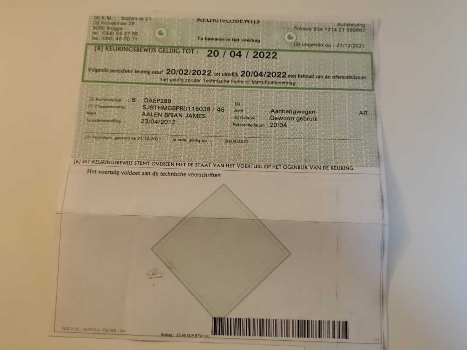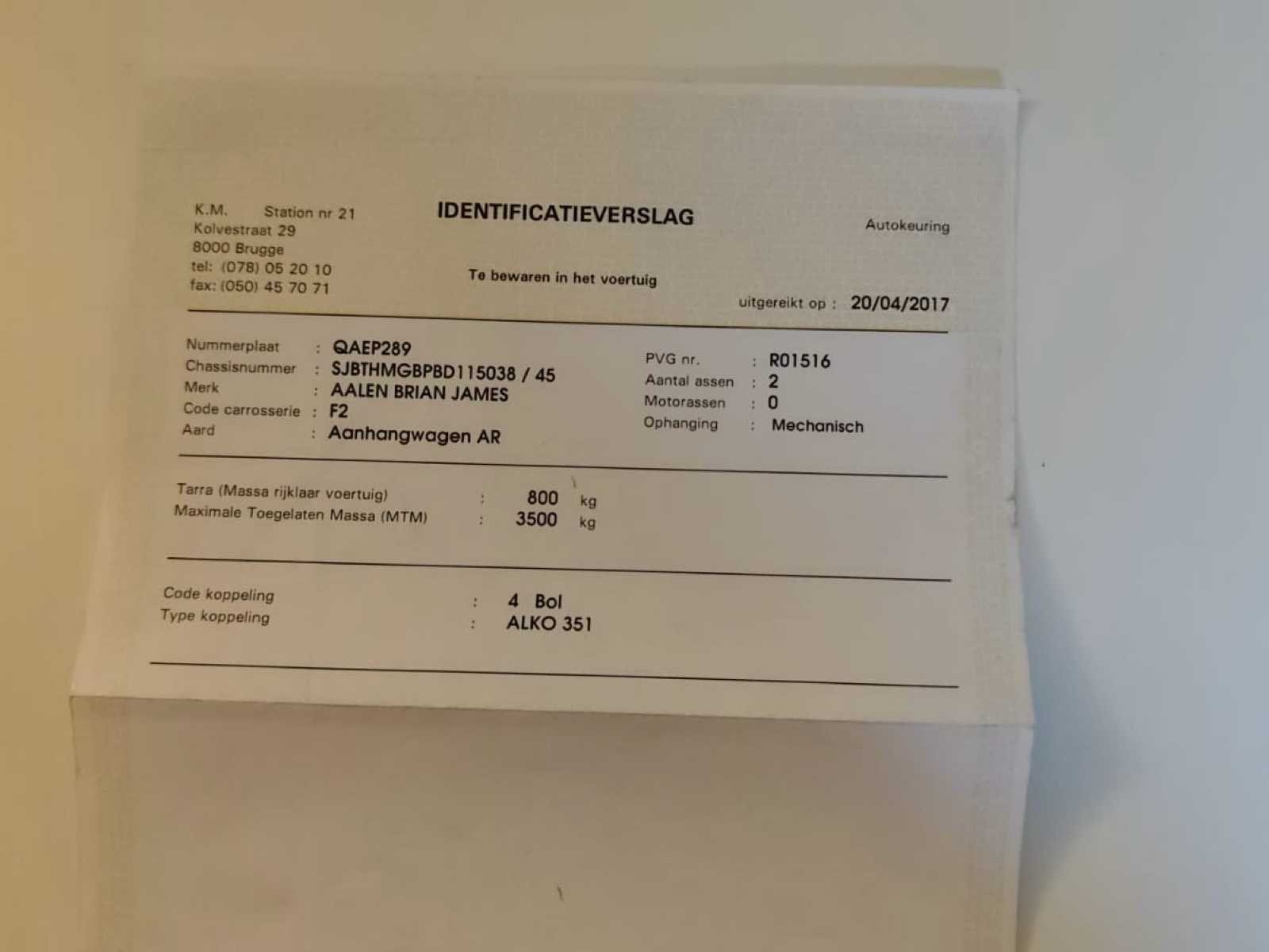 De aanhanger bevindt zich in gebruikte maar correcte staat. Remkabels recent vervangen. No Merk: Aalen Model: Brain James Bouwjaar: 2012 Chassisnummer: SJBTHMGBPBD115038 Aantal assen: 2 Laadbak afmeting l: 300cm Laadbak afmeting b: 160cm Ledig gewicht: 800kg Laadvermogen: 2700kg Datum eerste toelating: 23/04/2012 Lengte: 450cm Breedte: 210cm Nationaliteit documenten: Belgisch