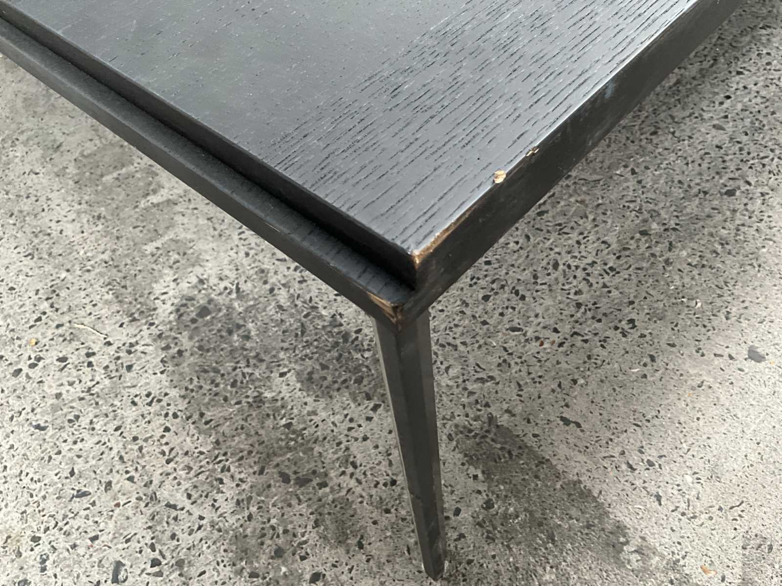 Voorzien van metalen onderstel en houten bovenblad voorzien van 2x lade, diverse hoeken licht beschadigd No Merk: Camerich Vorm: Vierkant Kleur: Zwart Lengte: 120cm Breedte: 120cm Hoogte: 41cm