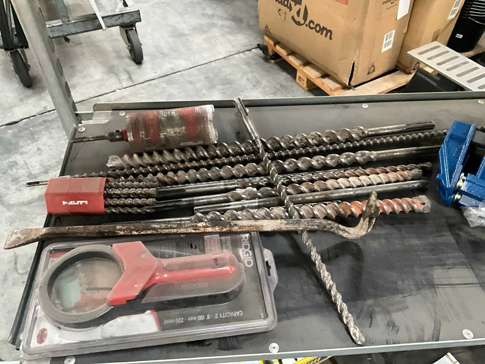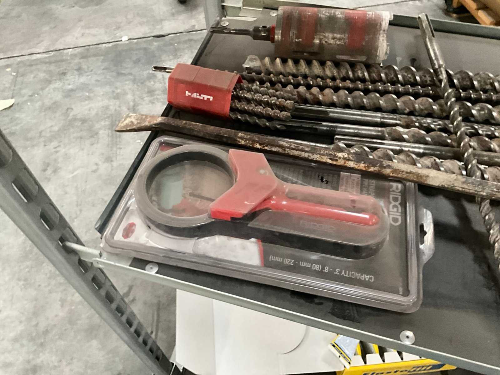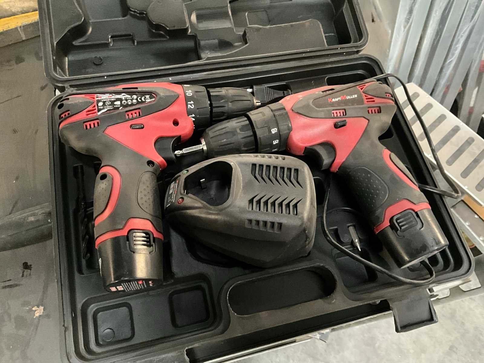 Waaronder 2x schroefboormachine KRAFTMULLER, 2x lijmtang, diverse boren, diverse waterpassen, 9x acrylaatkit ELASTOFIL, gereedschapstrolley STANLEY Nee