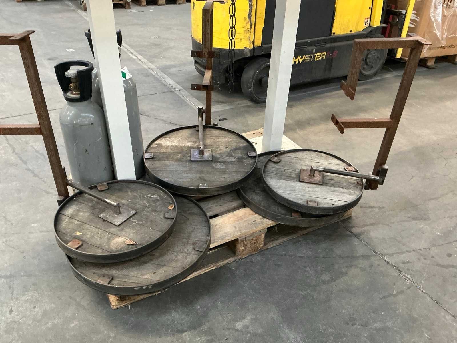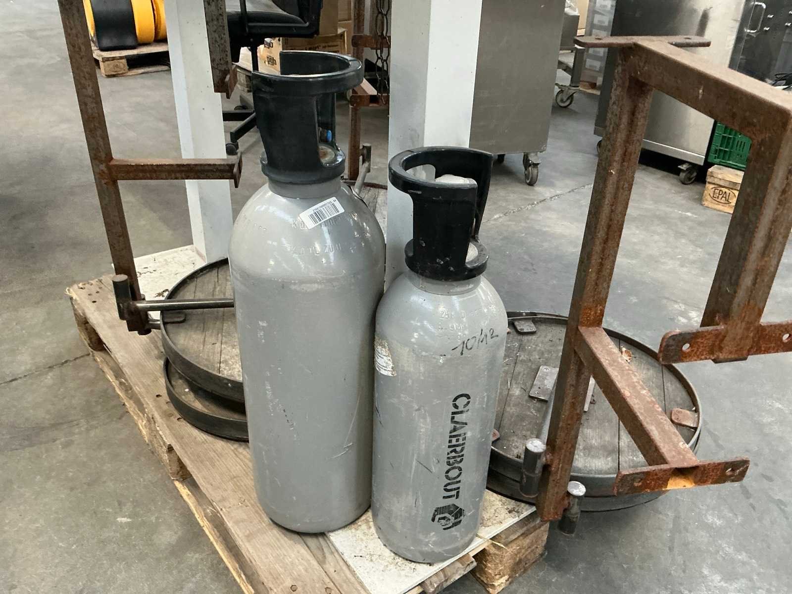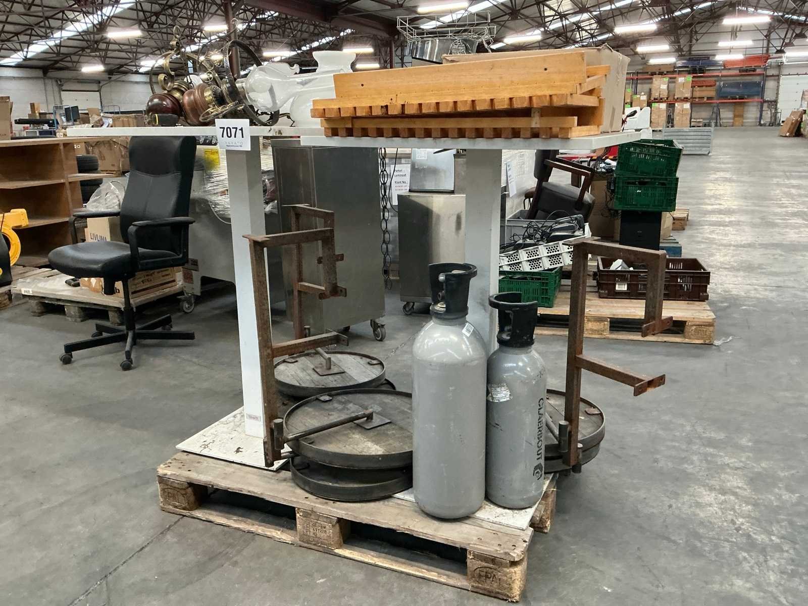 2 hoge metalen tafels TALENTI met afmeting circa 70 x 70 x 107 cm, 2 diverse koolzuurcilinders, 2 gedemonteerde hanglampen, 3 steunen elk voorzien van 2 tafeltjes, circa 12 theelichthouders No